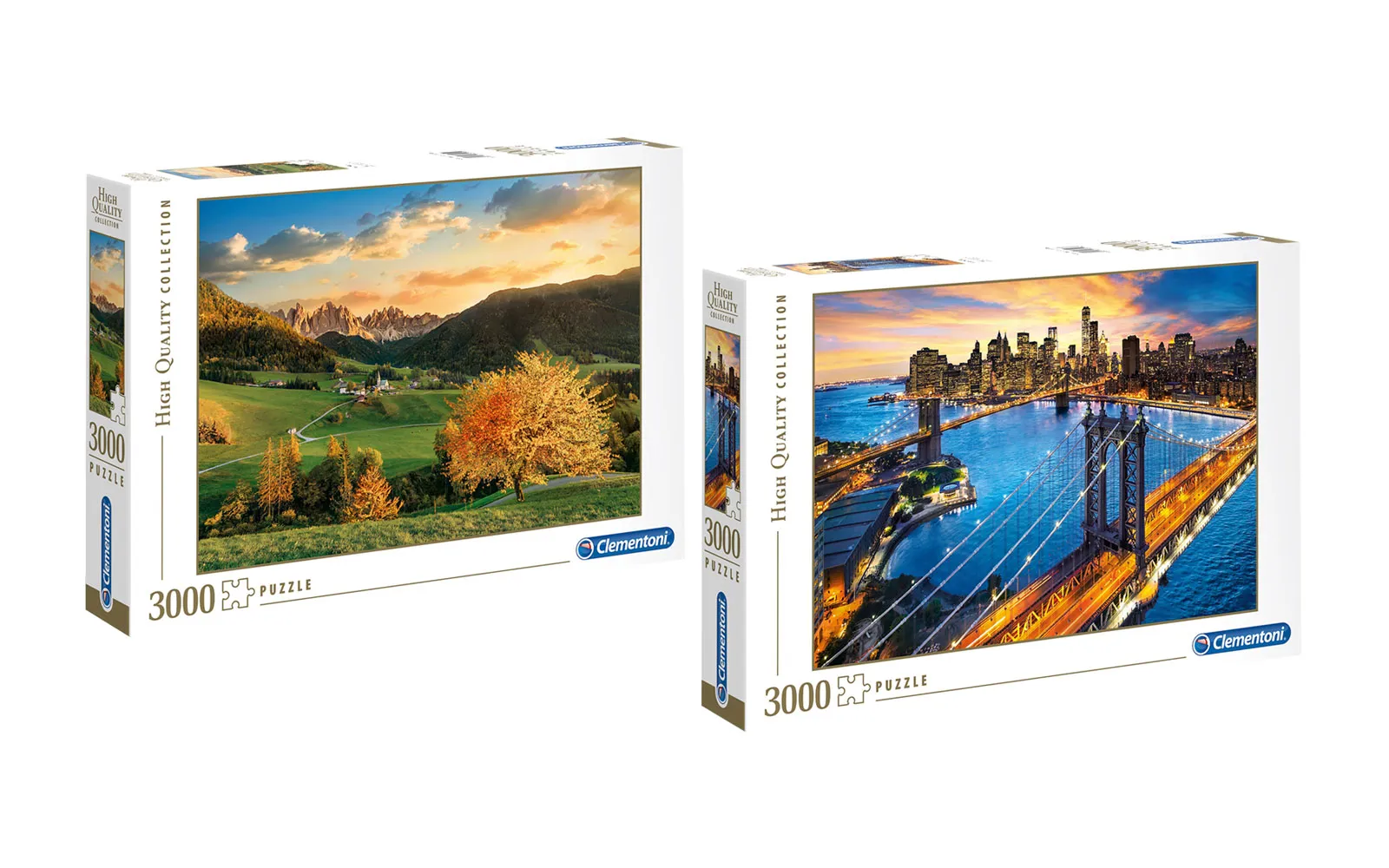 Sestavljanka s 3000 sestavnimi deli raznovrstnih motivov - pokrajina, potovanje, fantazija, umetnost, narejena iz visoko kvalietnih materialov, očarljivih podob, kvalitetnega tiska, precizno zarezanih robovo ter močnih materialov, ki dajejo sliki jasen videz. Clementoni uporablja reciklirane materiale in se izogiba uporabi komponent, ki onesnažujejo okolje.