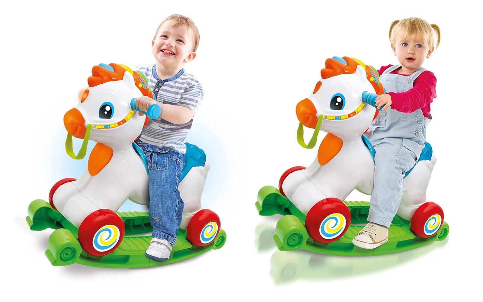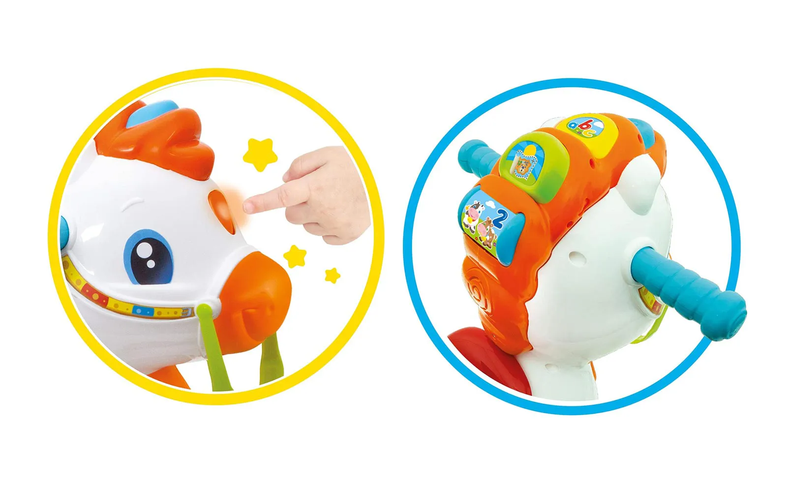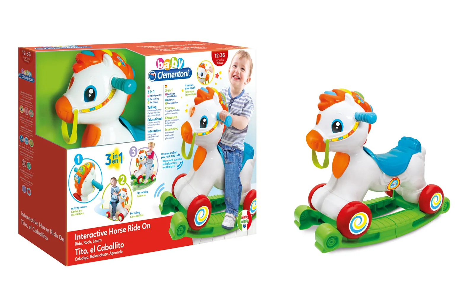 NTERAKTIVNI KONJIČEK 3 V 1, CLEMENTONI: Pripravite se na nepozabno igranje in učenje z interaktivnim konjičkom 3 v 1! Clementoni, vodilno podjetje pri razvoju igrač, je ustvaril to simpatično igračo, ki spremlja otroke na njihovi poti odraščanja. PRILAGODLJIVA IGRA: Konjiček se v prvi fazi uporablja kot gugalnik, kar otrokom omogoča zabavno in varno igro. Ko pa otrok odraste in je dovolj velik, se lahko spodnja ploščad odstrani, da postane pravi konjiček, na katerem otrok sedi in se giblje s svojimi nogami. Konjiček se tako premika, kar otroku nudi dodatno zabavo in interakcijo. IZOBRAŽEVANJE NA ZABAVEN NAČIN: Na glavi konjička so gumbi, s pomočjo katerih se otrok uči črke, številke in imena živali v italijanščini in angleščini. Interaktivni konjiček prepoznava gibanje, kot je guganje ali jahanje, in se odziva z lučmi in zvočnimi efekti. Poje pesmi, govori otroške rime in ponuja raznolike zvočne učinke, kar otrokom omogoča učenje skozi igro. VSEBINA KOMPLETA: interaktivni konjiček 3 v 1. Set interaktivnega konjička 3 v 1 Clementoni je idealen za otroke, ki se želijo zabavati ob učenju in raziskovanju sveta okoli sebe. Pustite, da jih ta čarobni konjiček popelje na neverjetno pustolovščino!