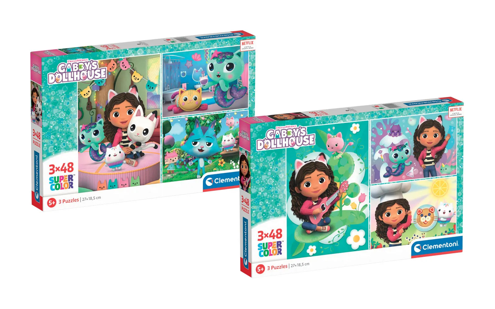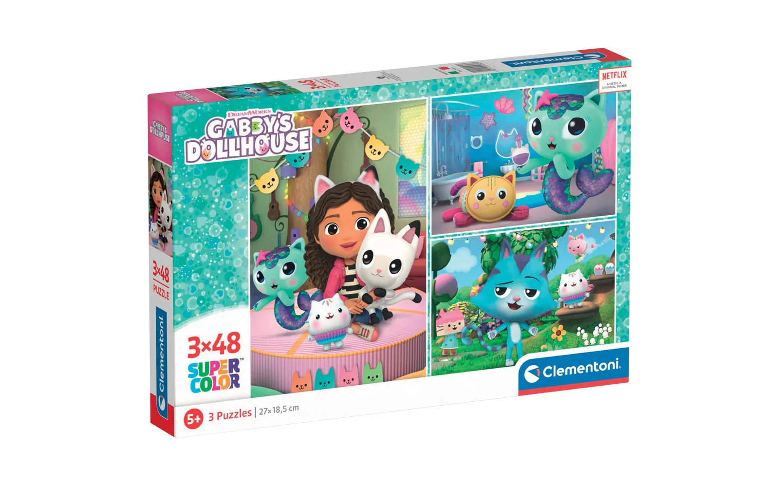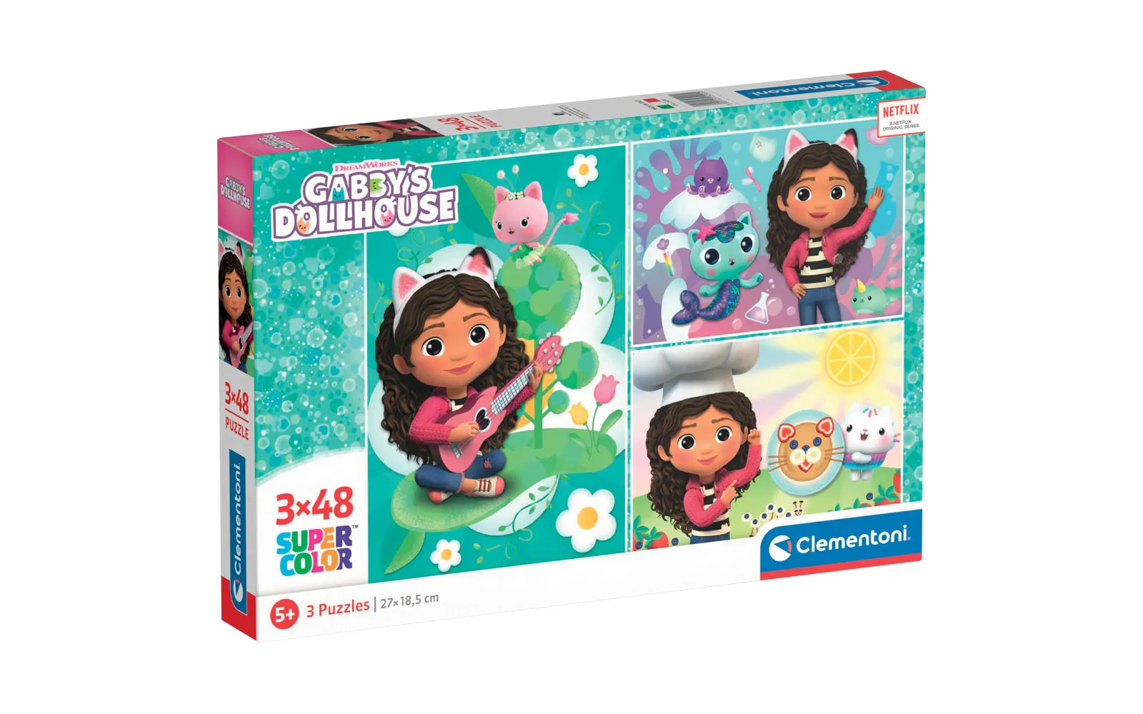 Tri sestavljanke priljubljenih risanih junakov s po 48 sestavnimi deli v eni sami embalaži. Sestavljanke Supercolor Clementoni spremljajo otroka v vseh fazah razvoja in mu pomagajo razvijati ročne spretnosti ter sposobnosti opazovanja. Kakovost materialov in posebna tehnika tiskanja zagotavljata vedno lepe, žive in jasne barve. Priporočamo otrokom od 5. leta starosti dalje. Na voljo v motivu Gabby's dollhouse.