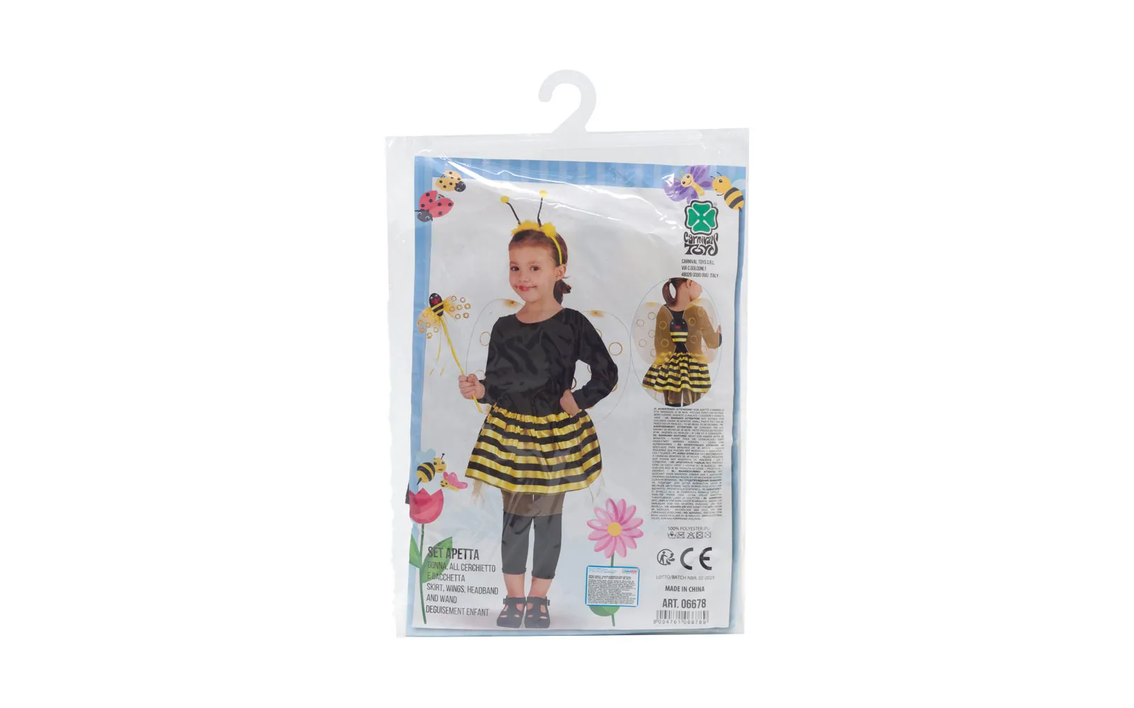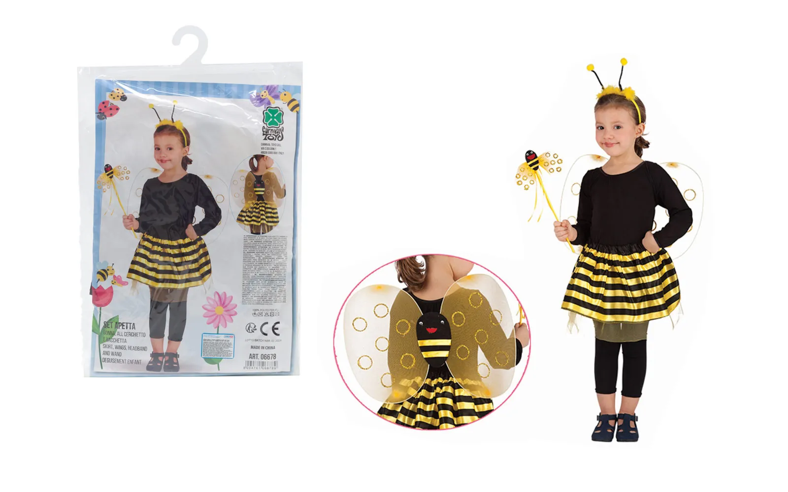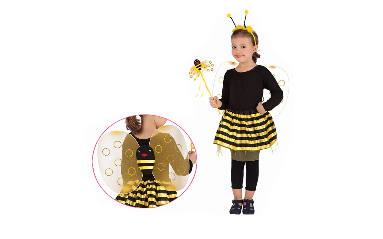 Set čebelica rumeno črne barve vsebuje krilo, palico, obroč in krila.