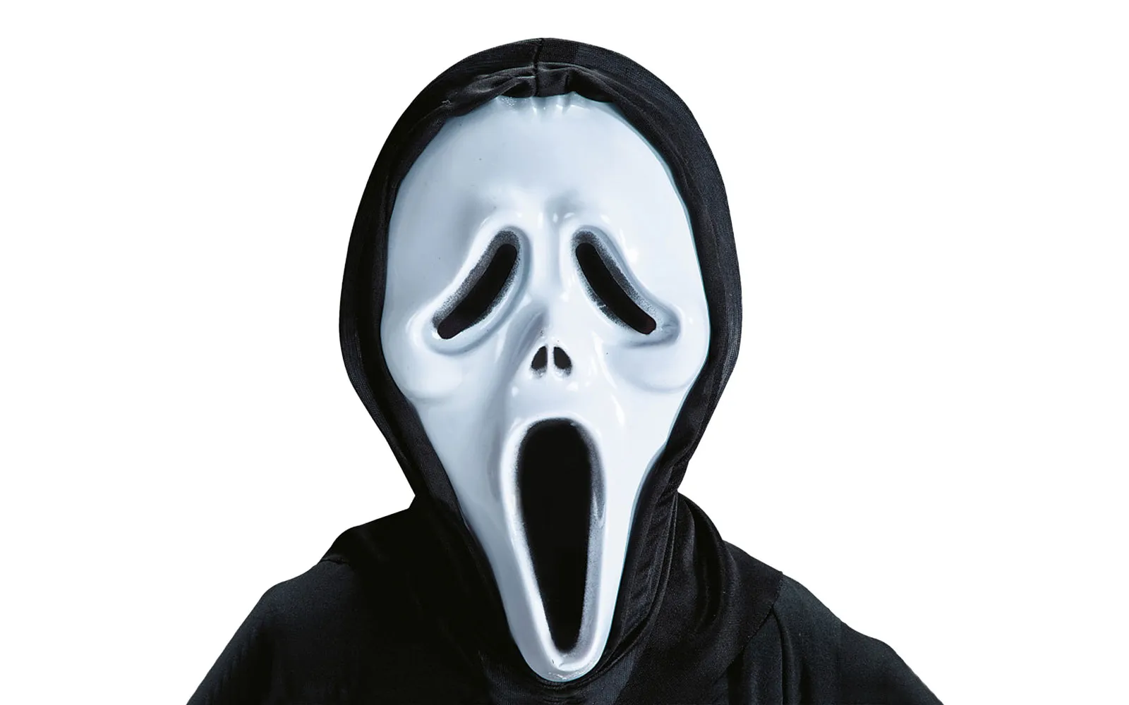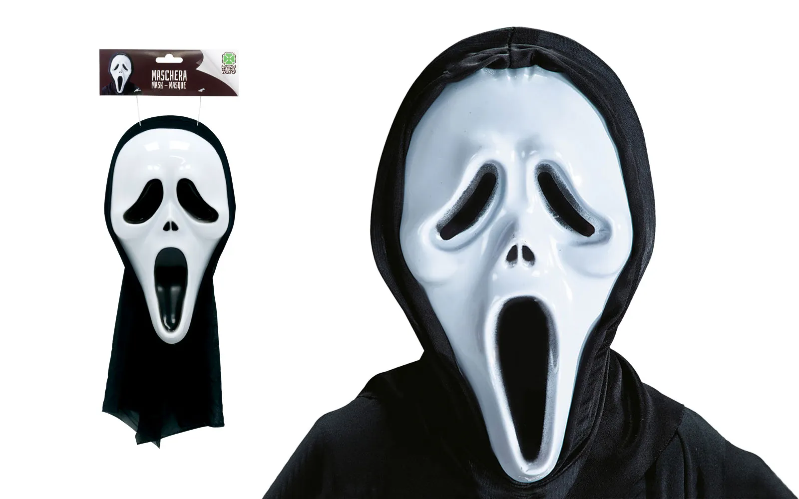 Pustna maska duh iz bele plastike s kapuco iz črnega blaga je klasična preobleka, ki spominja na grozljivko.