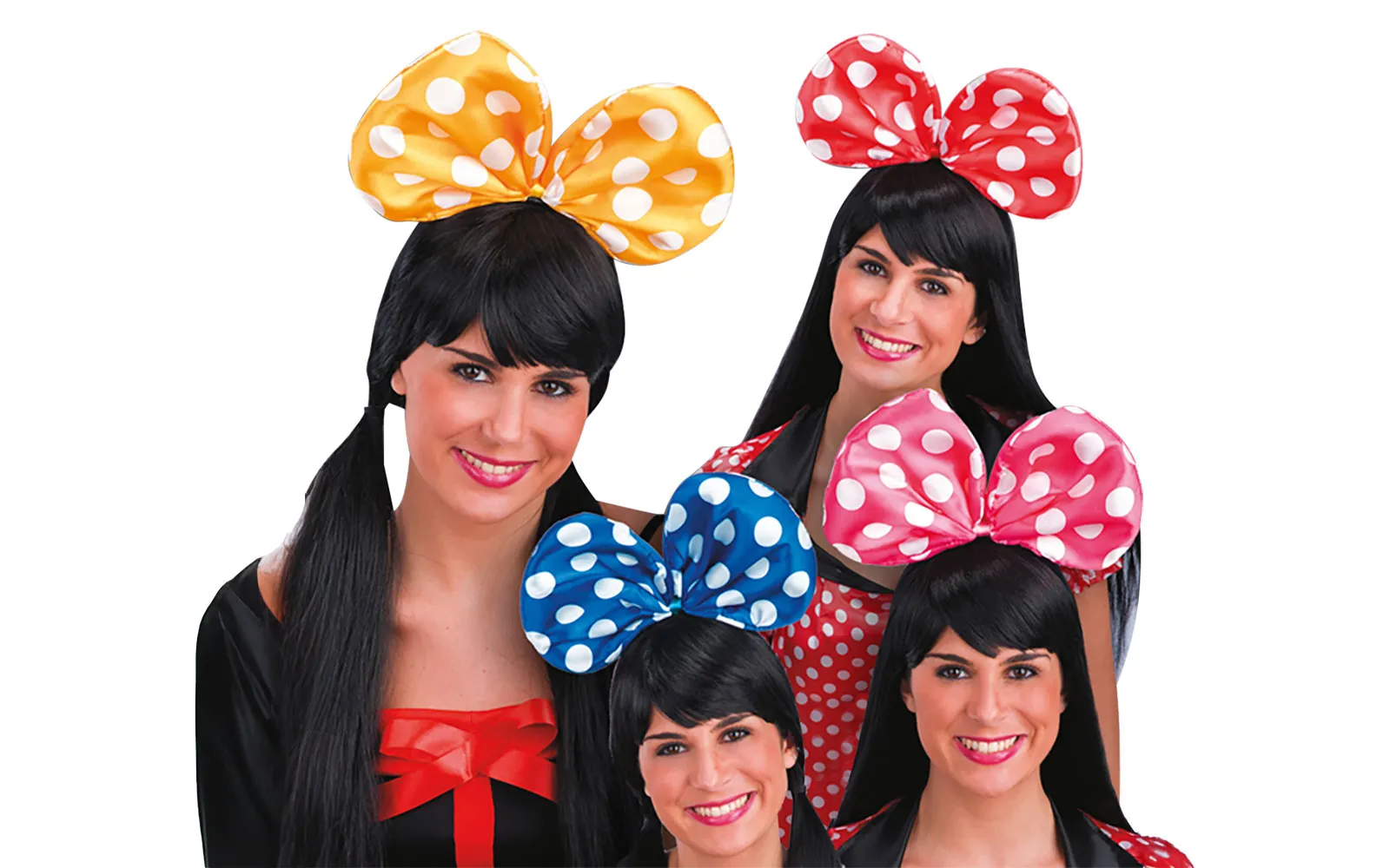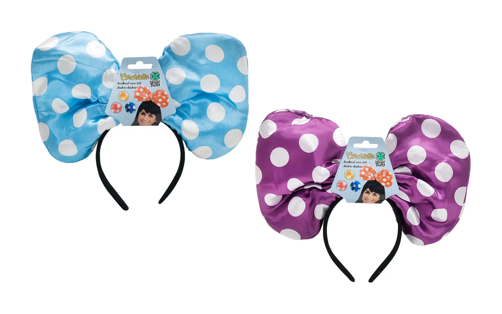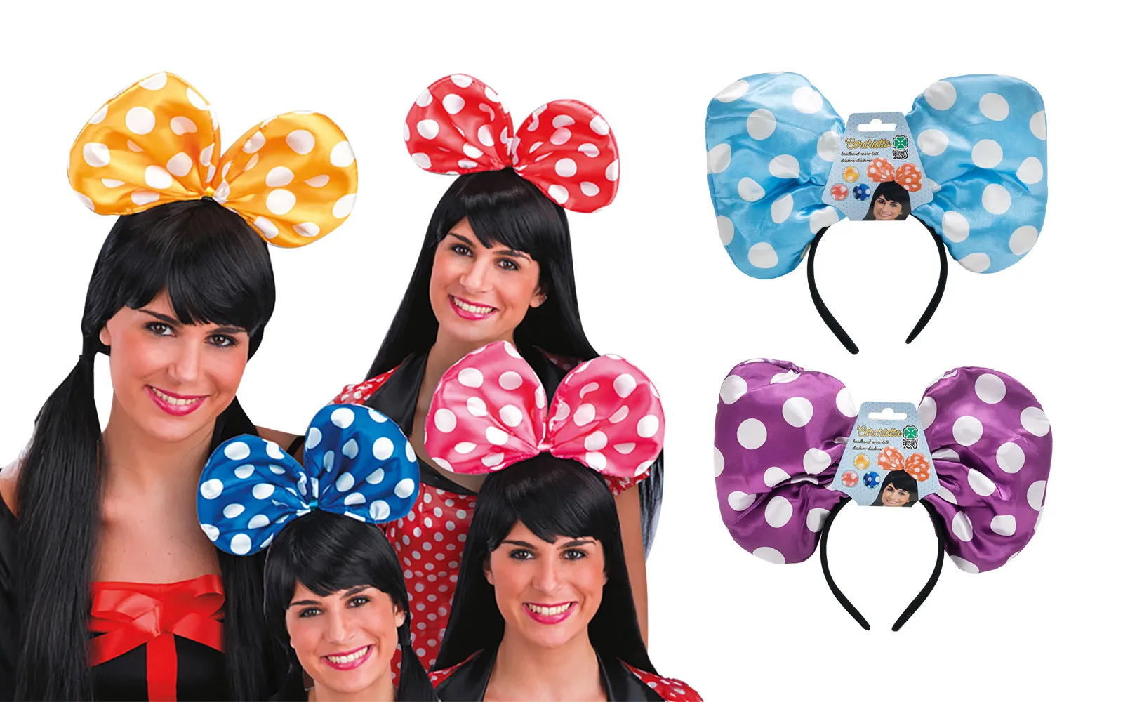 Obroč z veliko mašno različnih barv z belimi pikami. Naj bo to modra, roza, rdeča in rumena mašna, vsaka je prava.