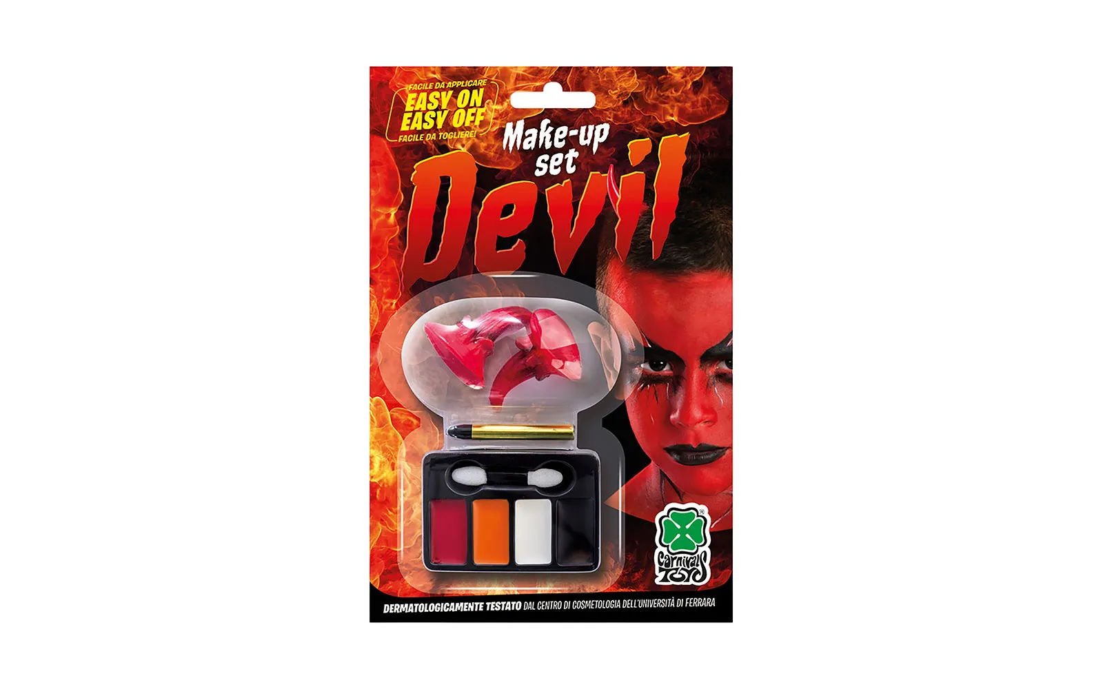 Komplet barv za obraz z motivom hudiča in dodatkom - nos je popolna izbira za pustne zabave, kostume in ustvarjanje strašljivega izgleda. Barve so varne, enostavne za nanos in trajne, da te spremljajo skozi cel večer.