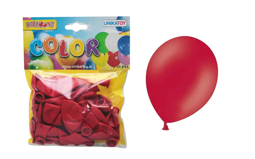 V vrečki je 24 balonov rdeče barve. Napihni balone, uporabi jih za dekoracijo na zabavi ali pa se z njimi preprosto igraj.