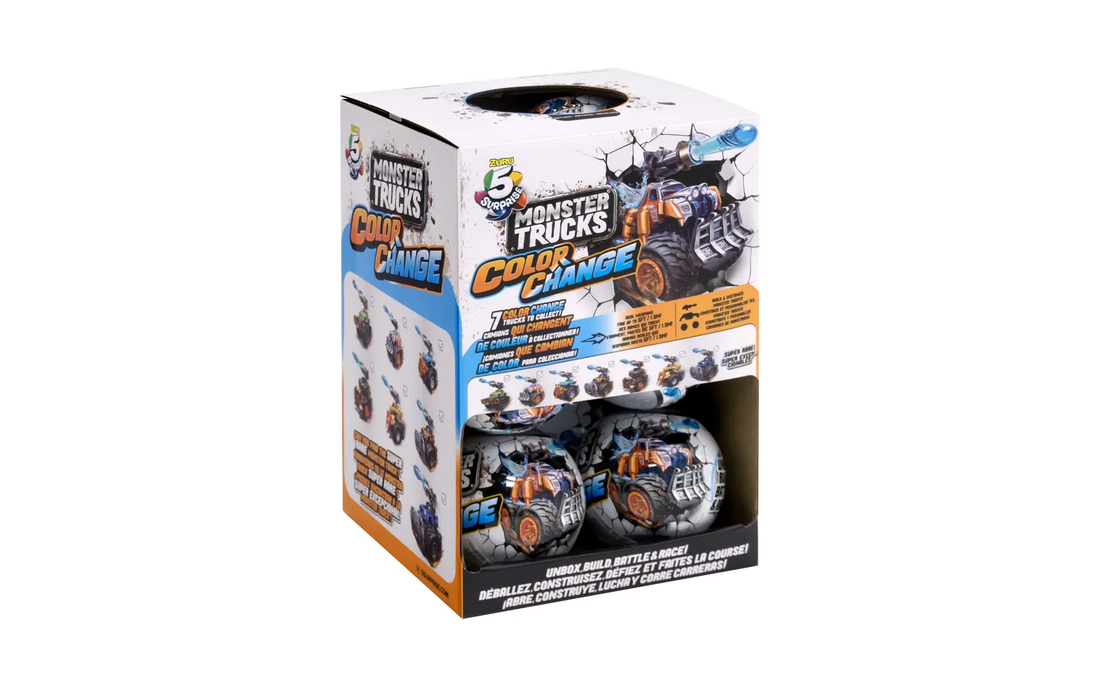 Set 5 surprise monster truck vsebuje vozilo Monster Truck, ki ob stiku z vodo spremeni barvo. Vozilo ima tudi izstrelek, ki ga preprosto namestite na vozilo in izstrelite. Zberete lahko 7 različnih Monster vozil.