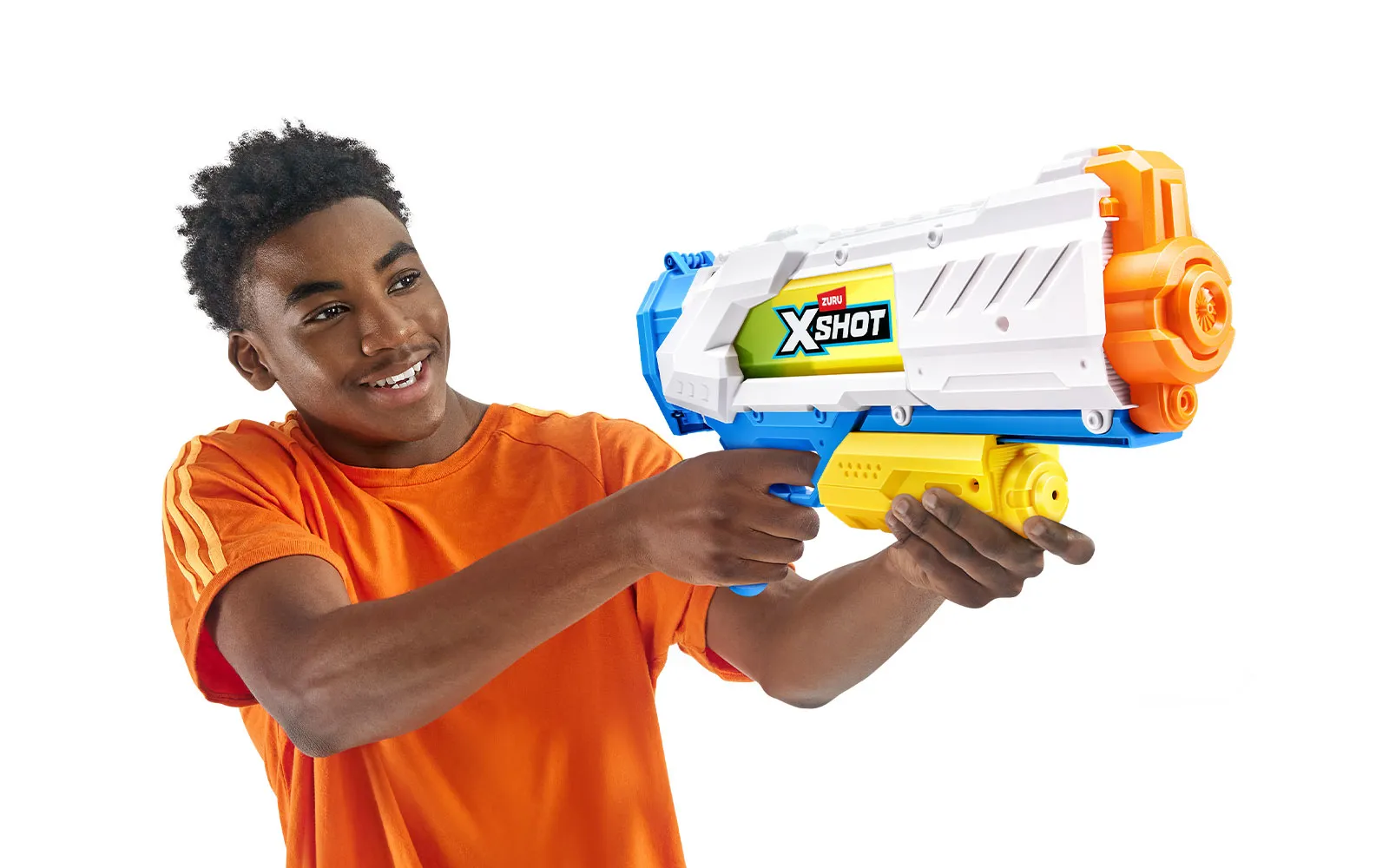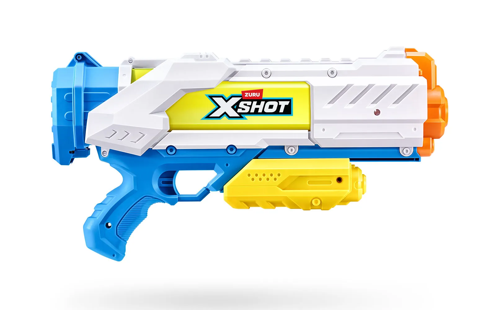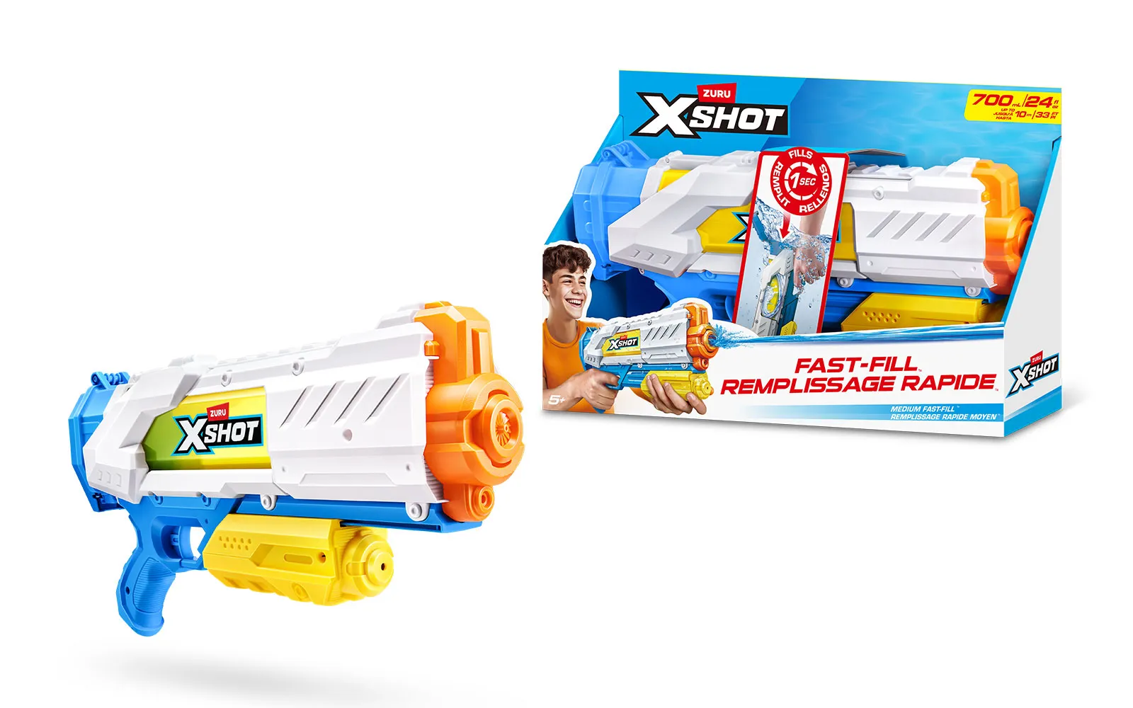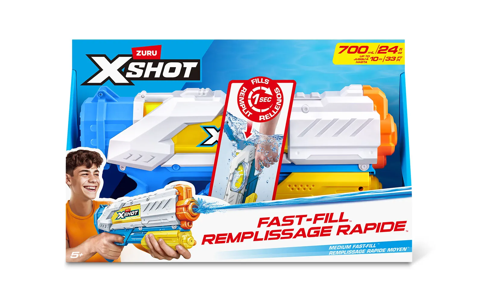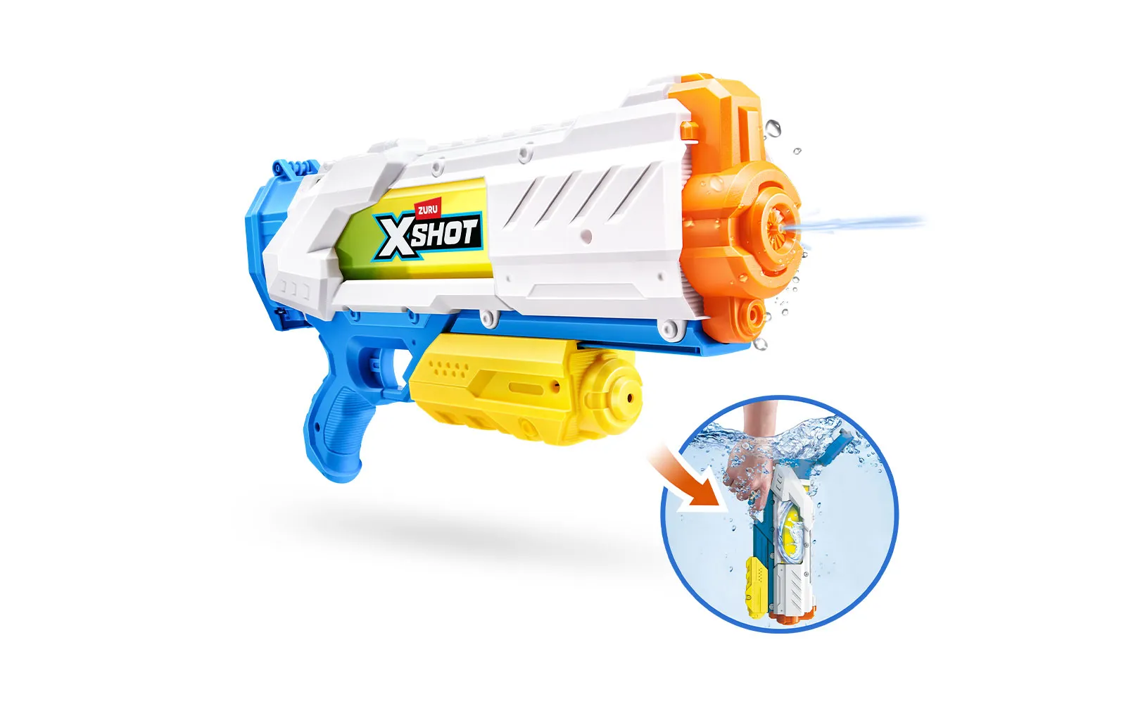 Vodna puška Fast Fill, X-Shot, priznane blagovne znamke Zuru. Vodna puška je dolga 40 centimetrov s kapaciteto 700 ml, polnjenje pa je enostavno in zabavno - odpri pokrovček, potopi jo v vodo, zapri pokrovček in že si pripravljen za vodno zabavo - vse to le v eni sekundi! Vodni curki imajo doseg kar do 10m!