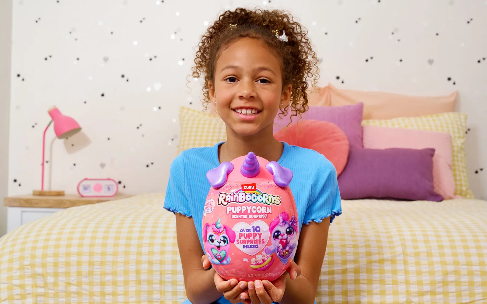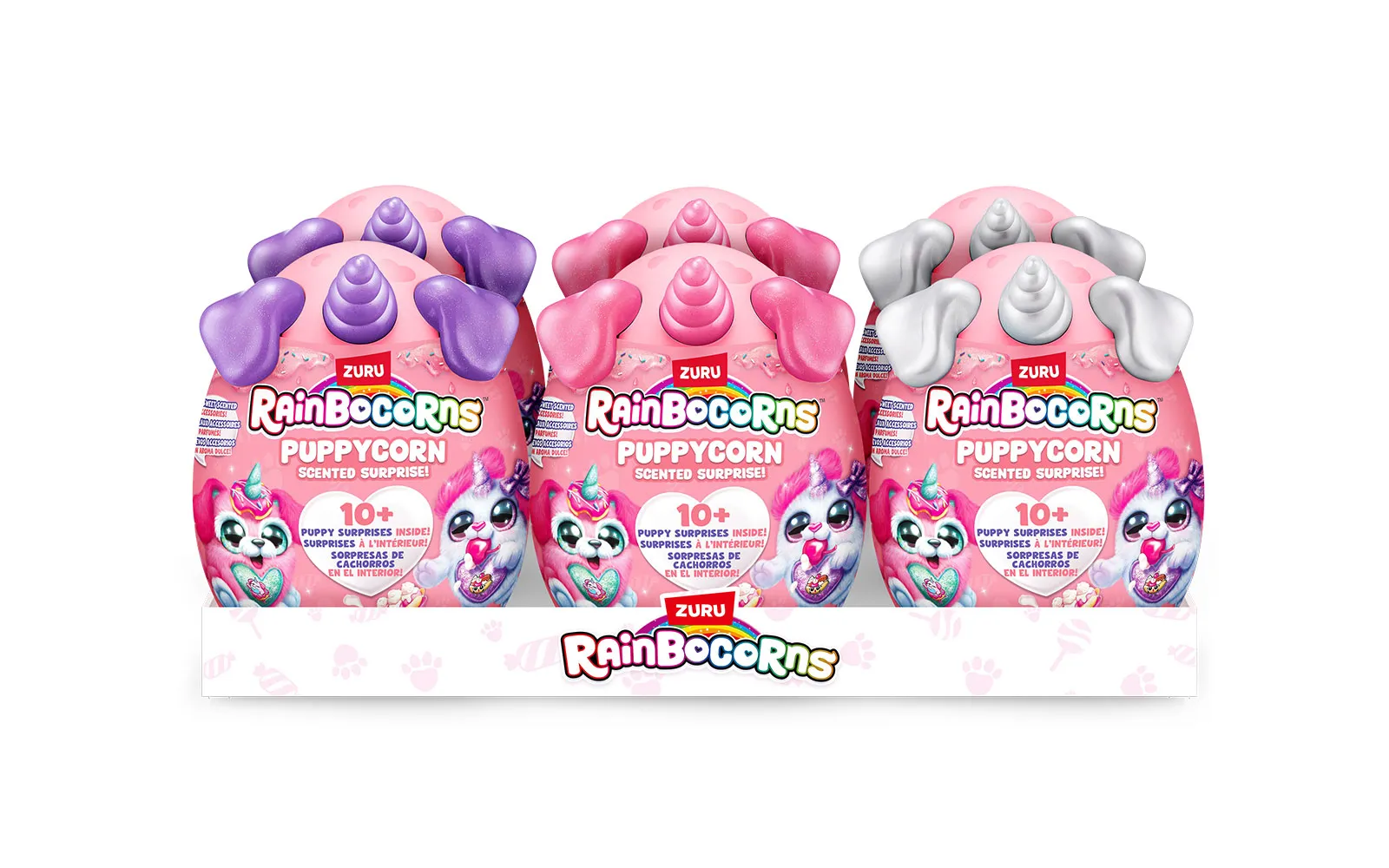 Set vsebuje 1x jajce presenečenja Puppycorn Surprise Egg, 1x Puppycorn plišasto živalico s Peel ‘n’ Reveal Magic Heart srčkom na trebuščku živalice, pod katerim se skriva podobica, 1x dišeči dodatek,9x Puppycorn nalepke, 1x Magic Puppy Poop, vodnik za zbiratelje. Na voljo je 7 različnih puhastih ljubljenčkov. Vsebina artikla je naključna in popolnoma neodvisna od različnih detajlov na embalažah.