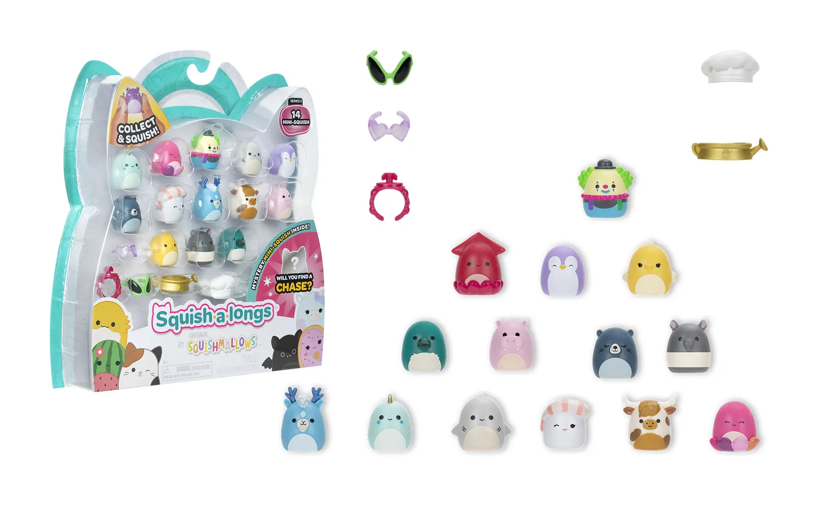 Odkrij zabavo z Squish A Longs – set 14 Mini-Squish figuric. Vključuje redke like, zabavne dodatke in več kot 140 različnih Mini-Squish za zbiranje, igro in menjavo!