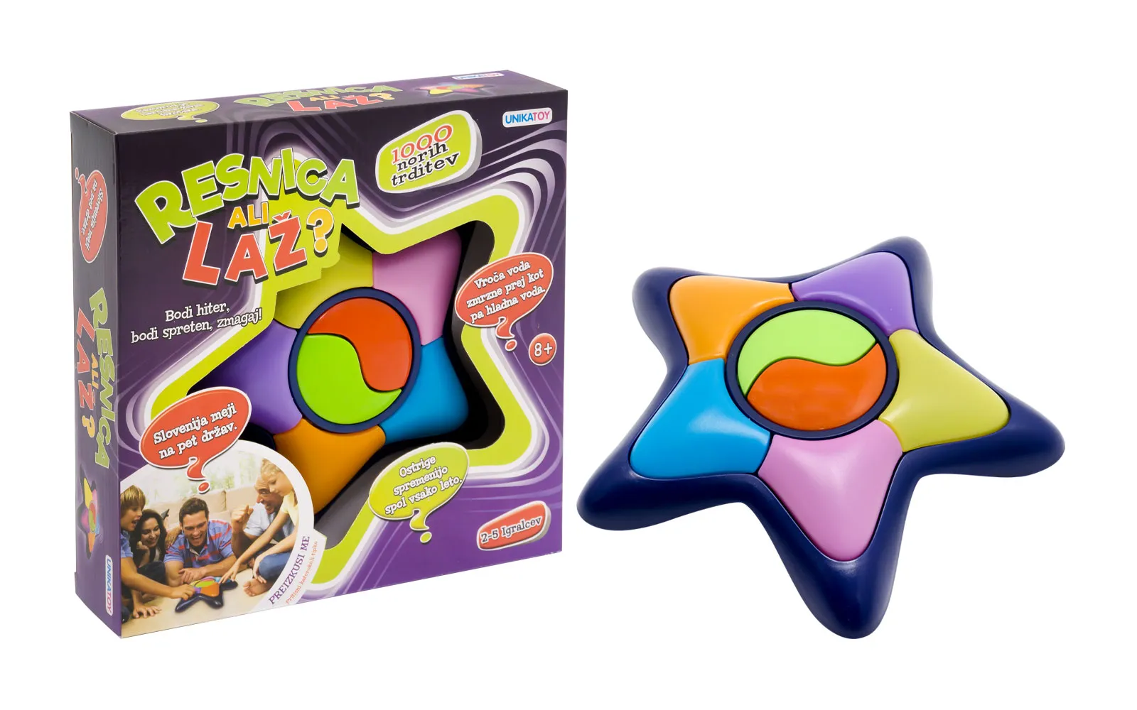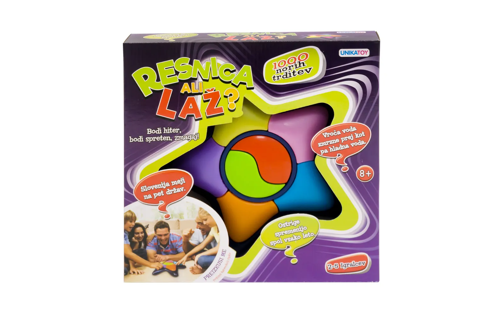 ZABAVNA IGRA, KI PREVERJA VAŠO SPRETNOST!: Ste pripravljeni na izziv? Igra Resnica ali laž bo preizkusila vaše znanje, hitrost in sposobnost ločevanja dejstev od neresnic! S preko 1000 neverjetnimi trditvami boste morali hitro razmisliti in pritisniti gumb, če mislite, da imate pravilen odgovor. Ampak pazite – napačen odgovor vas stane dve točki! PREPROSTA PRAVILA, NESKONČNA ZABAVA: Brez zapletenih navodil – virtualni mojster igre vodi celotno dogajanje! On bere izjave, razloži pravila, beleži rezultate in celo pripoveduje šale, da igra ostane zabavna in napeta do konca. VSEBINA: Elektronska naprava z vprašanji in gumbi za odgovore, Več kot 1000 izjav, ki vas bodo presenetile, Samodejno štetje točk in vodenje igre. Igra je primerna za 2 do 5 igralcev, priporočena starost pa je 8+ let. Z družino ali prijatelji se pripravite na smeh, presenečenja in pravo miselno tekmovanje! Kdo bo najboljši pri odkrivanju resnice?