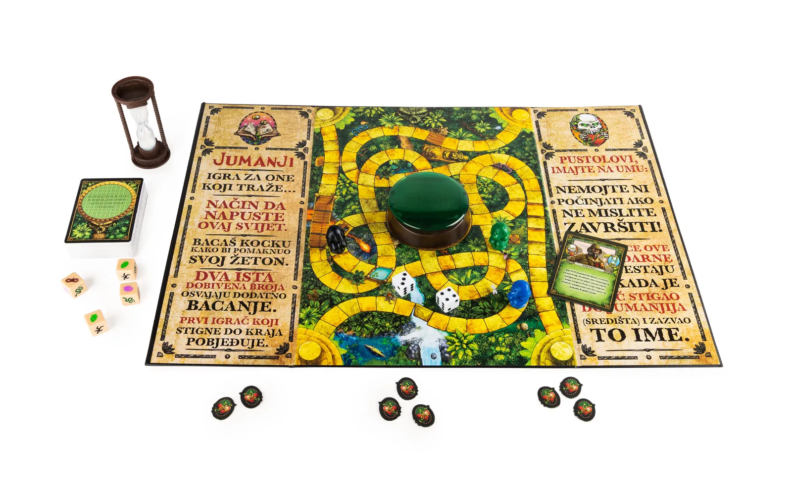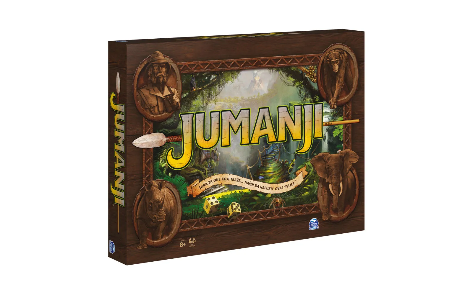 Odkritje zabavno igro Jumanji, ki je odlična za zabavne družinske večere.NA VOLJO V HRVAŠKEM JEZIKU!Domišljija ne pozna meja z družabnimi igrami priznane blagovne znamke Spin Master.S pomočjo rdeče kupole razvoljaj uganke in odkrij izzive, ki jih boš moral premagati na svoji pustolovščini skozi džunglo.Prvi igralec, ki doseže središče igre, zmaga v imenu celotne skupine! Vendar pa previdnost ni odveč – če komu od igralcev zmanjka življenj še preden nekdo doseže središče, izgubijo vsi!Vsebina seta:1 igralna plošča,1 figura kupole,100 kartic z izzivi,4 igralne figurice samorogov,12 žetonov življenja,2 kocki,4 kocke za izzive,1 peščena ura z nastavljenim časom 45 sekund ter navodila.Igra je primerna za otroke od 8. leta starosti dalje ter za 2 do 4 igralce.