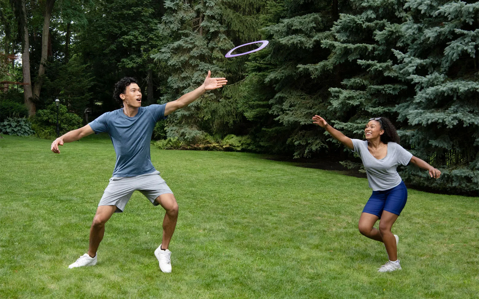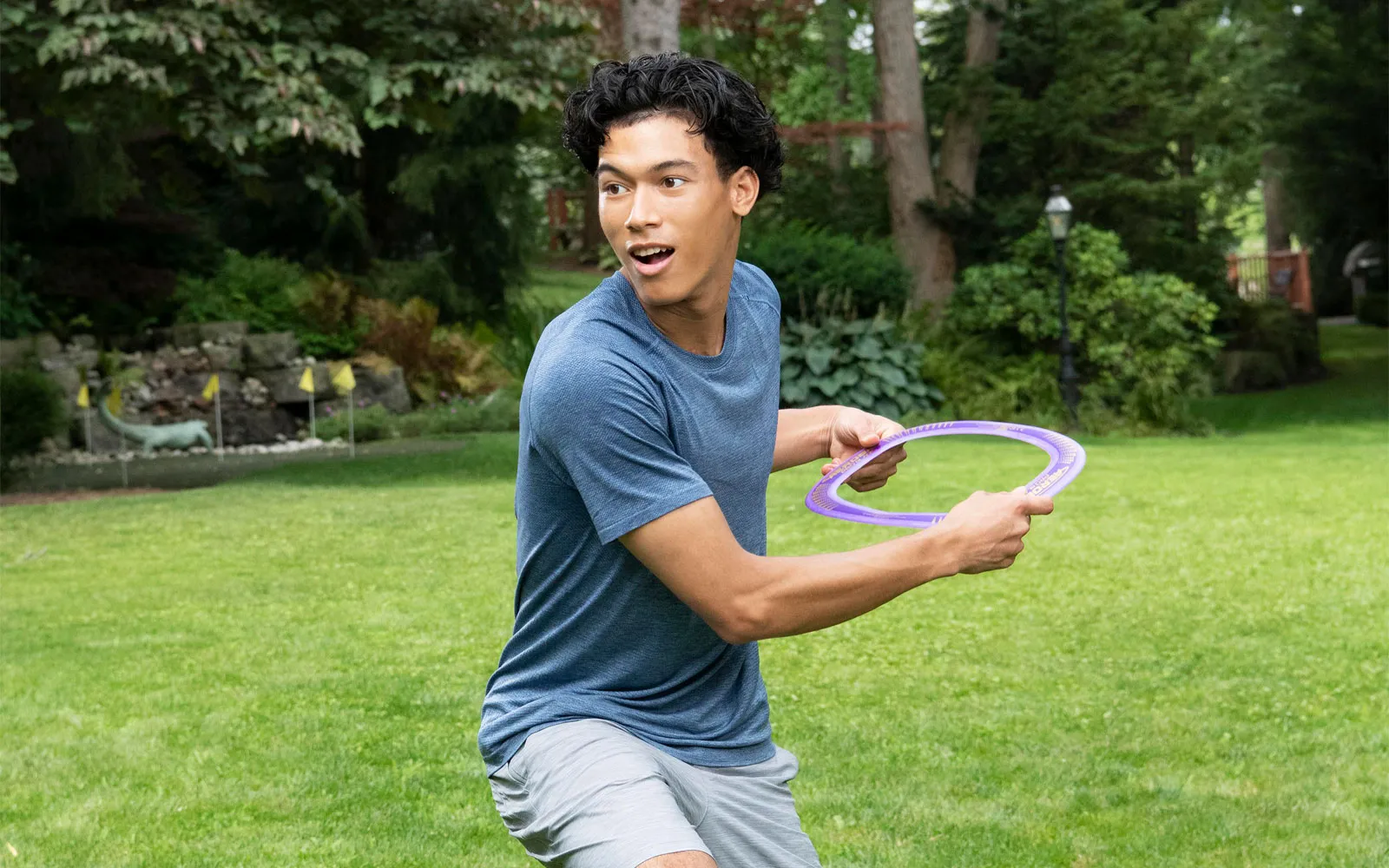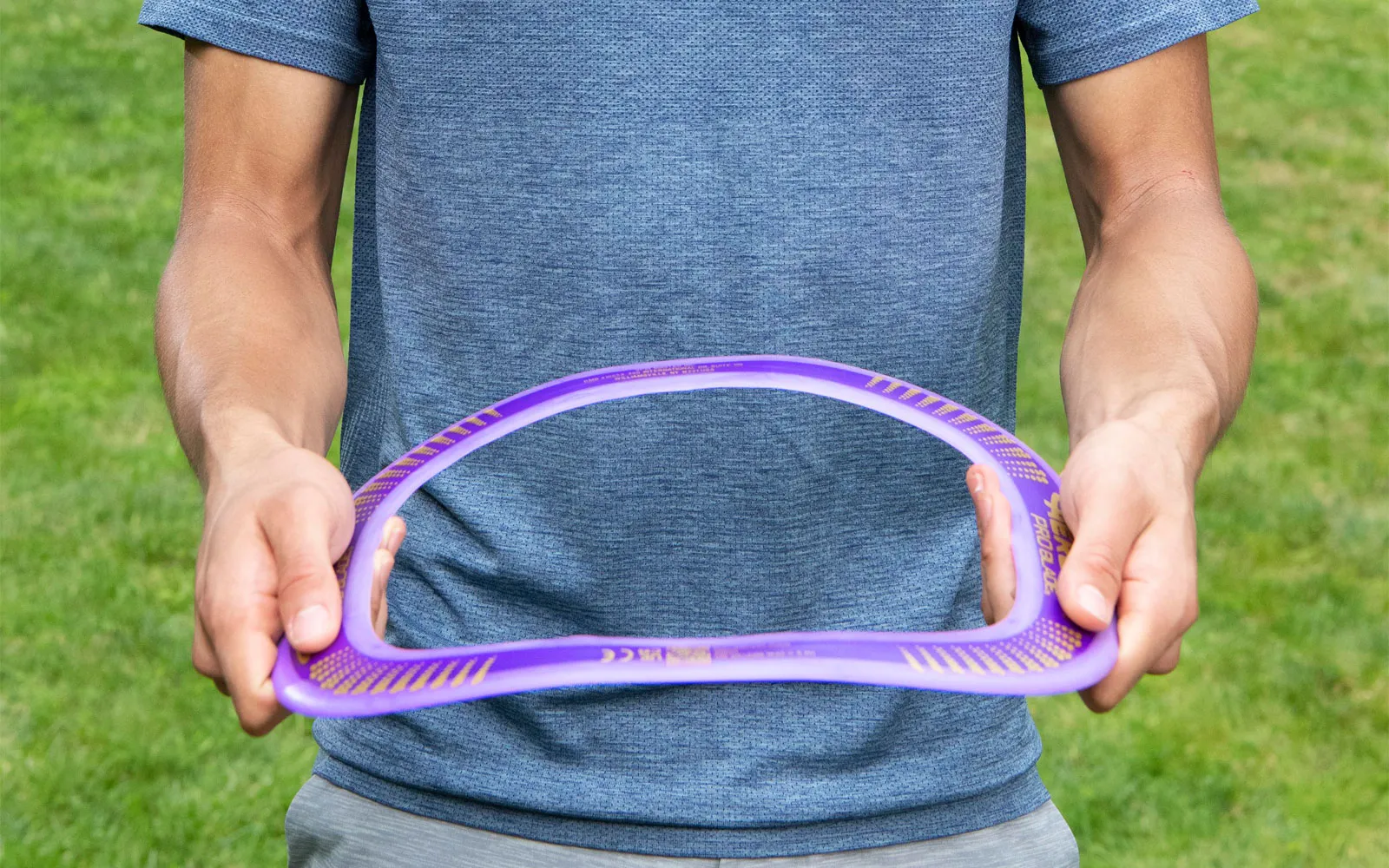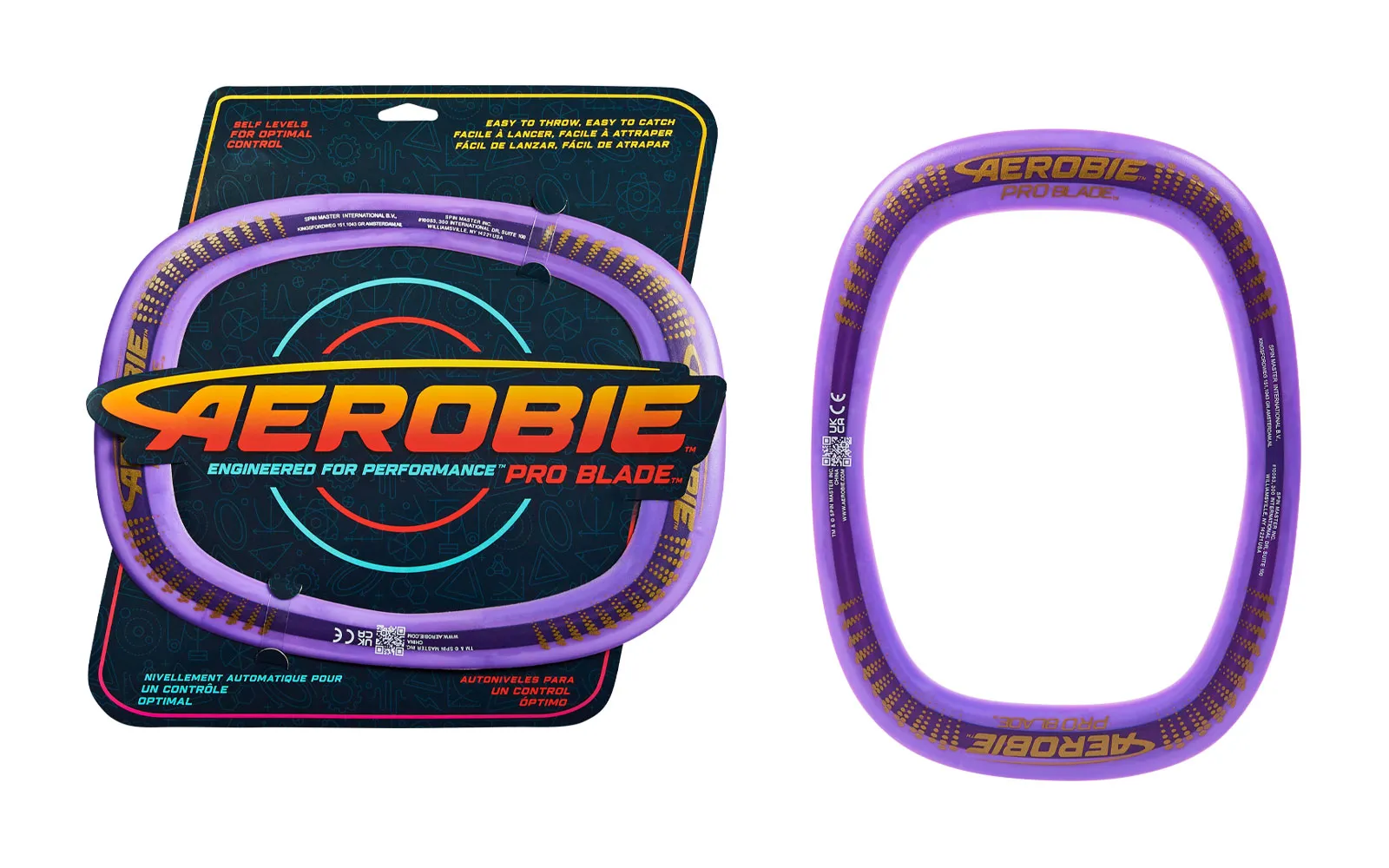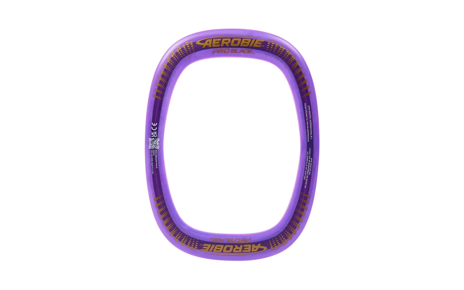 Leteči obroč Pro blade Aerobie. Na voljo v vijolični barvi. Leteči obroč Aerobie Sprint ima odlične značilnosti letenja, leti naravnost in 2x dlje kot navadni leteči krožniki. Namenjen je metanju v parkih, na igriščih, plažah ali v kampih, priporočljiv pa je za otroke, starejše od 5 let. Zahvaljujoč svoji edinstveni konstrukciji obroč enakomerno pluje v zraku - kot da leti med nevidno plastjo ledu. Ta učinek deluje tudi pri različnih hitrostih metanja. Rob obroča je izdelan iz mehkejše gume, kar pomeni, da se lahko udobno ujame in se brez poškodb zlahka odbije od ovir. Igra z obročem je namenjena paru ali skupini ljudi - prepovedano pa je metati v oči, obraz drugih oseb ali živali. Mečite ga samo svojemu lovilcu v dobro osvetljenjem območju brez ovir. Ne mecite poškodovanega ali spremenjenega obroča, saj to lahko vodi v poškodbe.