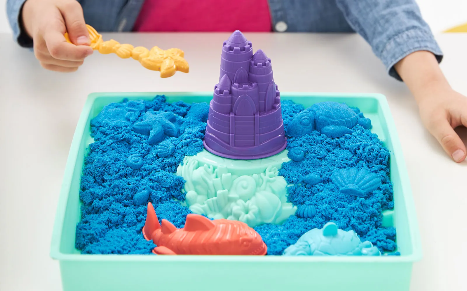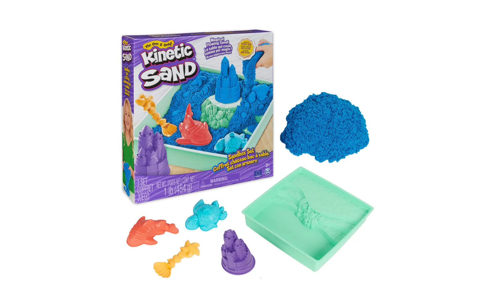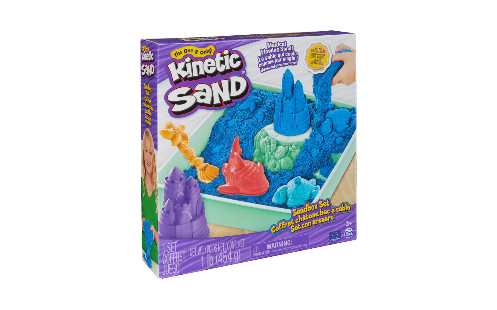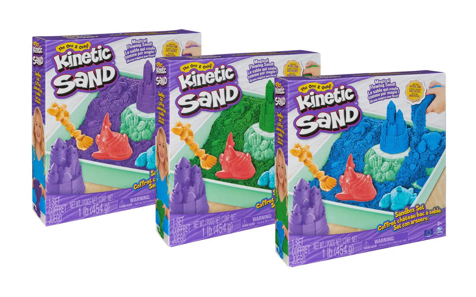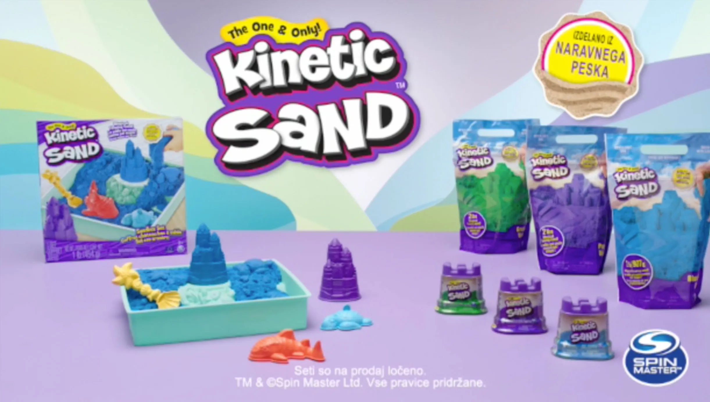 Kinetični pesek Kinetic Sand, v škatli, set by Spin Master. Na voljo različne barve peska. Mivka kinetičnega peska je proizvedena na Švedskem.