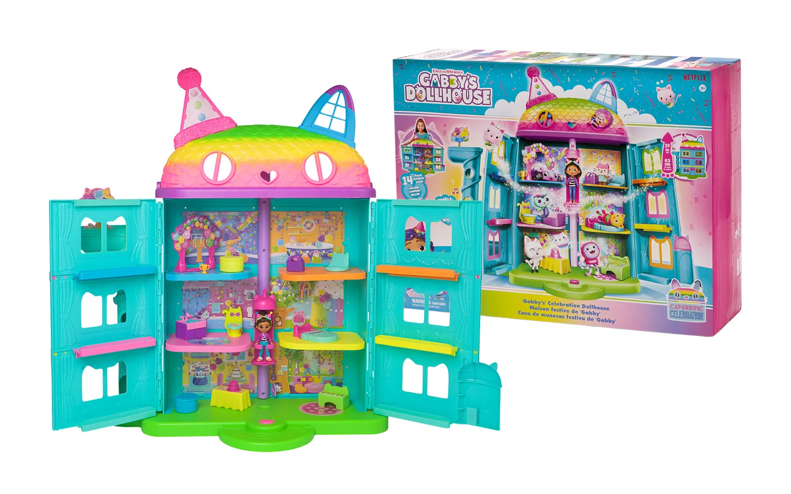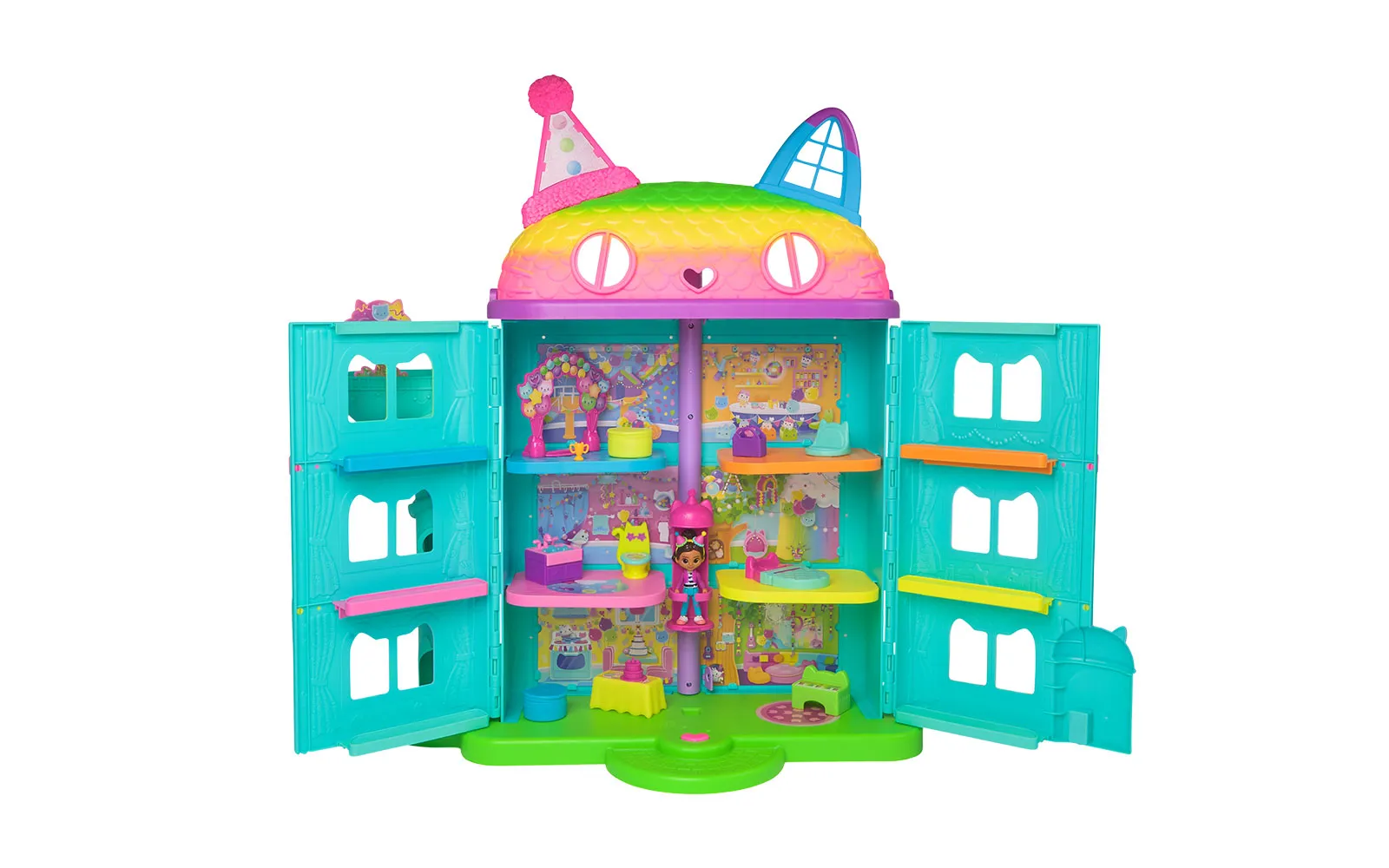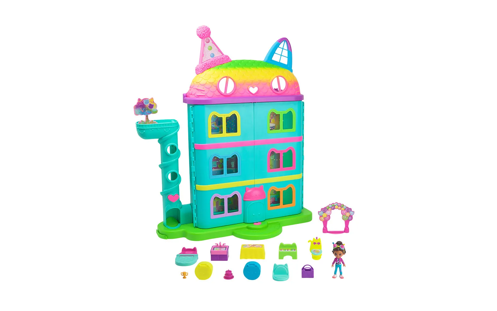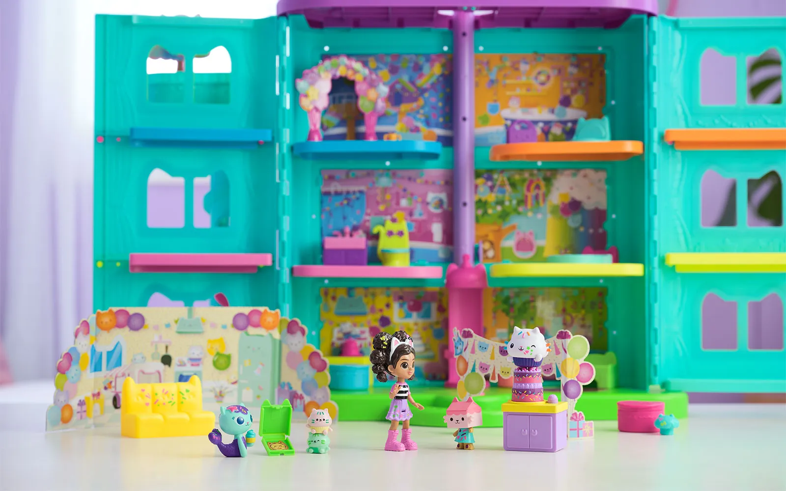 Vstopite v čudovit svet risanke Gabby’s dollhouse in odkrijte ljubke mačke in barvite čarovnije! Set hiške praznovanj Gabby's dollhouse je kot nalašč za pravo pustolovščino z junaki animirane serije in zabavno igro. Hiška vsebuje mnogo dodatkov in je prava izbira za domišljijsko doživetje.
