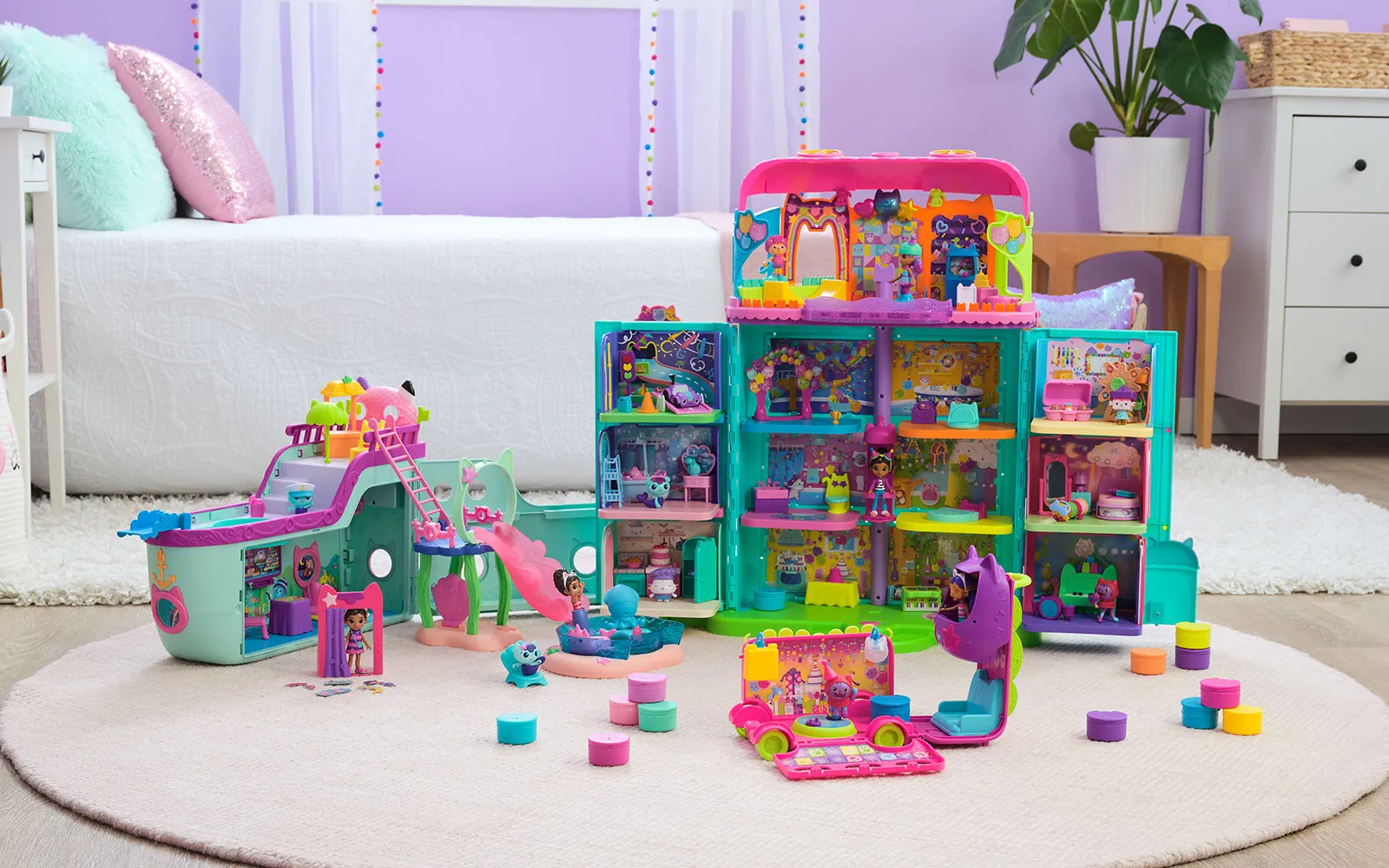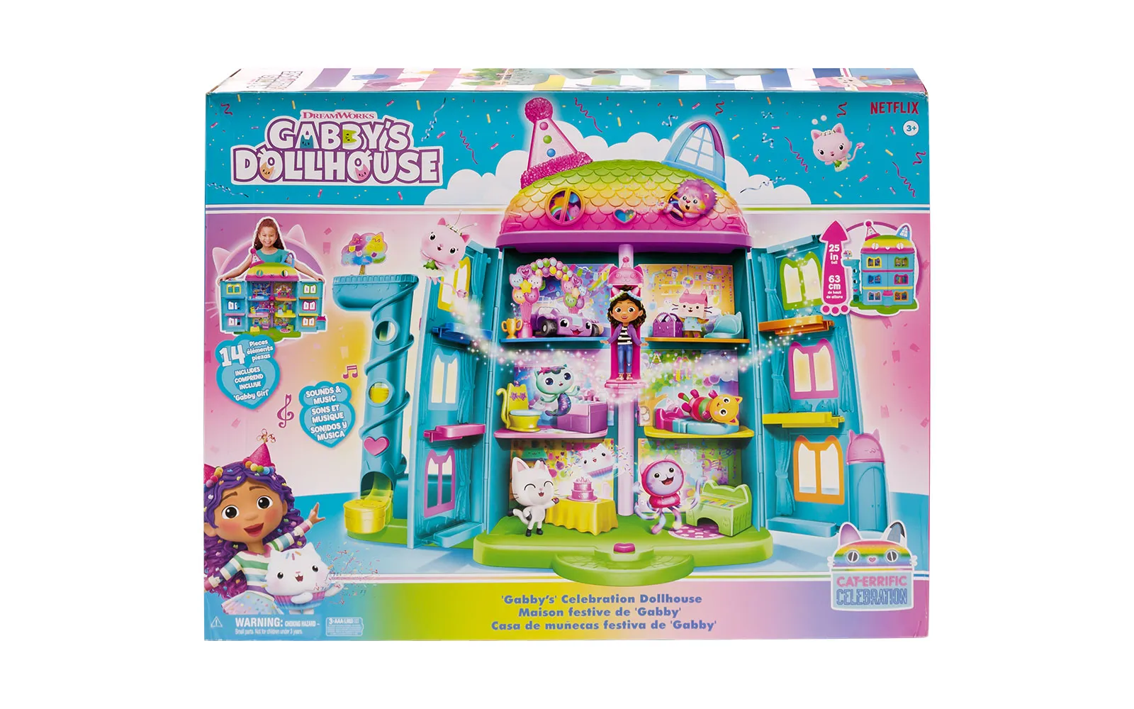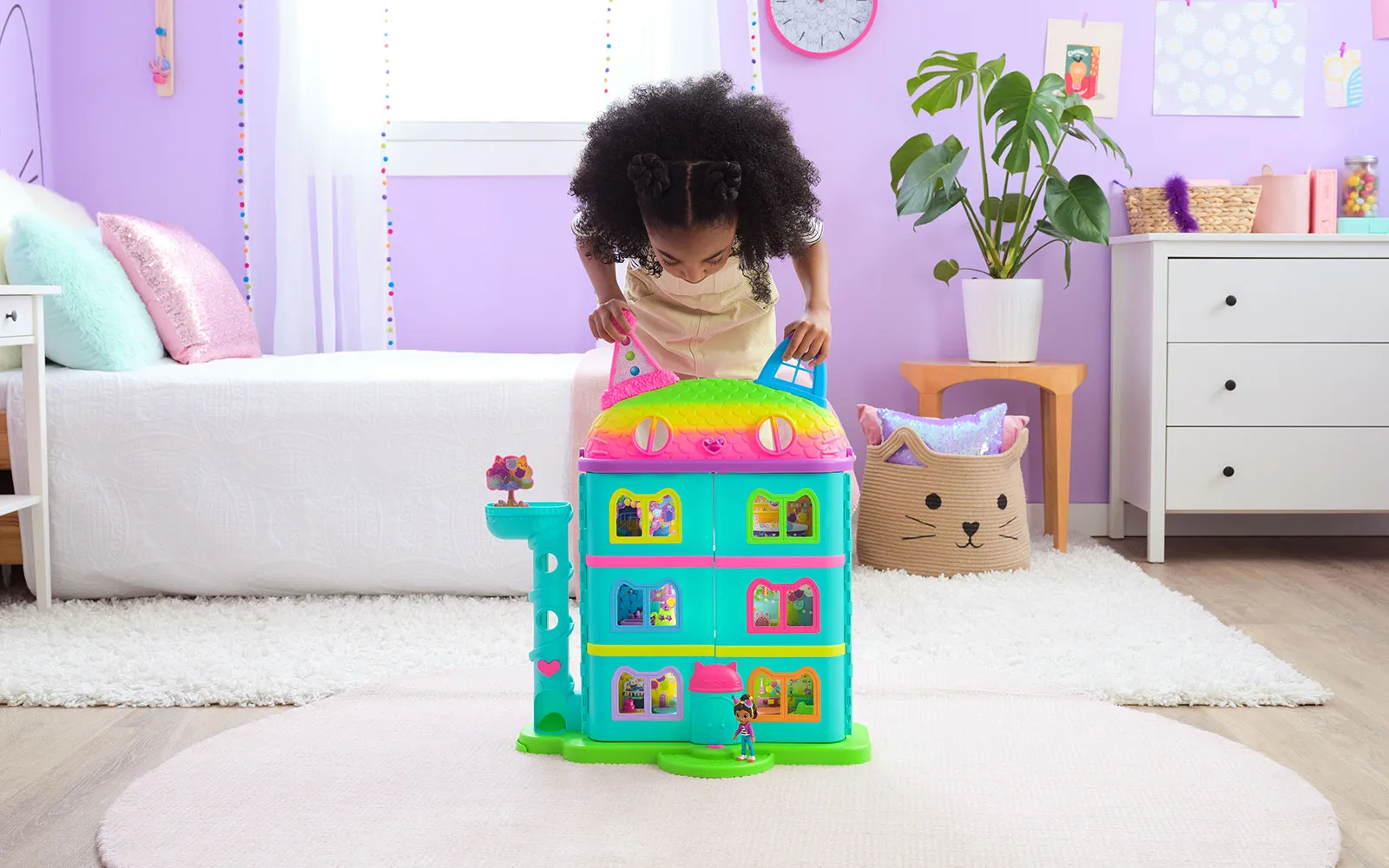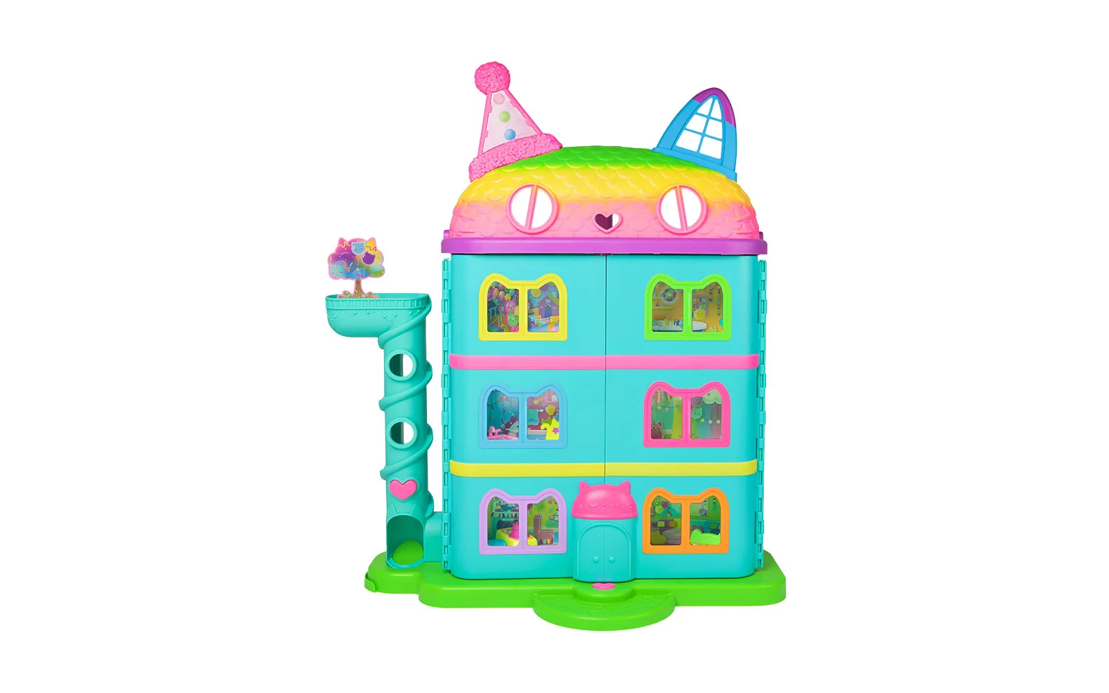 Vstopite v čudovit svet risanke Gabby’s dollhouse in odkrijte ljubke mačke in barvite čarovnije! Set hiške praznovanj Gabby's dollhouse je kot nalašč za pravo pustolovščino z junaki animirane serije in zabavno igro. Hiška vsebuje mnogo dodatkov in je prava izbira za domišljijsko doživetje.