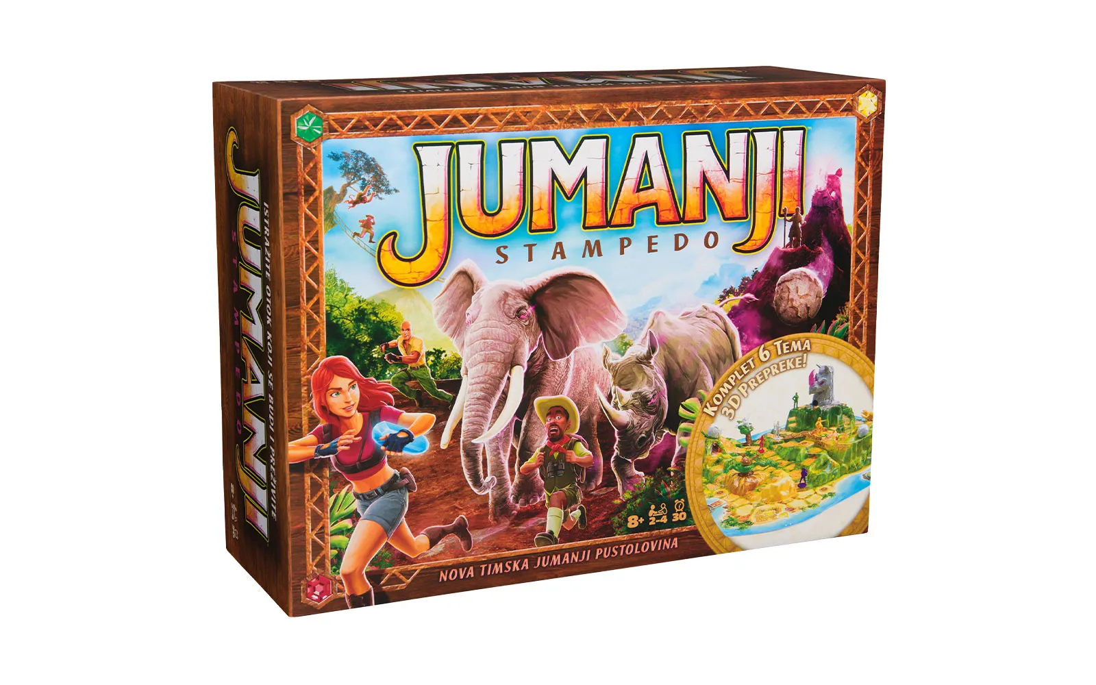 VSTOPITE V SVET JUMANJIJA! Ste pripravljeni na divjo pustolovščino? Jumanji Stampedo je napeta družabna igra, polna presenečenj in izzivov, ki bodo preizkusili vašo hitrost, strategijo in spretnost. NAPETA DRUŽABNA IGRA ZA VSO DRUŽINO: Zabavajte se s prijatelji in družino ter pobegnite iz džungle, polne nevarnosti. Pazite na nepričakovane ovire in pametno izbirajte svoje poteze, saj v Jumanjiju nikoli ne veste, kaj vas čaka! IGRA V HRVAŠKEM JEZIKU: Igra je na voljo v hrvaškem jeziku, kar omogoča enostavno razumevanje pravil in pristno igralno izkušnjo. VSEBINA: igralna plošča s tematskim motivom Jumanjija, figurice živali za igro, igralne kartice s posebnimi izzivi, kocke za premikanje figur. Zberite ekipo, zavrtite kocko in se podajte na divjo pustolovščino – v džungli Jumanjija preživijo le najspretnejši!