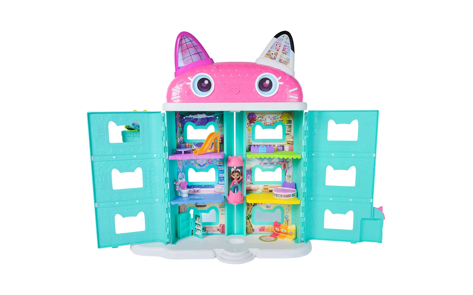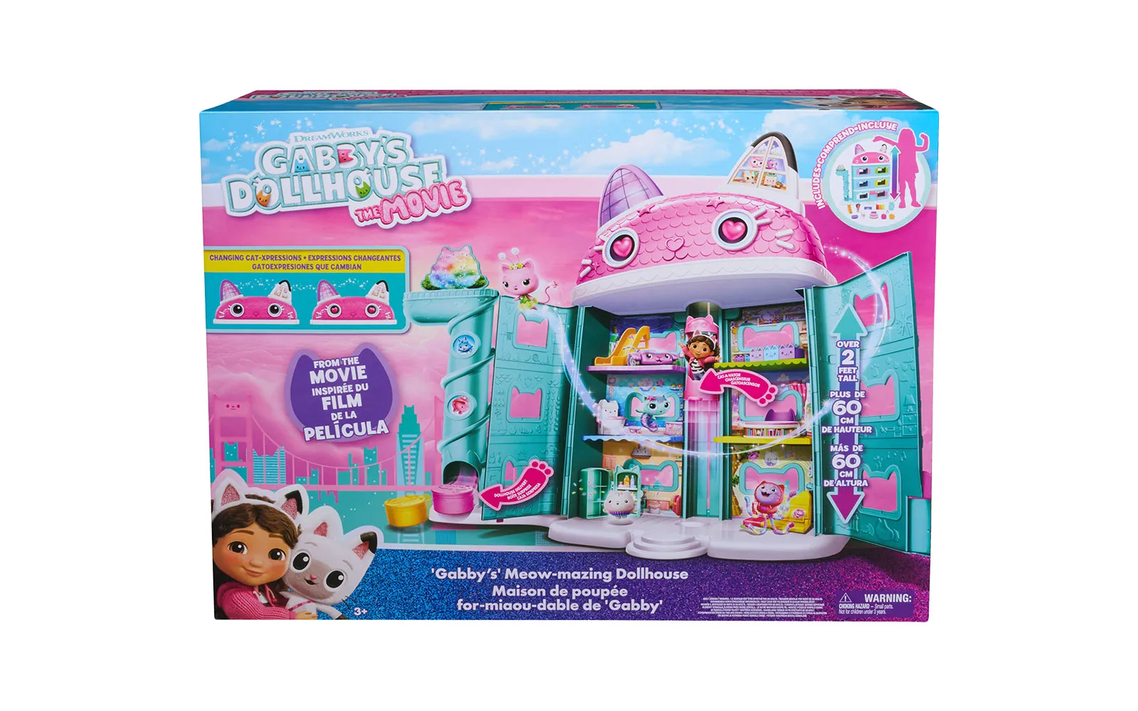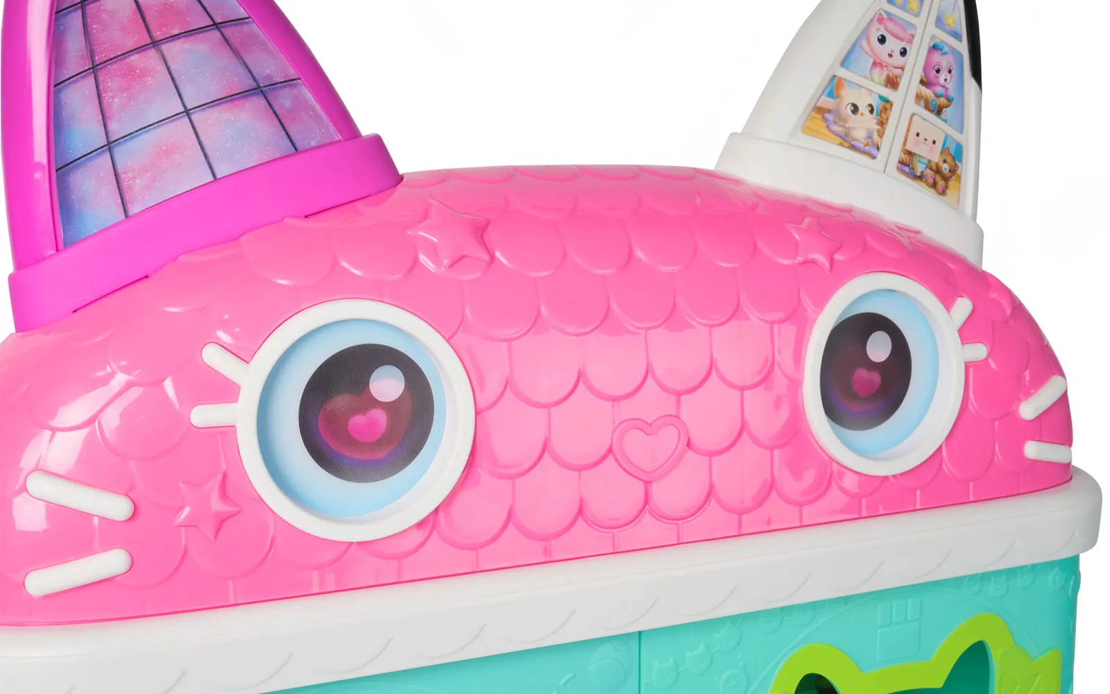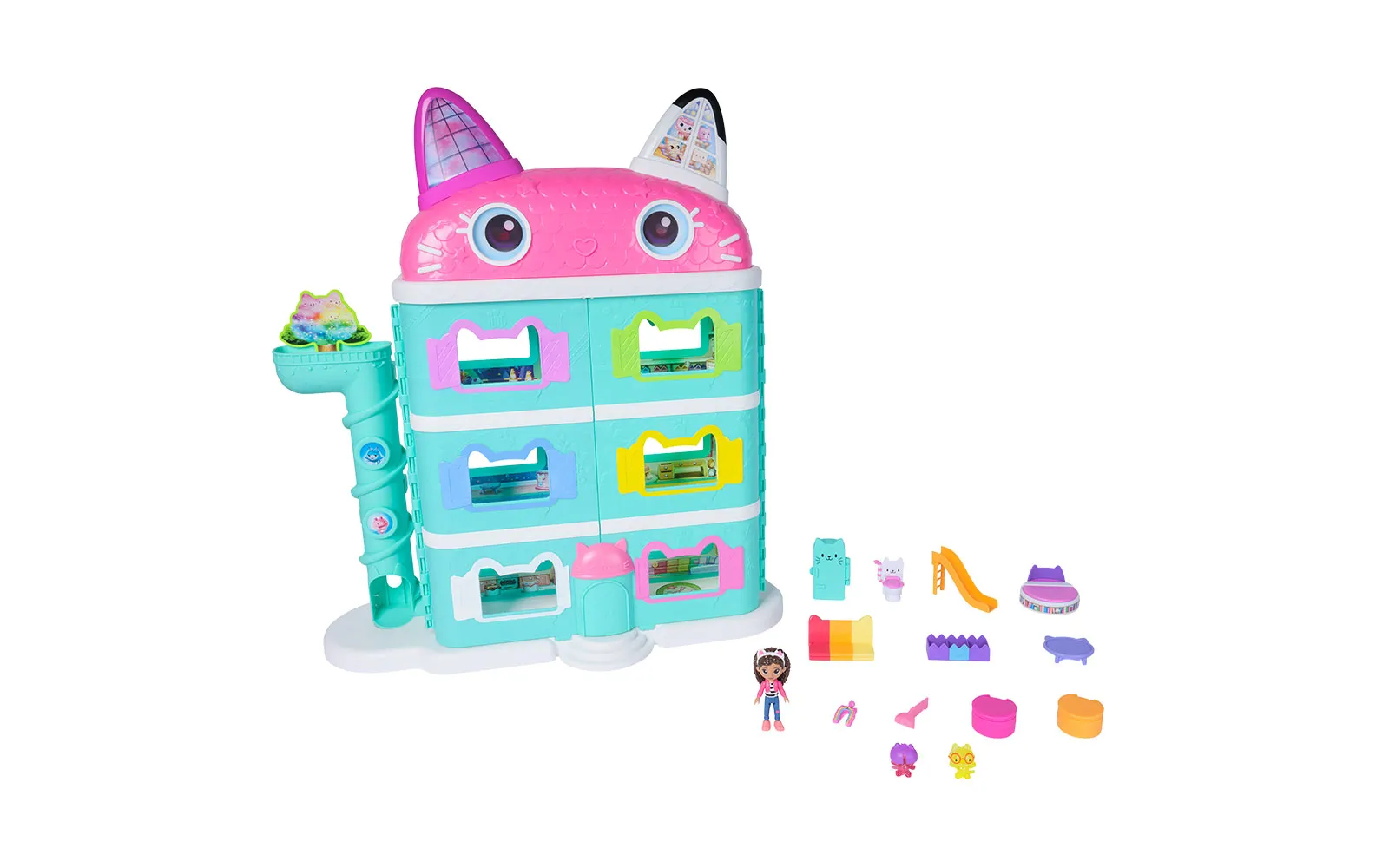 Odkrijte čarobni svet Gabbyjine mijavkajoče hišice za punčke, visoke več kot 60 cm, s čarobnimi gibljivimi očmi, šestimi čudovitimi mačjimi sobami in zabavno sobo v 4. nadstropju, ki jo lahko raziščete s pomočjo Cat-a-vatorja; komplet vključuje ekskluzivno figurico Gabby Girl iz filma Gabby's Dollhouse: The Movie s prepoznavnim trakom za lase v obliki mačjih ušes ter več kot 15 dodatkov, vključno s pohištvom, nalepkami in dekoracijo – popoln komplet za ustvarjanje lastnega domišljijskega sveta, ki spodbuja ustvarjalno igro in navdušuje vse male oboževalce Gabbyjine hišice za punčke. Hiška omogoča igro v 360 stopinjah.