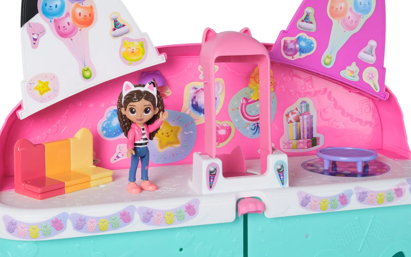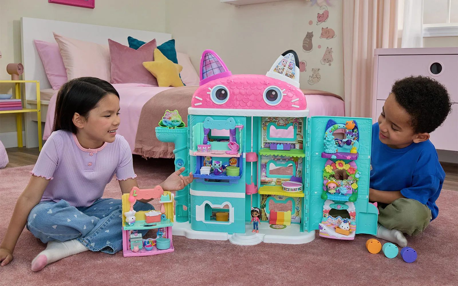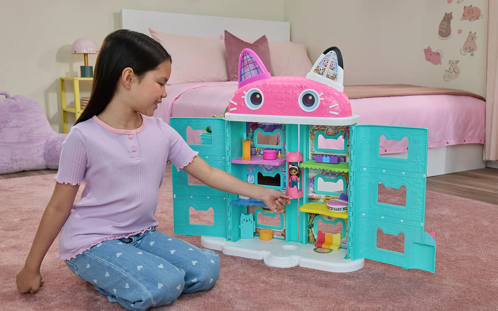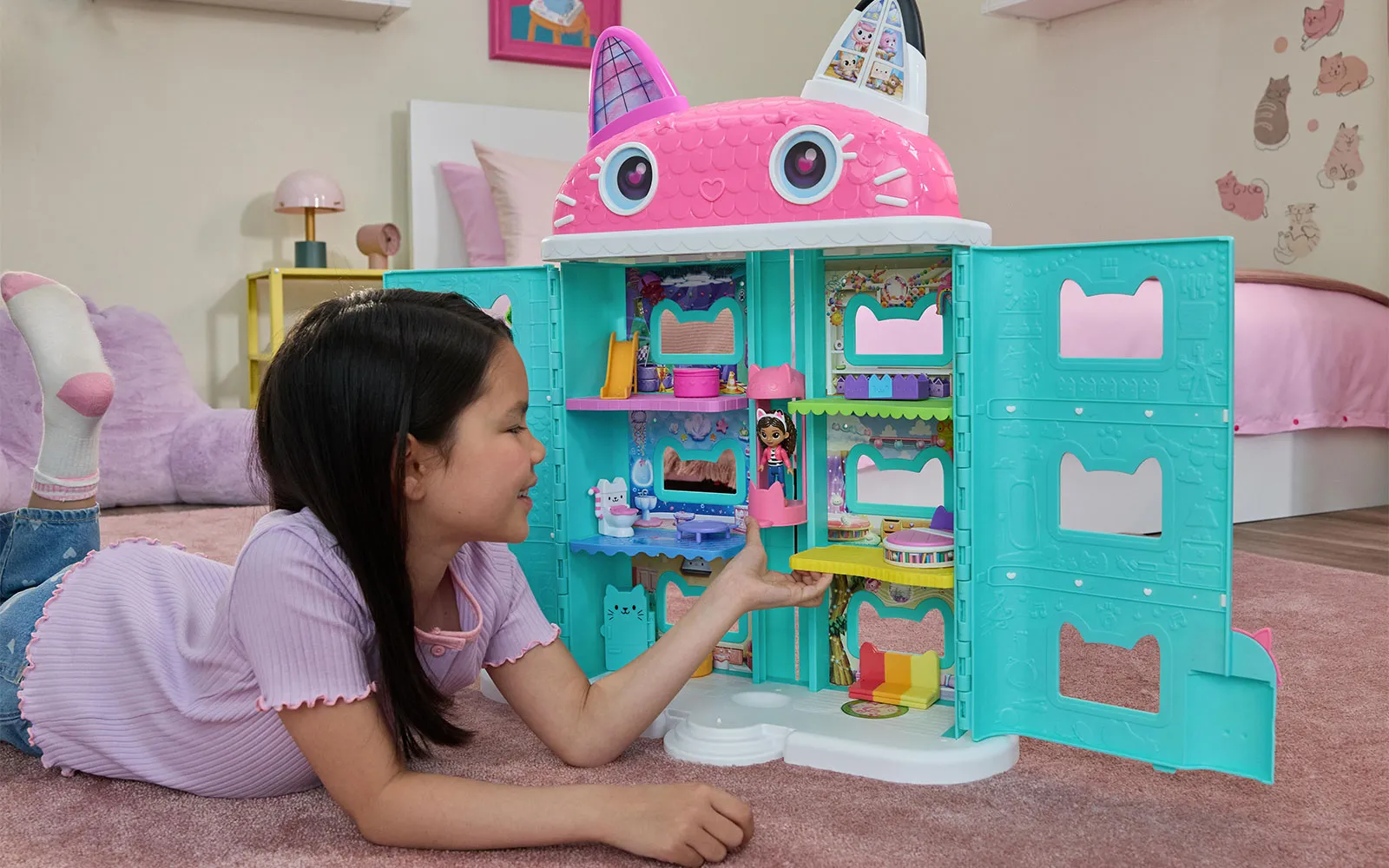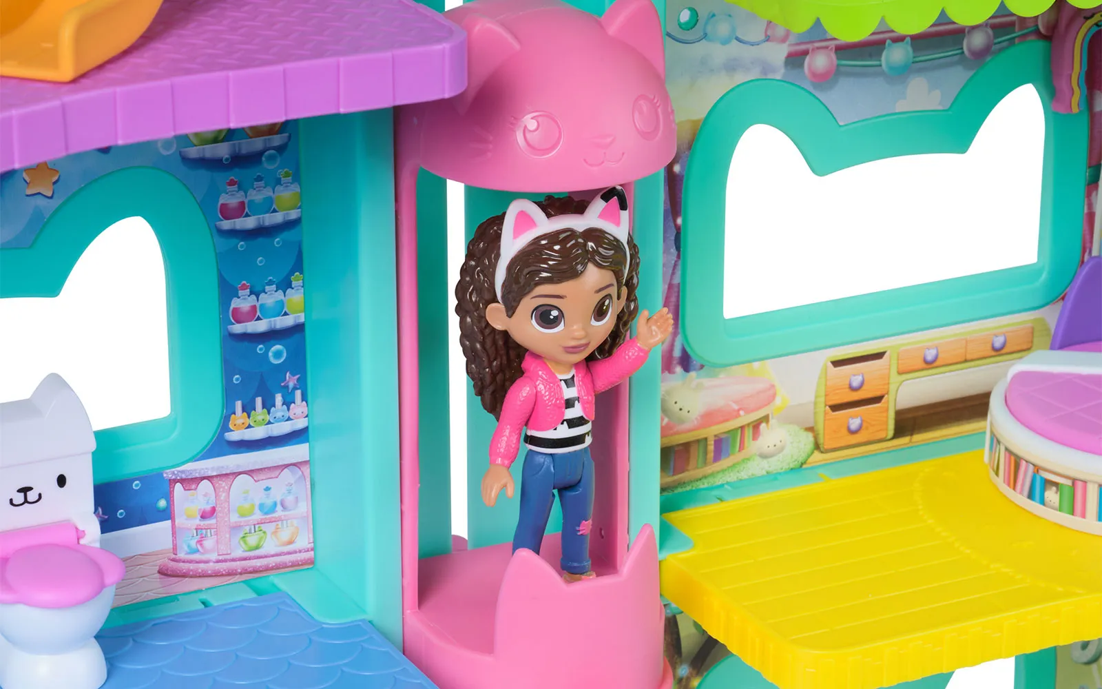 Odkrijte čarobni svet Gabbyjine mijavkajoče hišice za punčke, visoke več kot 60 cm, s čarobnimi gibljivimi očmi, šestimi čudovitimi mačjimi sobami in zabavno sobo v 4. nadstropju, ki jo lahko raziščete s pomočjo Cat-a-vatorja; komplet vključuje ekskluzivno figurico Gabby Girl iz filma Gabby's Dollhouse: The Movie s prepoznavnim trakom za lase v obliki mačjih ušes ter več kot 15 dodatkov, vključno s pohištvom, nalepkami in dekoracijo – popoln komplet za ustvarjanje lastnega domišljijskega sveta, ki spodbuja ustvarjalno igro in navdušuje vse male oboževalce Gabbyjine hišice za punčke. Hiška omogoča igro v 360 stopinjah.