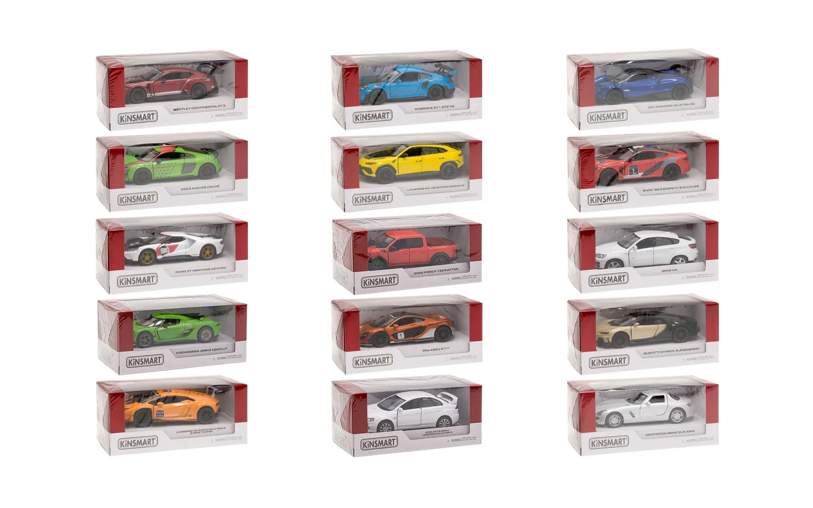 Raznoliki, barviti kovinski modeli vozil s posameznimi plastičnimi deli, ki imajo povleci-spusti pogon. Vozila znamk Porsche, Aston Martin, Lamborghini, Ford, McLaren, Pagani, ... so odlične imitacije pravih vozil. Vrata na vozilih se odpirajo.
