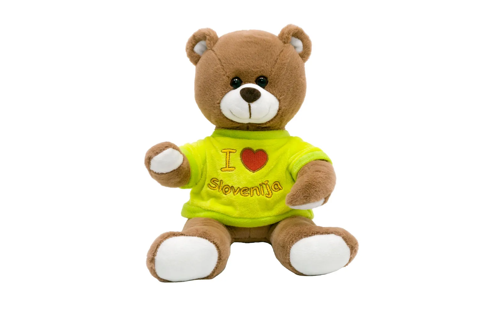 Prikupen plišast rjav medvedek z zeleno majico, ki ima napis I love Slovenija, je velik 20 cm.