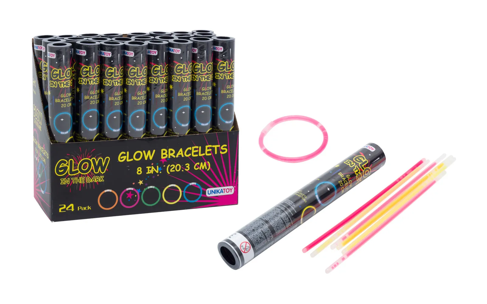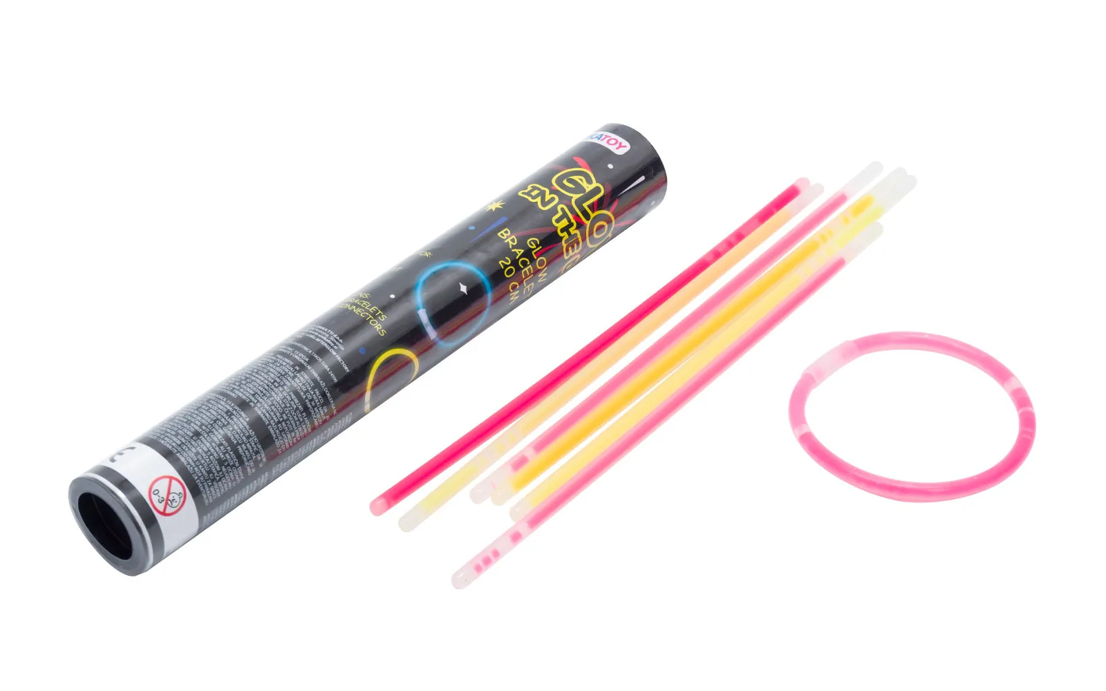 Set vsebuje 15 svetlečih zapestnic rumene, oranžne, roza, modre ali zelene barve.Palico aktivirate tako, da jo zvijete, prelomite in stresete. Da se aktivira polni sijaj, lahko traja nekaj minut. Ko palico zvijete, jo spojite s priloženo spojko in dobite zapestnico.