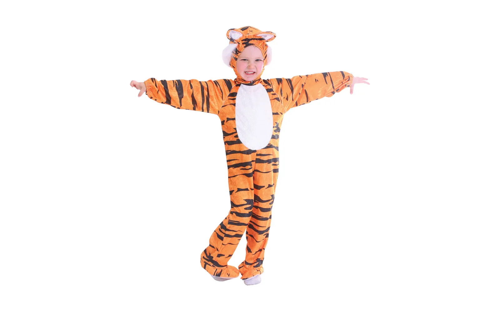 Pustni kostum tiger za najmlajše vsebuje obleko in kapuco, nogavice niso priložene. Zdaj si mali poskočen tigerček, ki se zabava na pustovanju. Velikost 80-92 cm ter 92-104 cm. Sestava: 100% POLIESTER