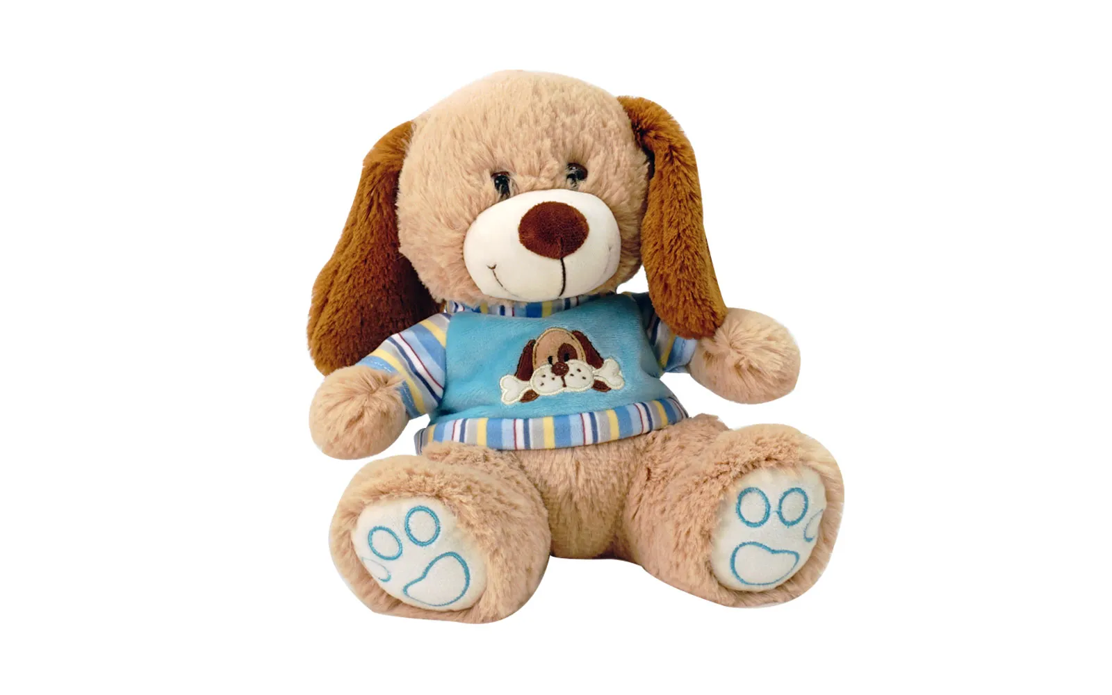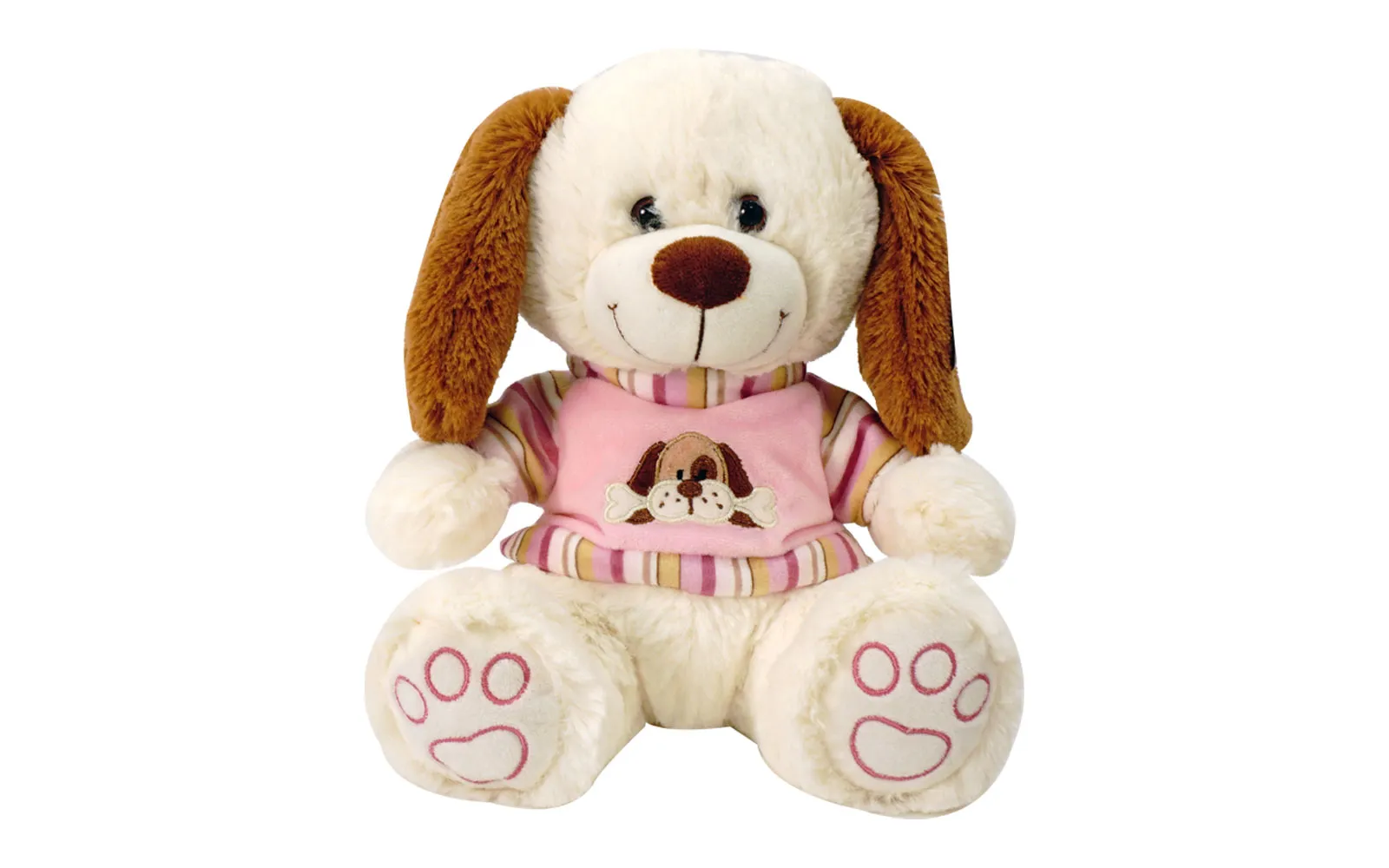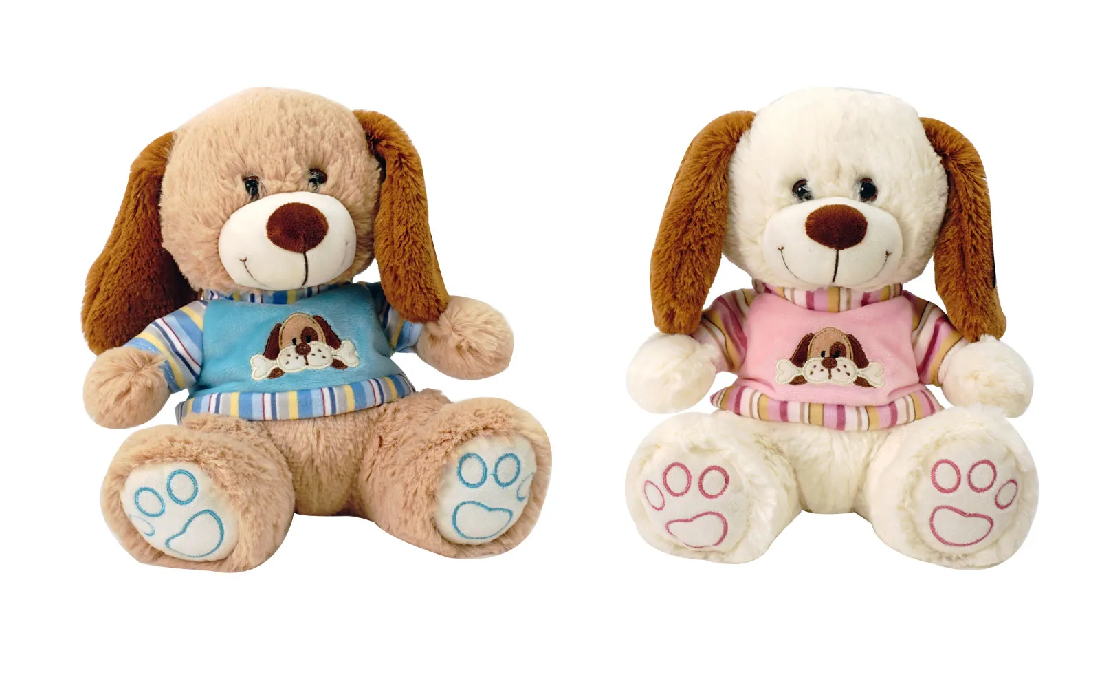 Sedeči kužek z majico v velikosti 23 cm, Unikatoy. Kužek je na voljo v dveh različnih barvah.