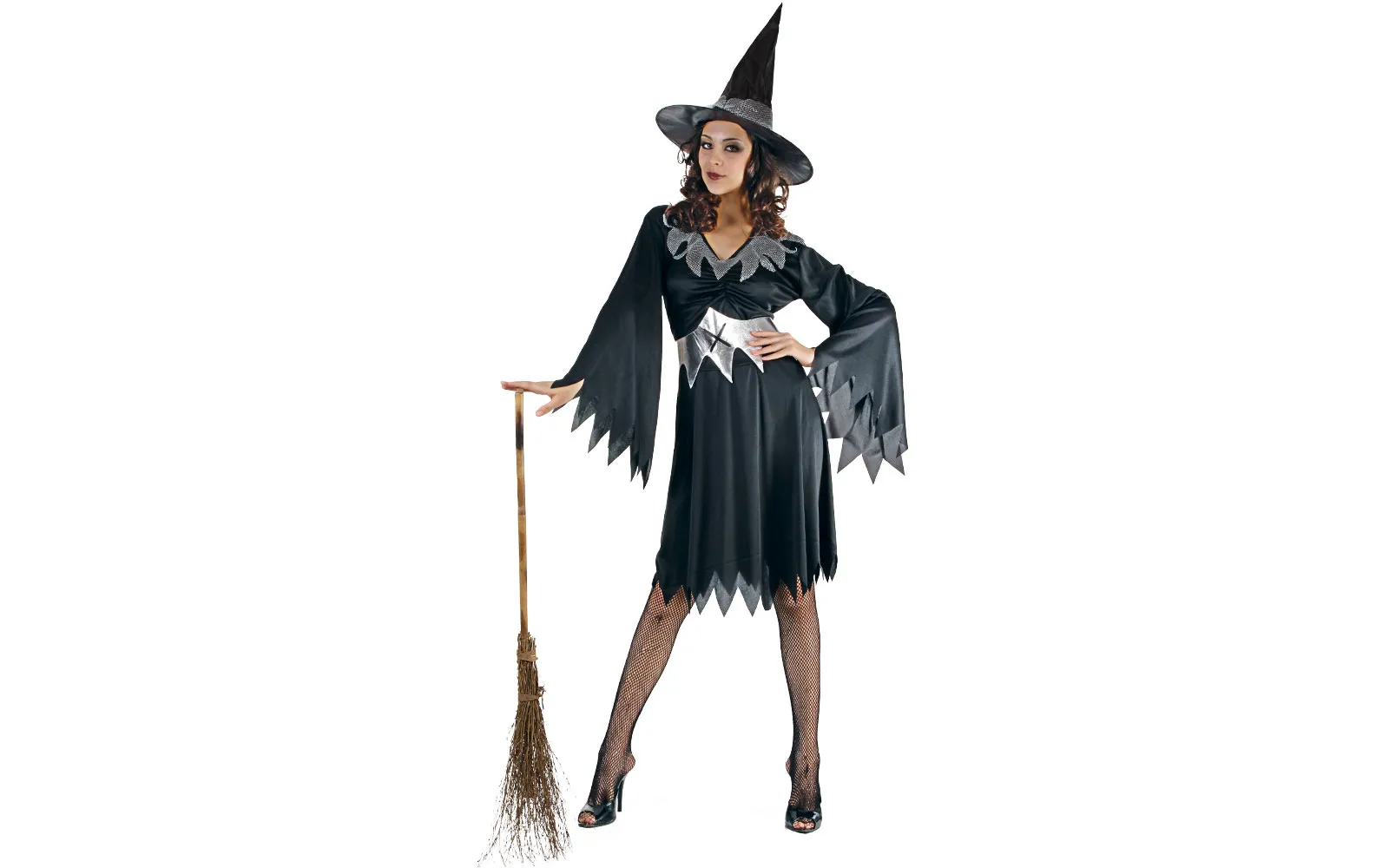 Odrasli kostum srhljive čarovnice za vse ljubiteljice mračnega izgleda.Kostum je na voljo v univerzalni velikosti L. Vsebina: obleka, klobuk, pas (čevlji, metla in nogavice niso priloženi). Sestava: 100% POLIESTER