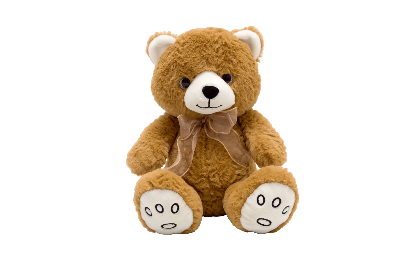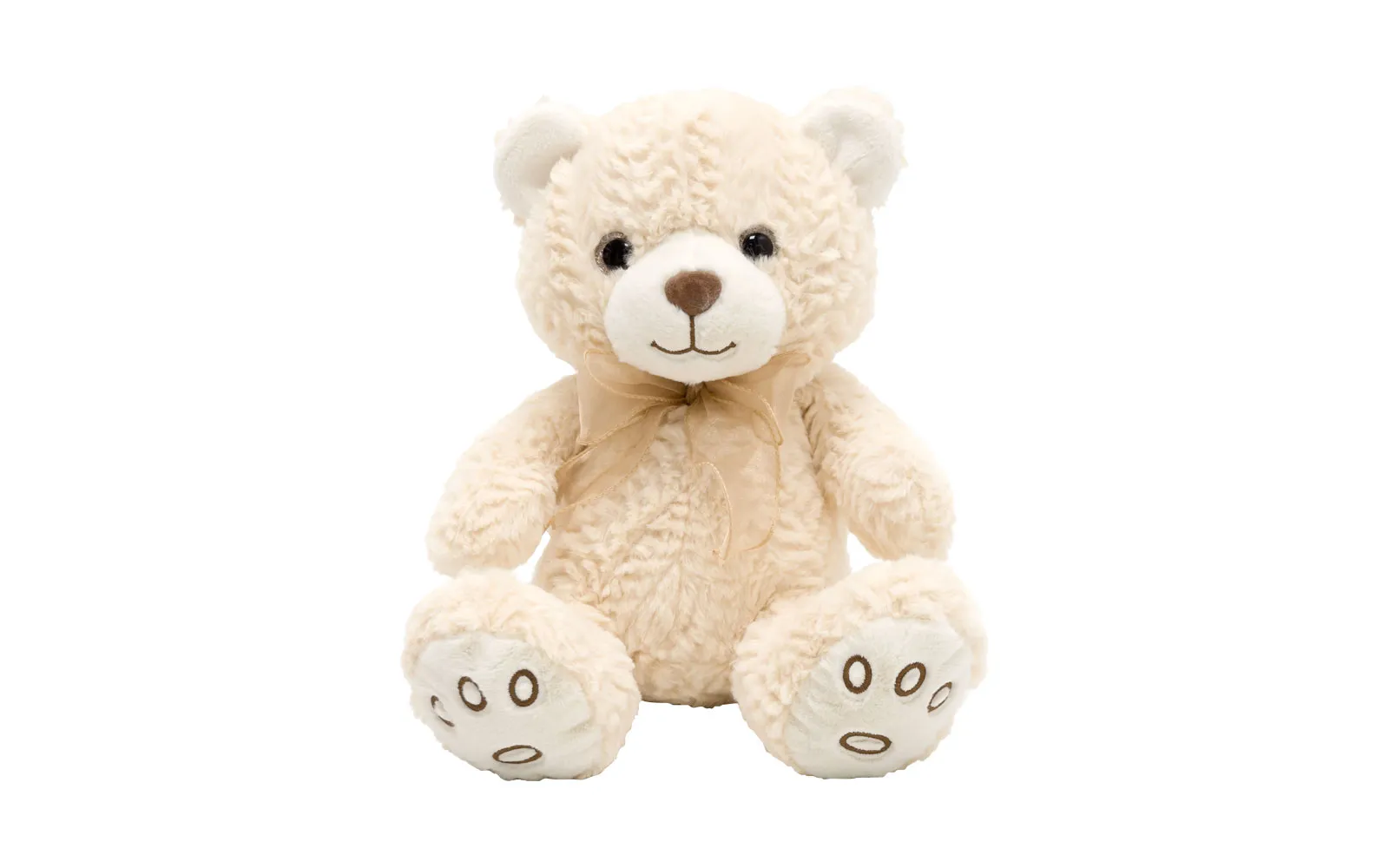Plišasti sedeči medo z mašno iz svile v velikosti 28 cm s v bež ali oker barvi.
