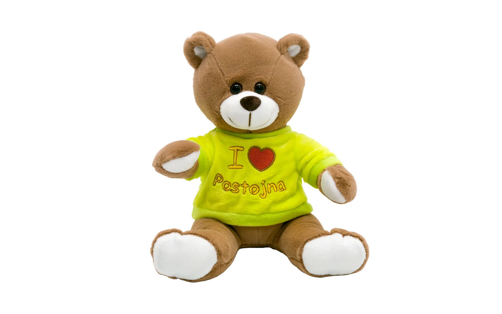 Prikupen plišast rjav medvedek z zeleno majico, ki ima napis I love Postojna, je velik 20 cm.