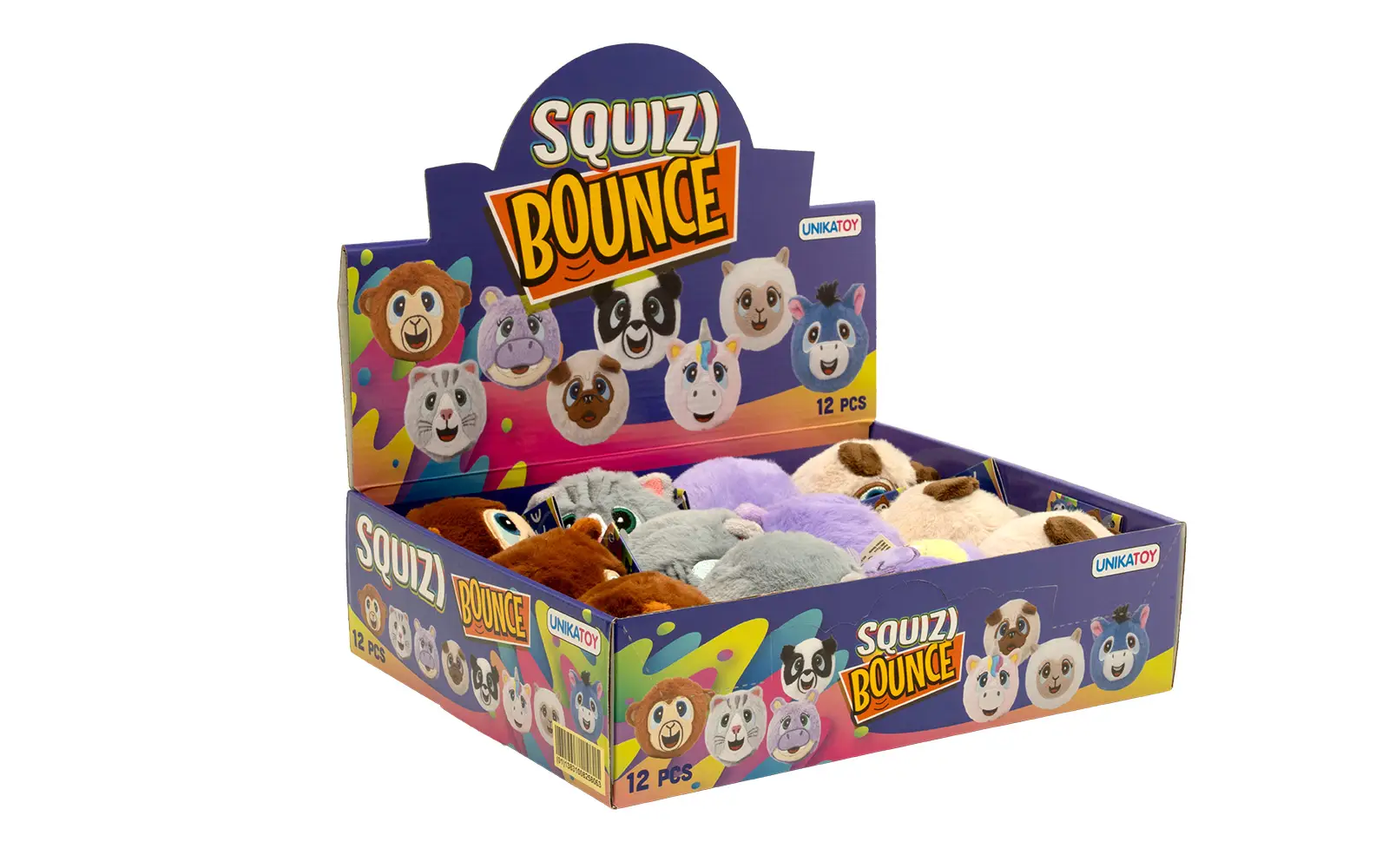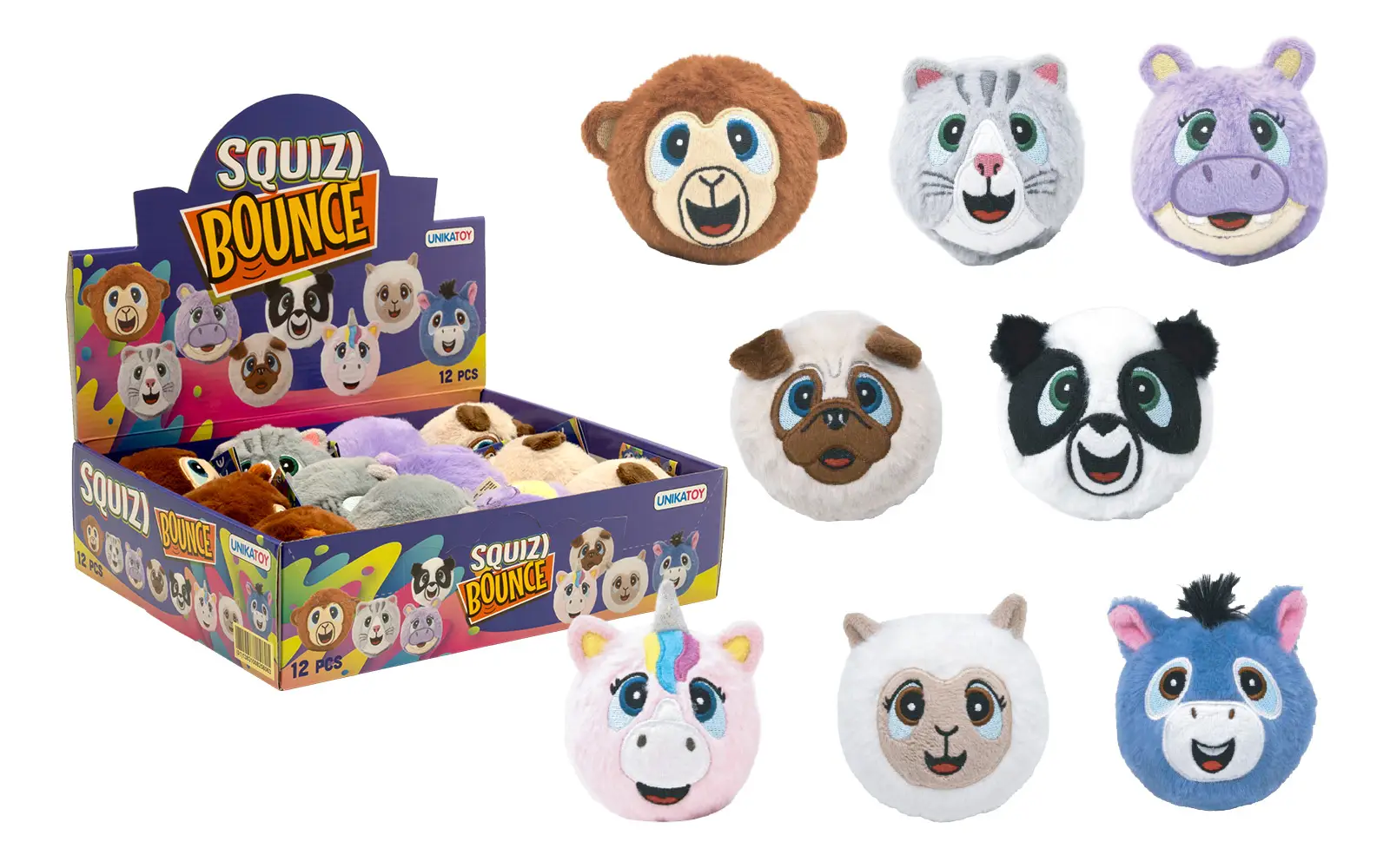 Plišasta žogica Bounce, 7 cm, Squizi, Unikatoy. Izberi svoj motiv žogice in se igraj s prijatelji. Na voljo v stilu Charlie, Trish, Doug, Petunia, Dazzle, Meimei, Hughie ter Fluffy.