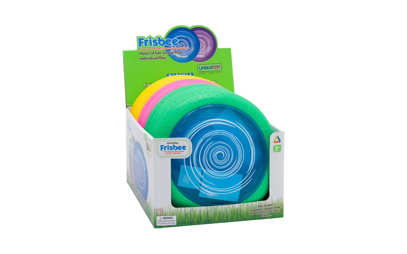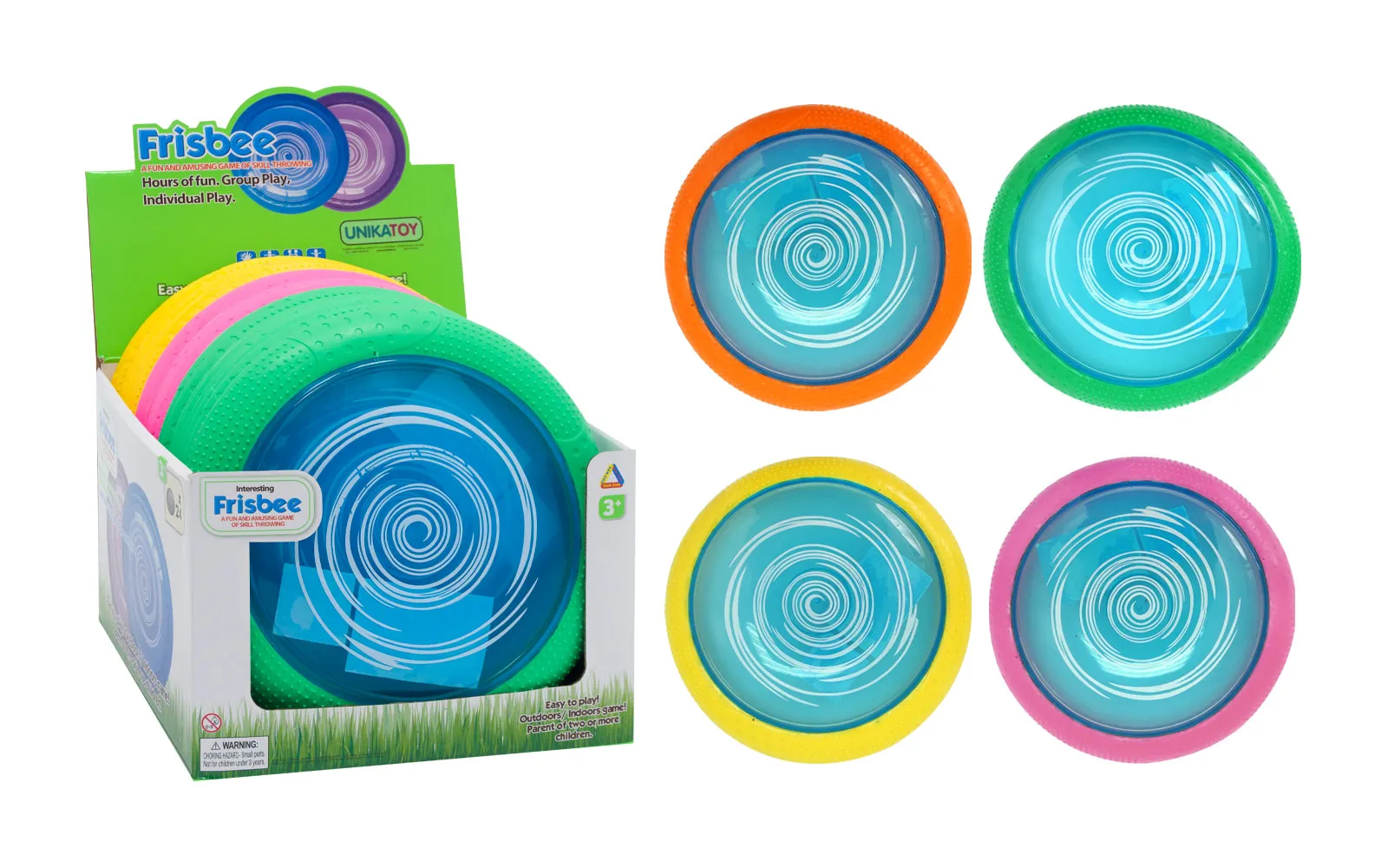 Za zabaven oddih na prostranih poljanah s frizbijem premera 24 cm. Frizbi v različnih barvnih kombinacijah ima na robu mehko gumo.