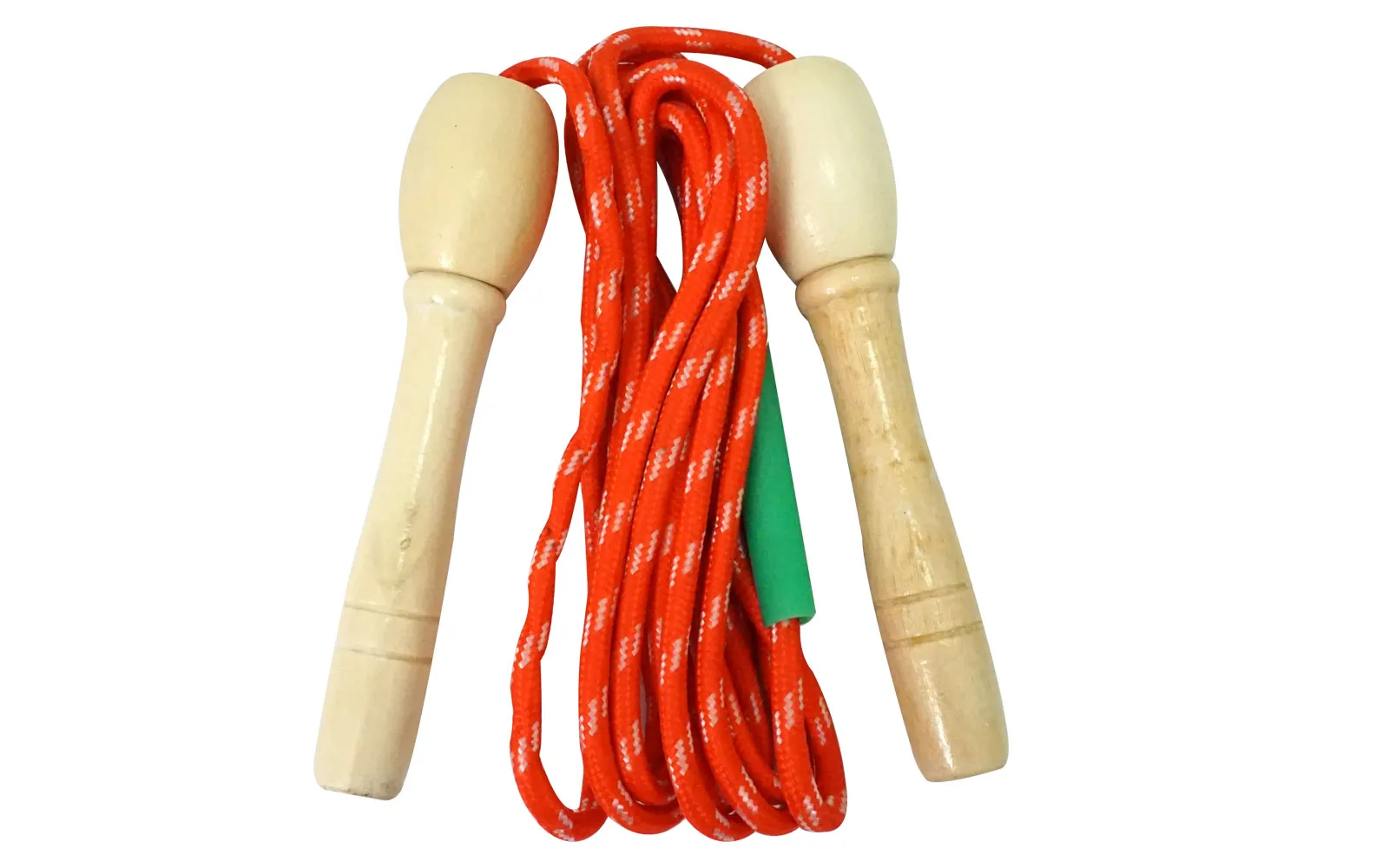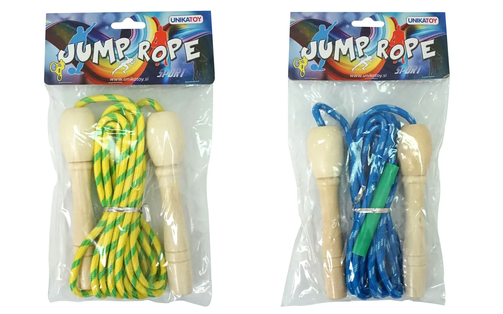 Skoči z levo, skoči z desno, preskoči 300 cm dolgo vrv kolebnice z lesenim ročajem z levo in desno nogo naenkrat. na razpolago imaš tri različne barvne kombinacije kolebnic.