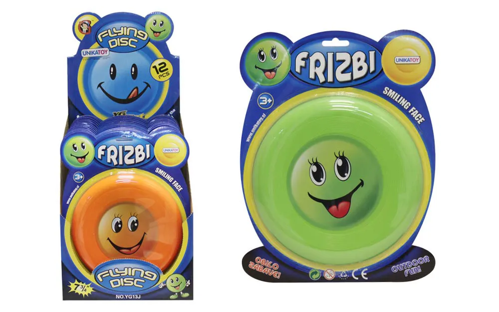 Nagajiv pogled, prisrčen nasmeh? Kdo ga ima? Frizbi premera FIi 20 cm v rumeni, oranžni, modri ali zeleni barvi.