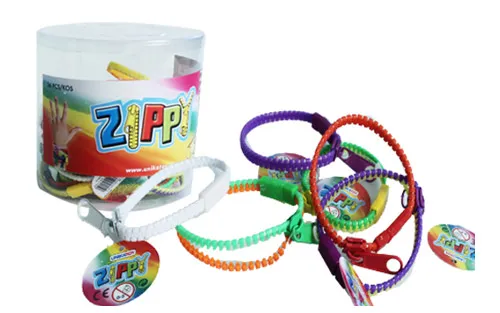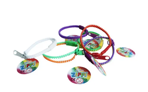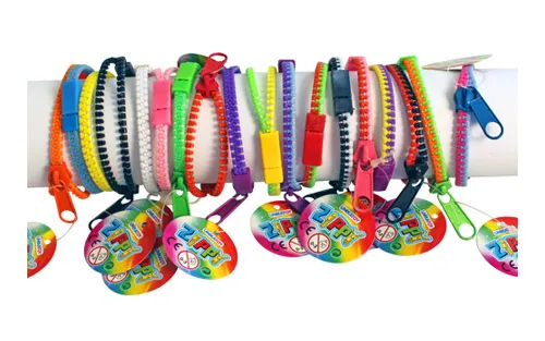 Noro zabavne, zelo uporabne so 20 cm dolge zapestnice zippy na zadrgo. Zapestnice zippy v devetih enojnih barvah ali devetih dvojnih barvnih kombinacijah si lahko nadenete okrog roke, iz njih naredite verižico in si jo nadenete okrog vratu, lahko ustvarite obesek za ključe. Skratka, načinov uporabe je mnogo, odločitev je vaša.