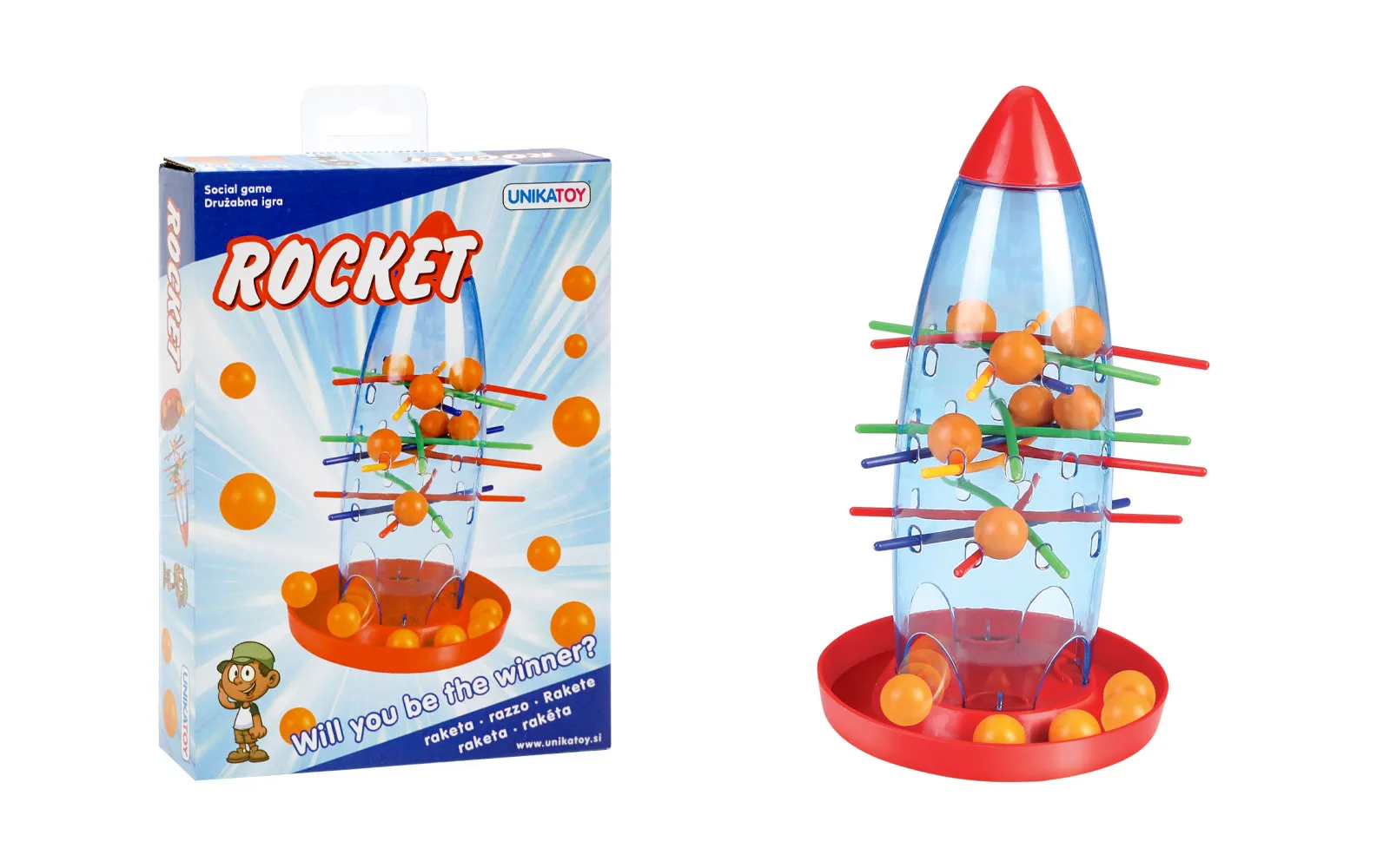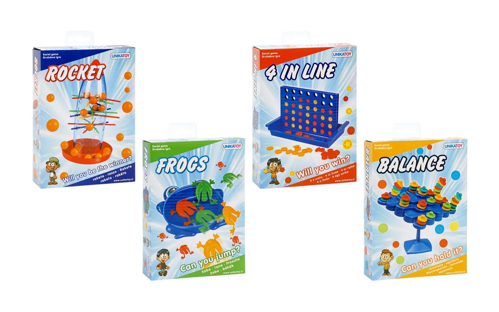 Miks petih različnih malih družabnih iger: igra štiri v vrsto, ravnotežje, raketa ali žabice.