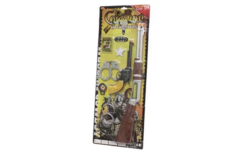 Set vsebuje puško western ter raznovrstne pripomočke za igro in zabavo. Puška ni baterijska.