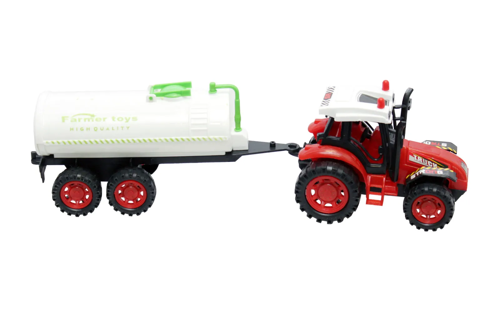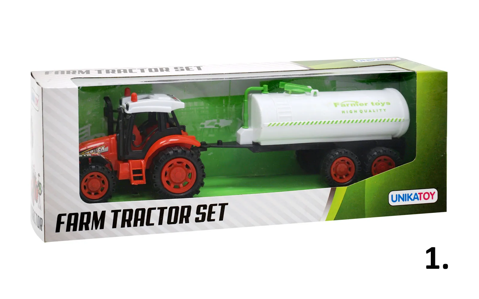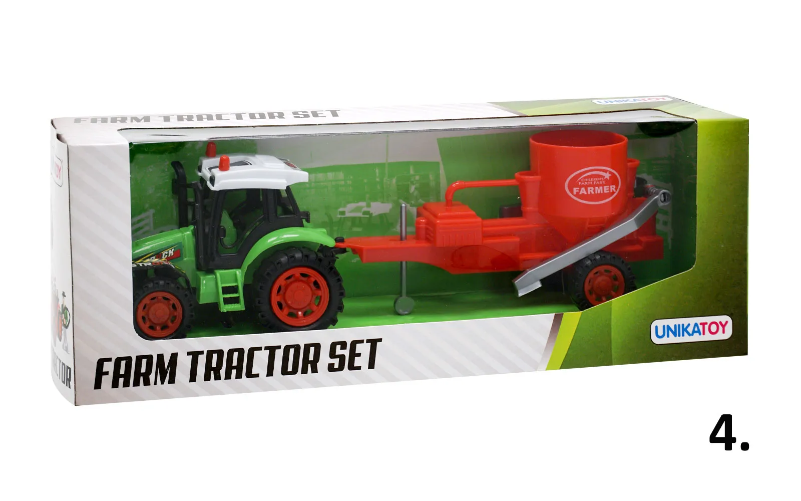 Pričaraj si kmečko življenje s pomočjo kmetijskih strojev: traktorja dveh različnih barv (rdeče ali zelene) s štirimi različnimi priključki. Set vsebuje traktor na frikcijski pogon ter enega od treh priključkov velikosti cca. 33 cm..