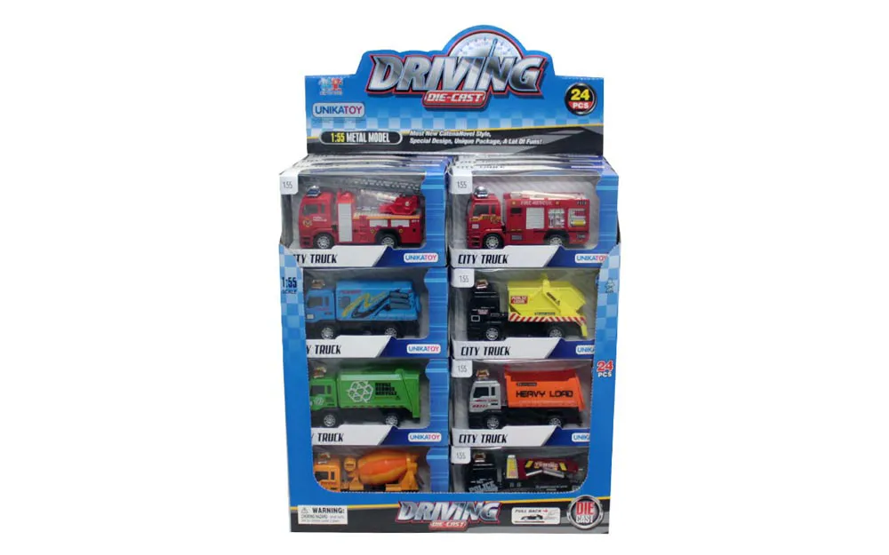 Kovinski modeli kamionov s posameznimi plastičnimi deli 8 različnih stilov v razmerju 1:55 imajo povleci-spusti pogon. Naj se akcija za kamioniste začne z raznovrstnimi kamioni.