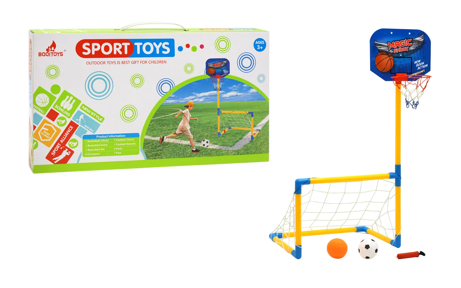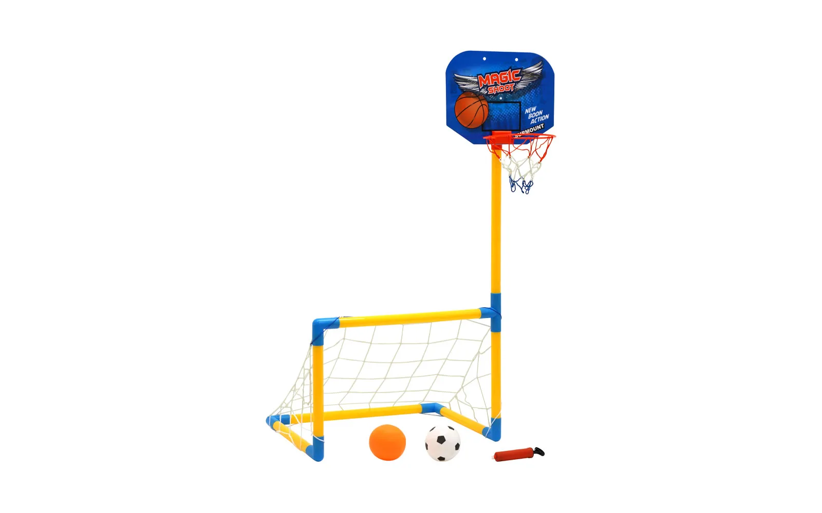 Set vsebuje 1 žogo za košarko fi 10 cm, 1 žogo za nogomet fi 10 cm, tlačilko ter gol skupaj s košem dimenzije 48x97x34 cm. Vrzi žogo na koš ali brcni žogo v gol. Odločitev je tvoja. Gol-koš lahko postaviš v stanovanje, če pa uporabiš priložena klina, se lahko zabavaš tudi na travi. Palice gola in spojke so iz PVC materiala.