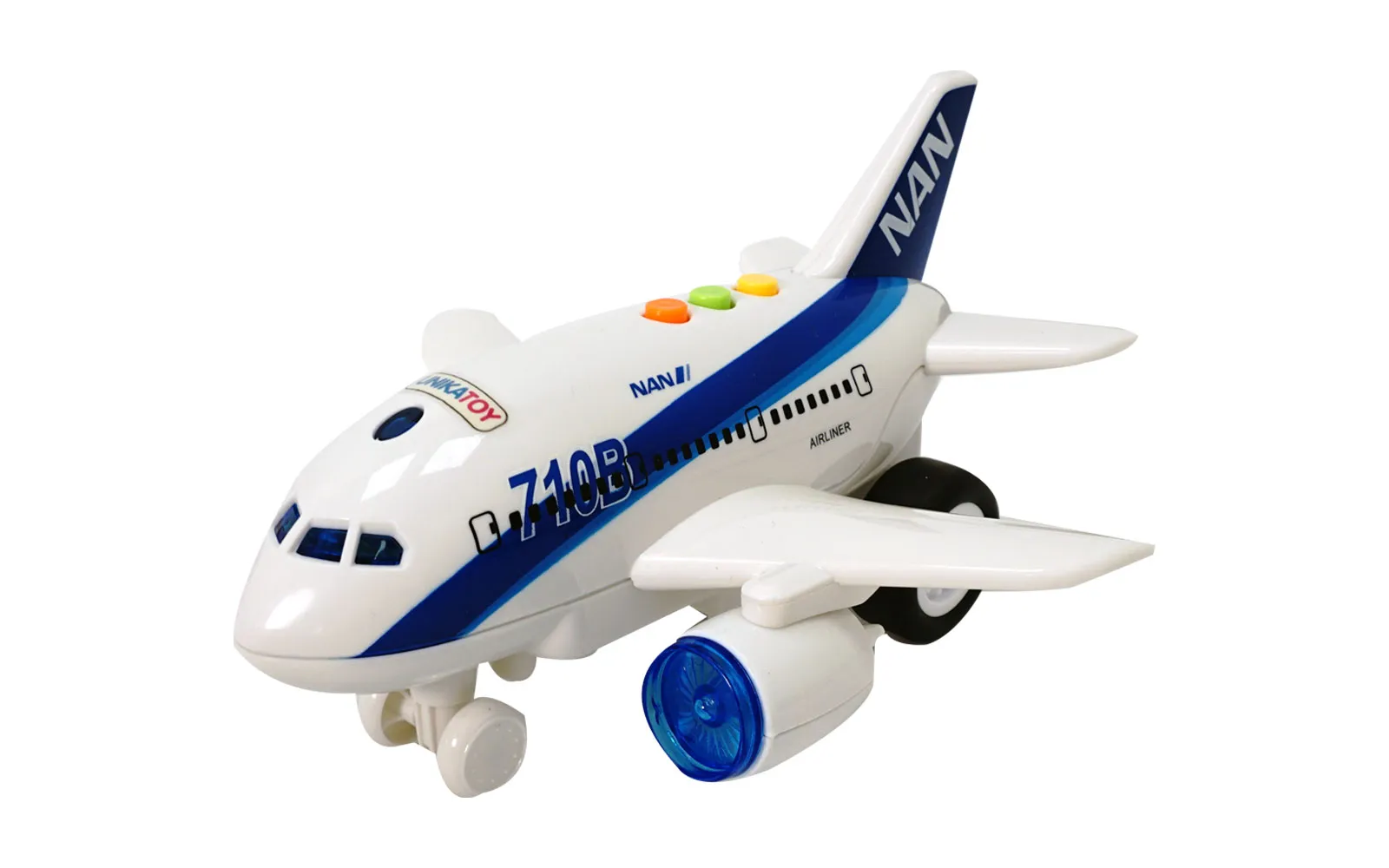 20 cm veliko potniško letalo na frikcijski pogon ima utripajoče luči in različne zvoke. Za delovanje potrebuje 3 baterije tipa AG13 (LR44) 1.5 V, ki so priložene v demonstracijke namene. Pripravi letalo na vzlet, popelji ga na pot.
