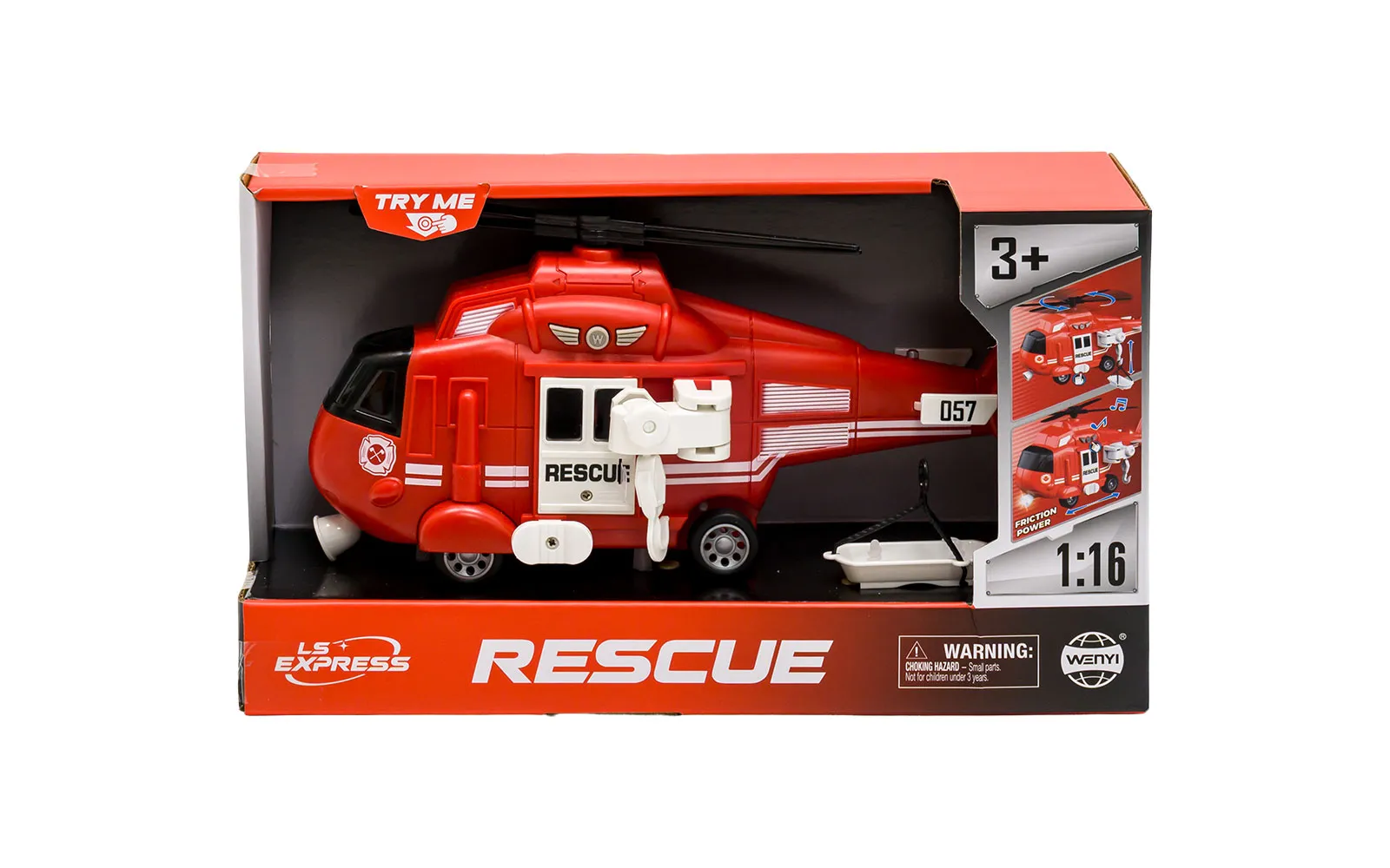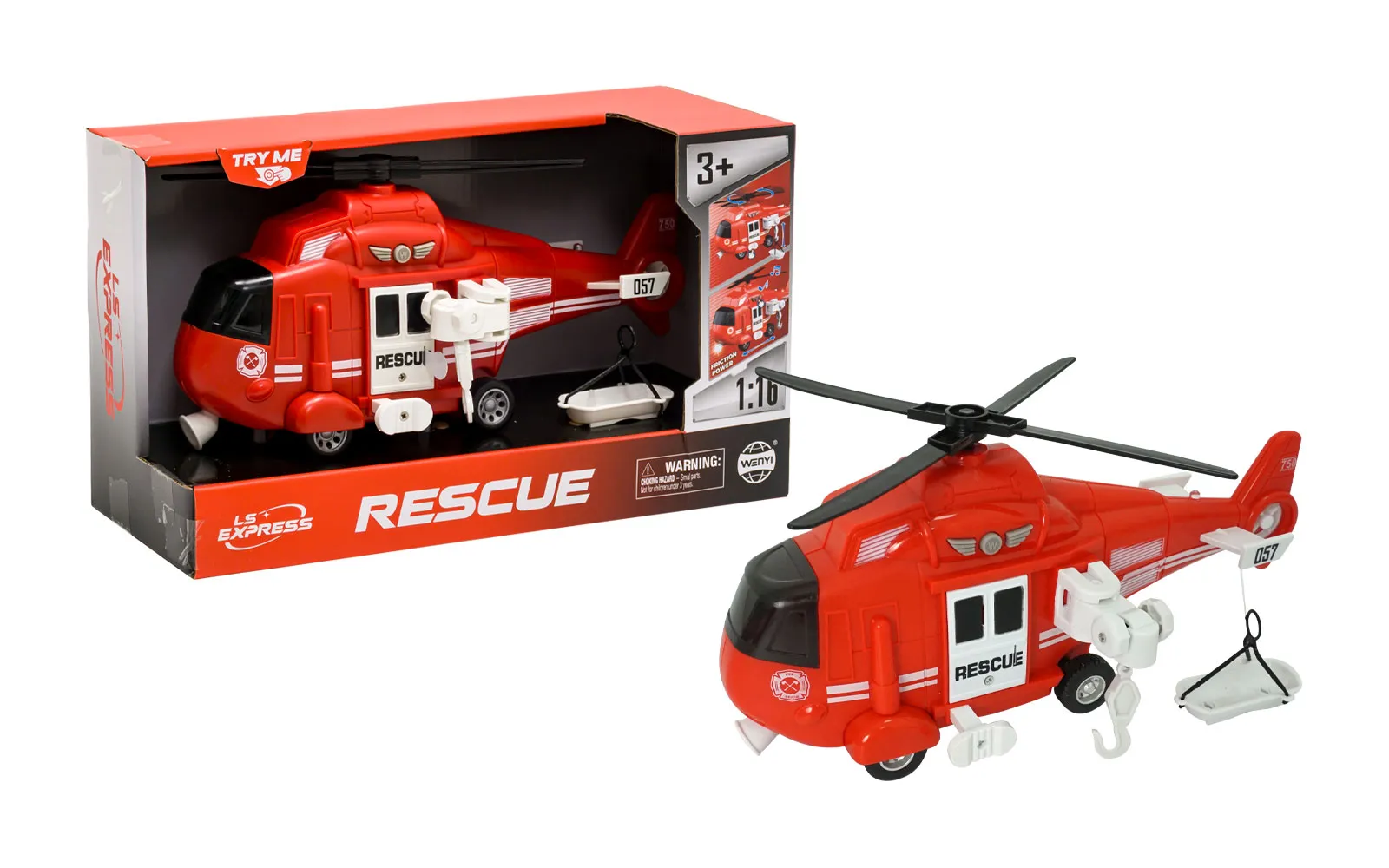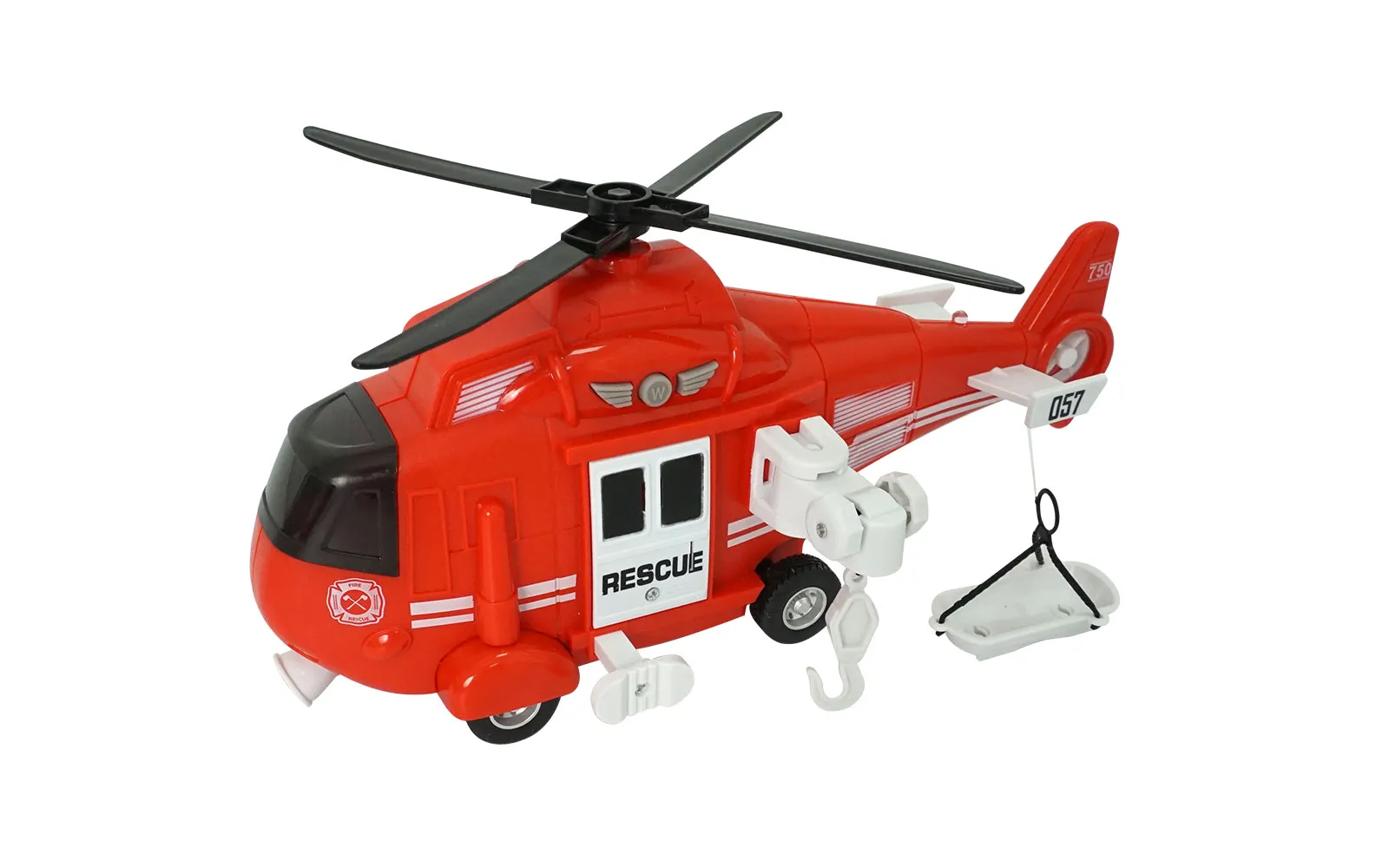 Baterijski reševalni helikopter velikosti 30 cm za delovanje potrebuje 3 baterije tipa AG13 (LR44) 1.5V. Pritisnite na gumb w nad vrati. Zaslišal se bo zvok, utripali bosta lučki. S pritiskom belega gumba se zavrti rotor na helikopterju. Z vrtenjem dveh malih belih gumbov pa dvigate ali spuščate priloženo reševalno nosilo. Vozilo ima frikcijski pogon.