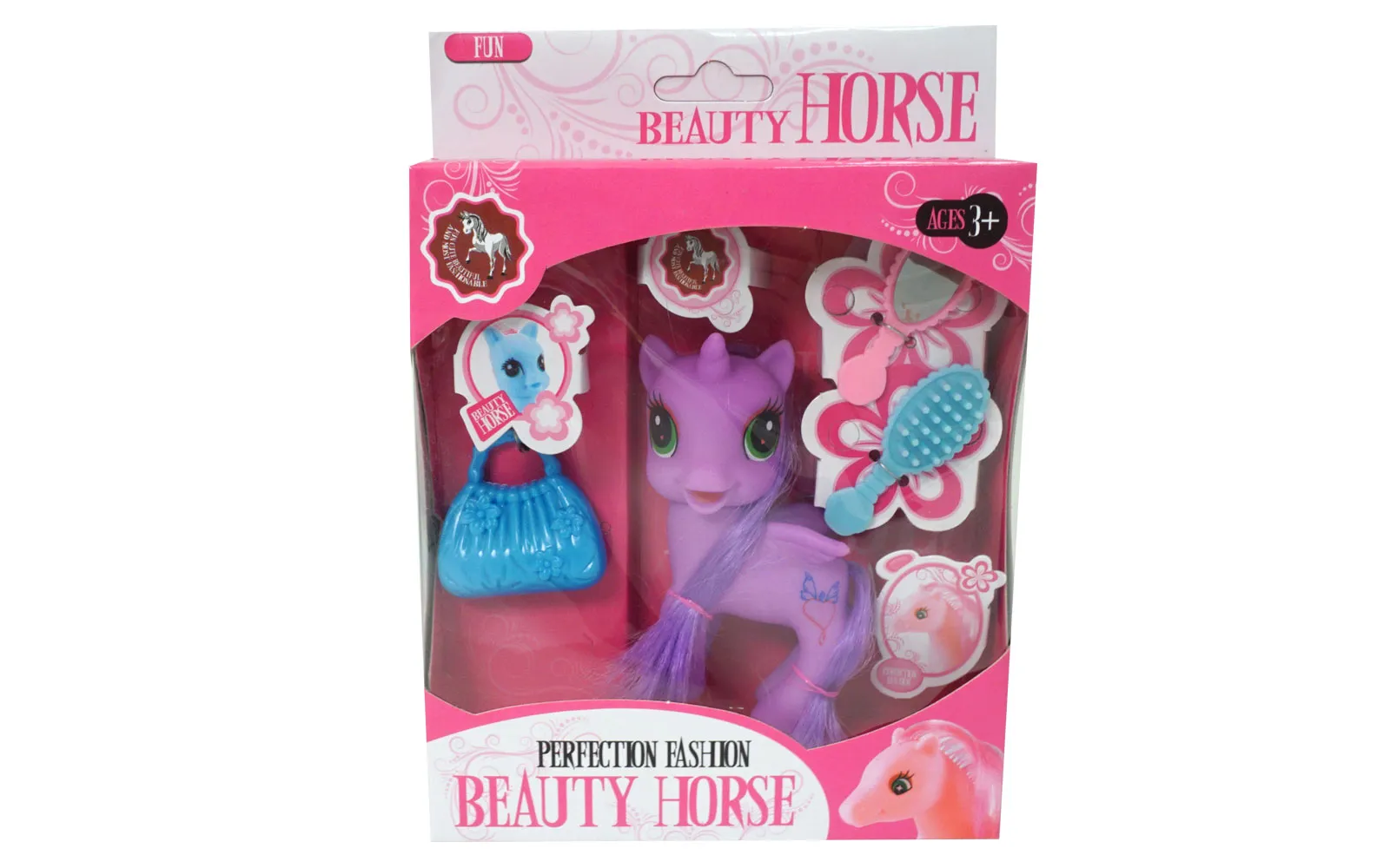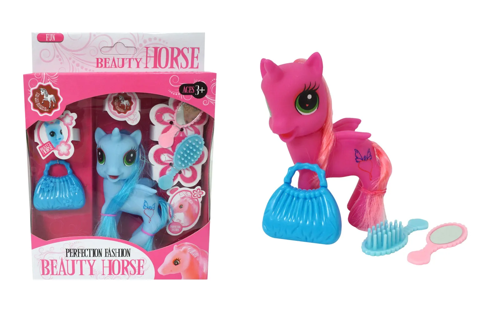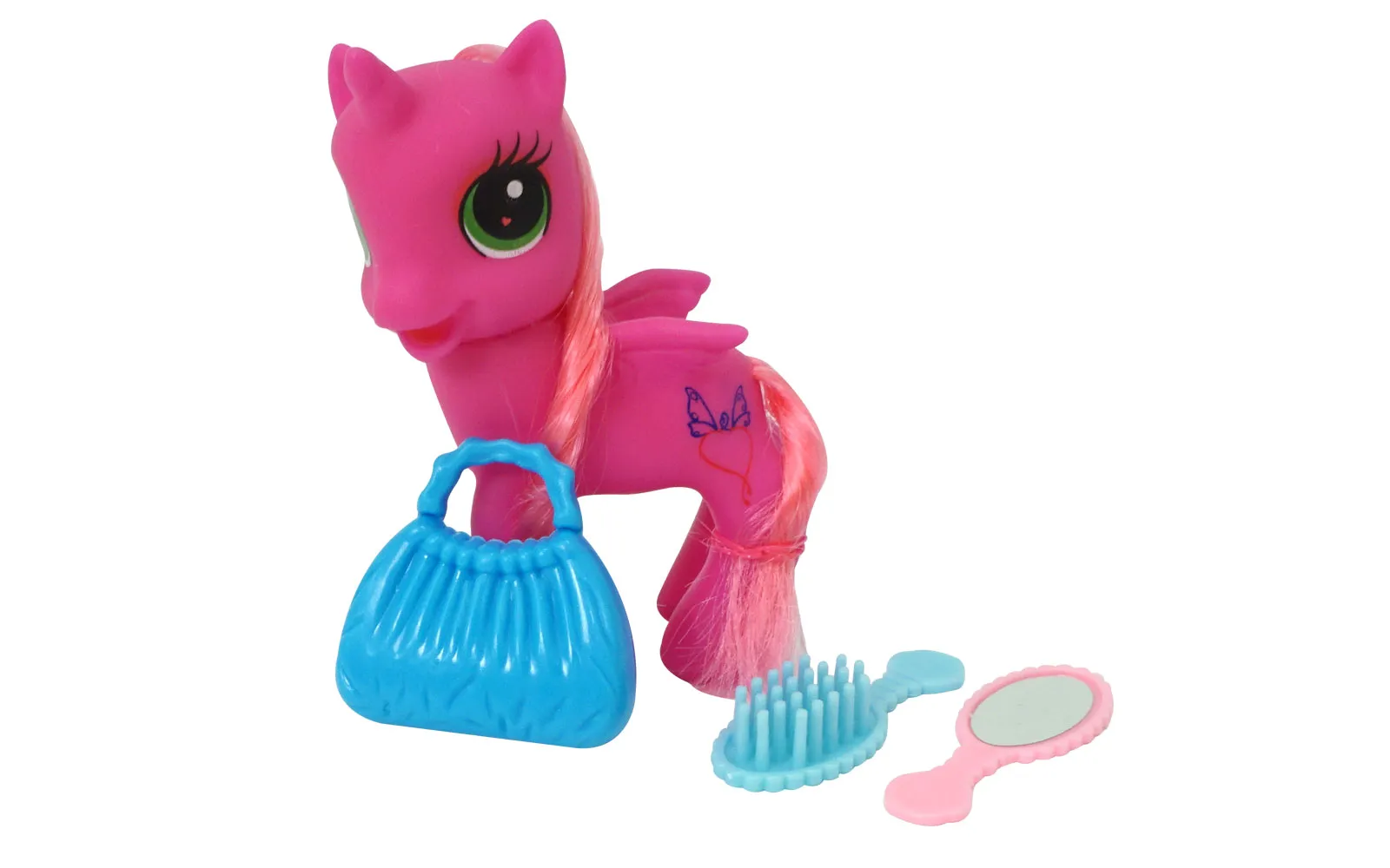 Konj pony z dolgo grivo roza, vijola, lila ali modre barve z dodatki. Konj Pony enorog višine cca 10.5 cm ima krila, narisano srce-metuljček na stegnu zadnje noge ter dodatek male torbice, glavnika in ogledalca.