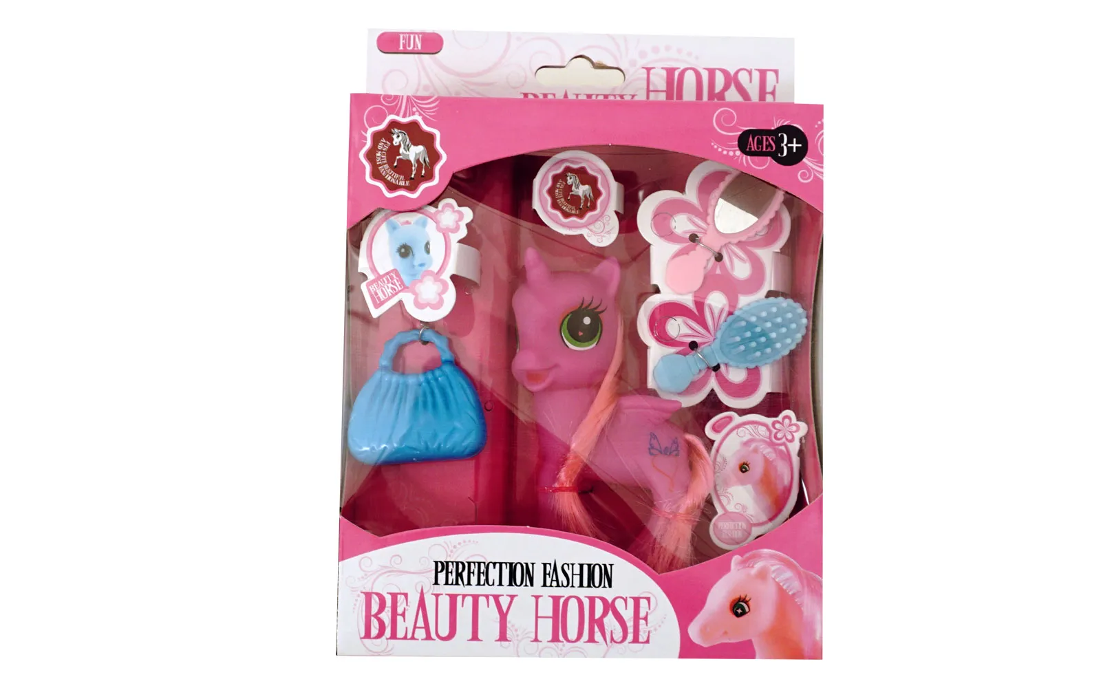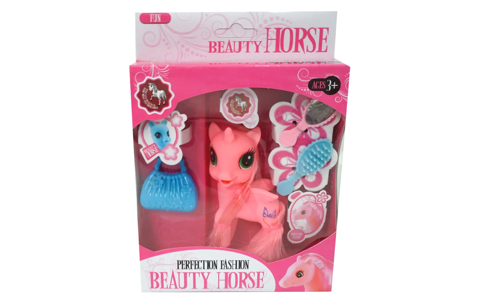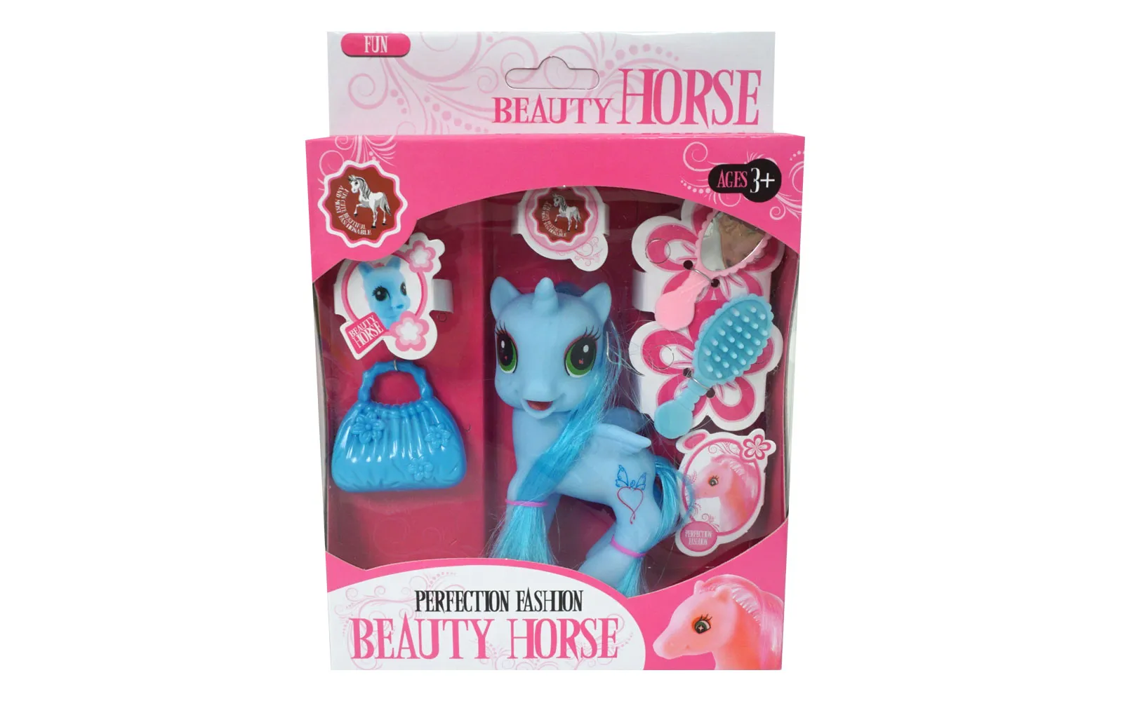 Konj pony z dolgo grivo roza, vijola, lila ali modre barve z dodatki. Konj Pony enorog višine cca 10.5 cm ima krila, narisano srce-metuljček na stegnu zadnje noge ter dodatek male torbice, glavnika in ogledalca.