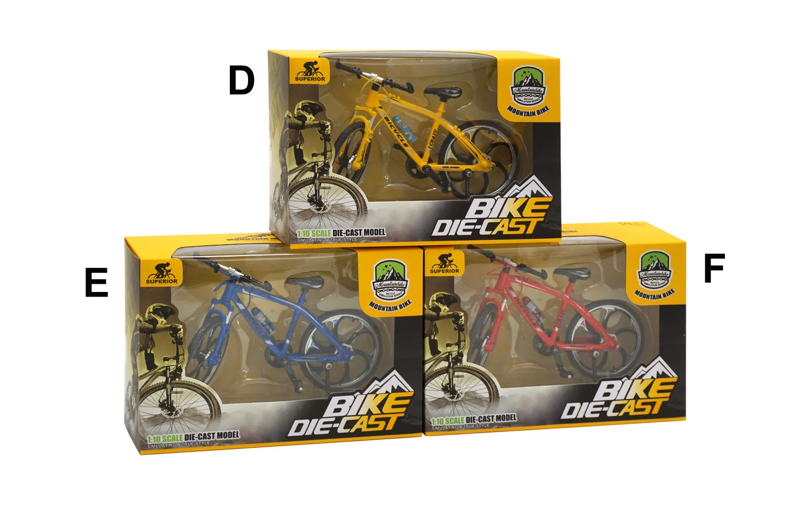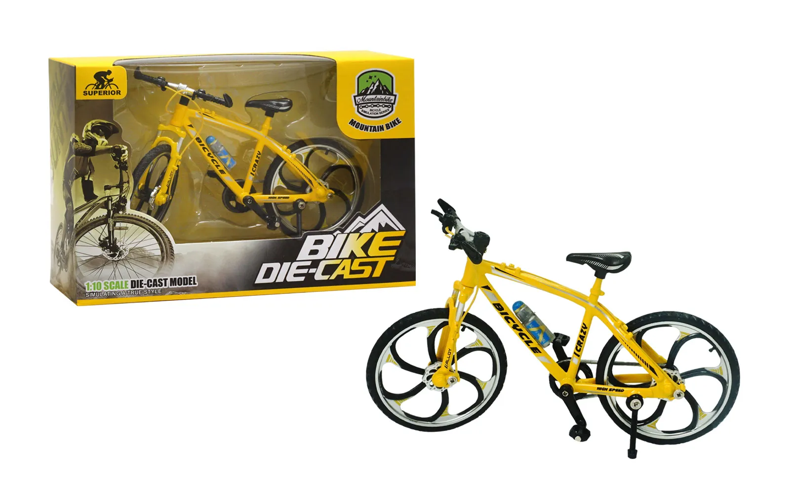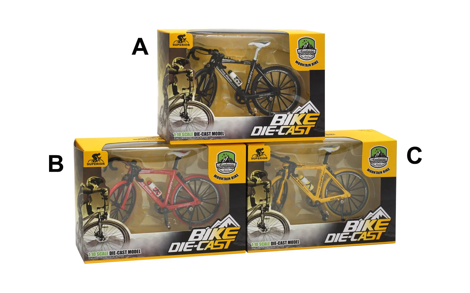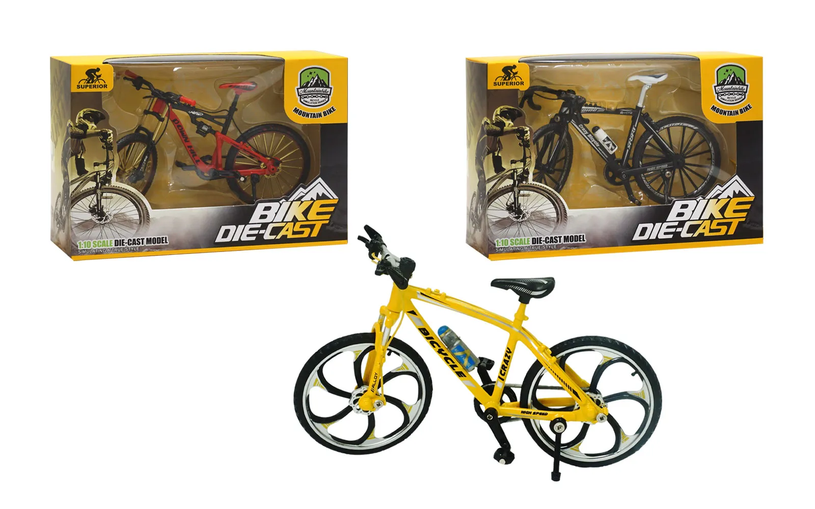 Raznovrstna kompaktna kolesa iz die cast materiala. Robustna cestna, gorska in down hill kolesa vas bodo pripeljala na vsako destinacijo! 17,5x6,5x11 CM. Na voljo v treh različnih barvah: oranžna, rumena ali rdeča.