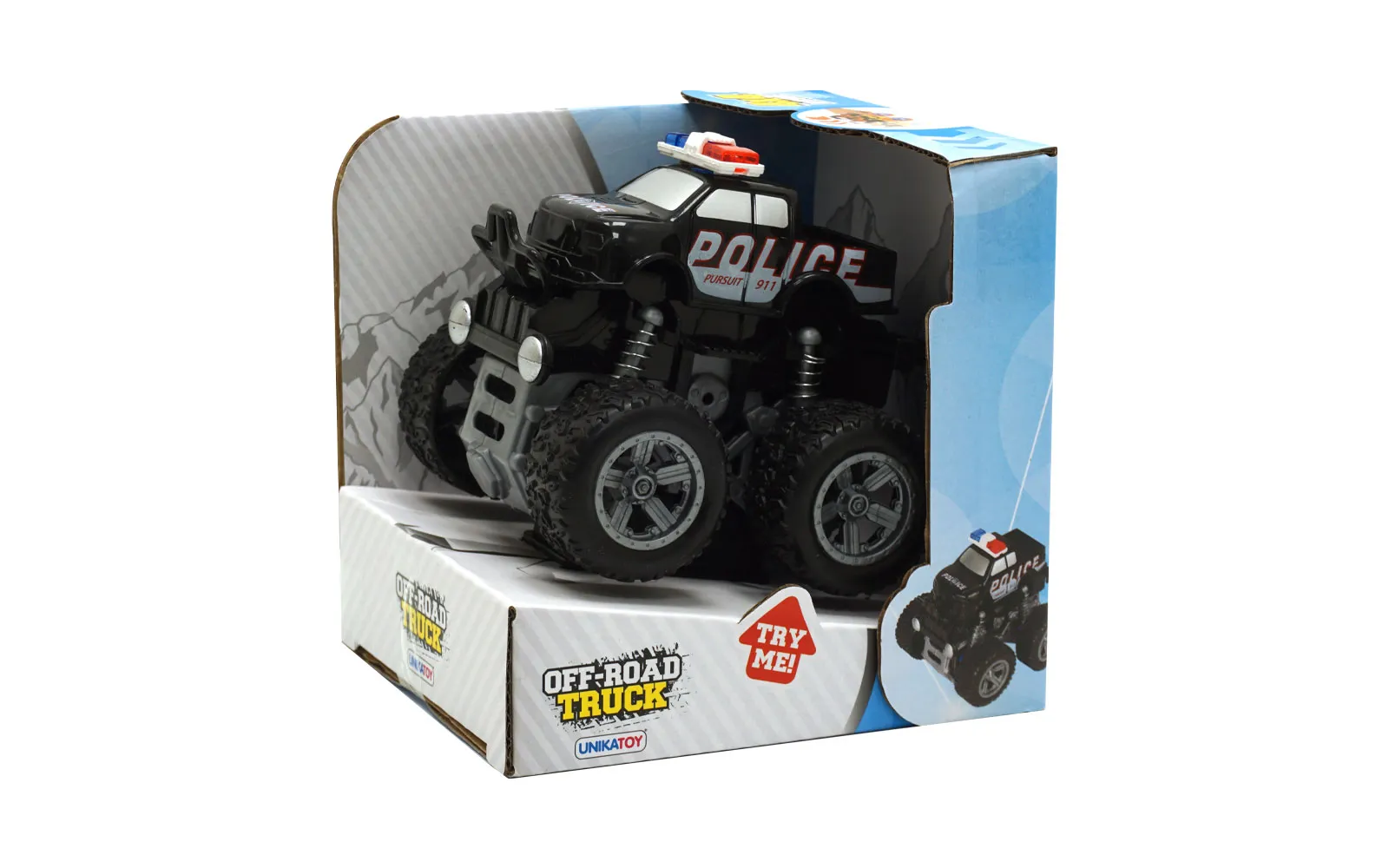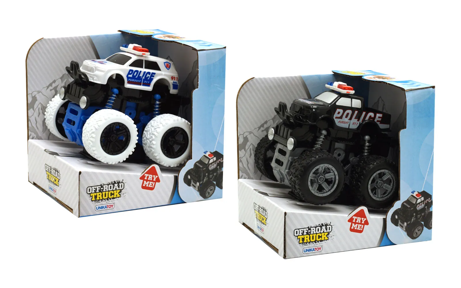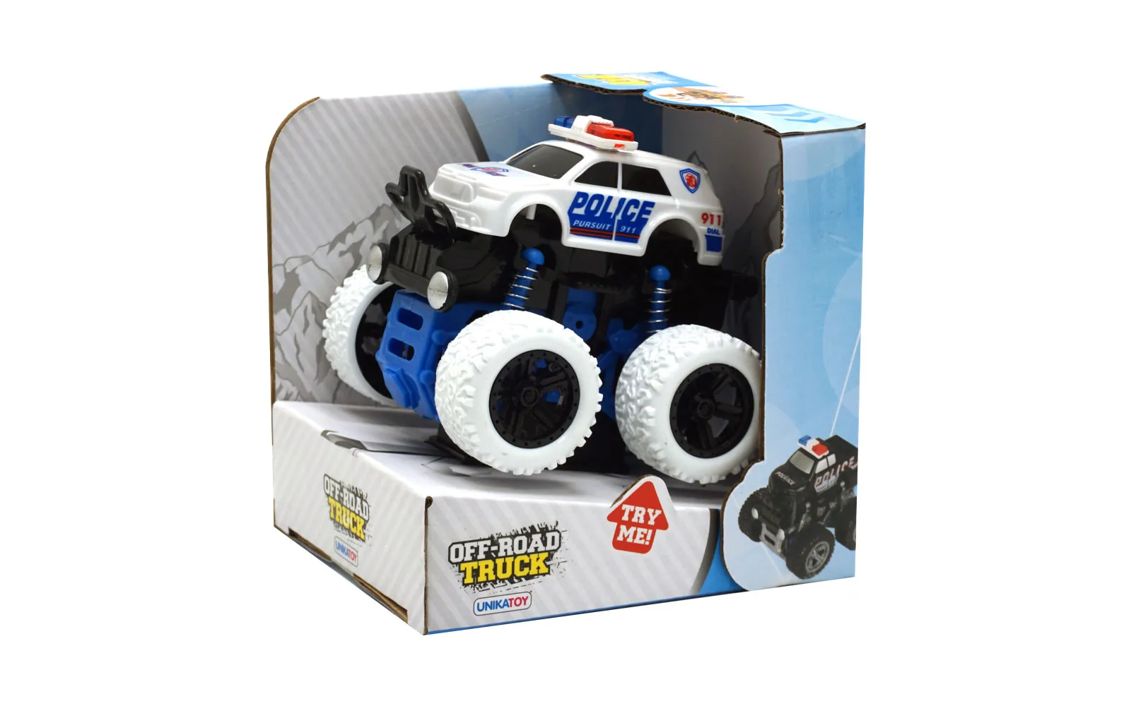 Policijski off road džip priznane blagovne znamke Unikatoy je velikosti 9 cm. Vozilo ima velika kolesa, super vzmetenje ter je atraktivnega videza. Na voljo v dveh različnih stilih. Izdelek je primeren za otroke od 3. leta starosti dalje.