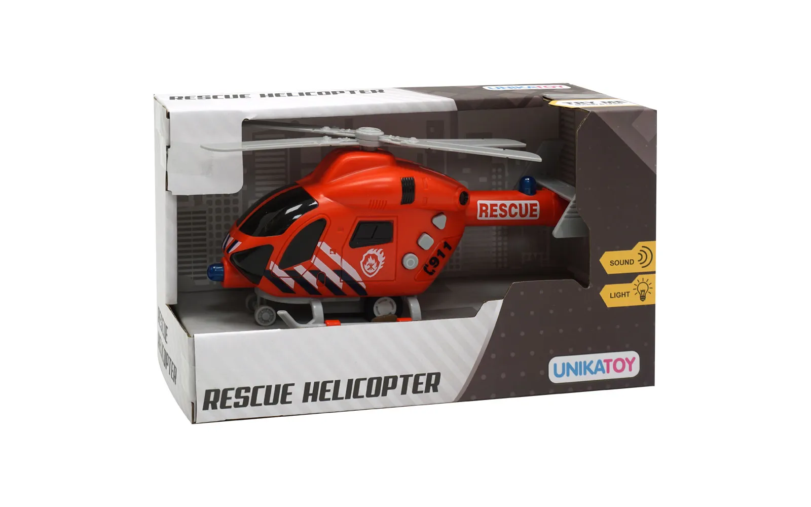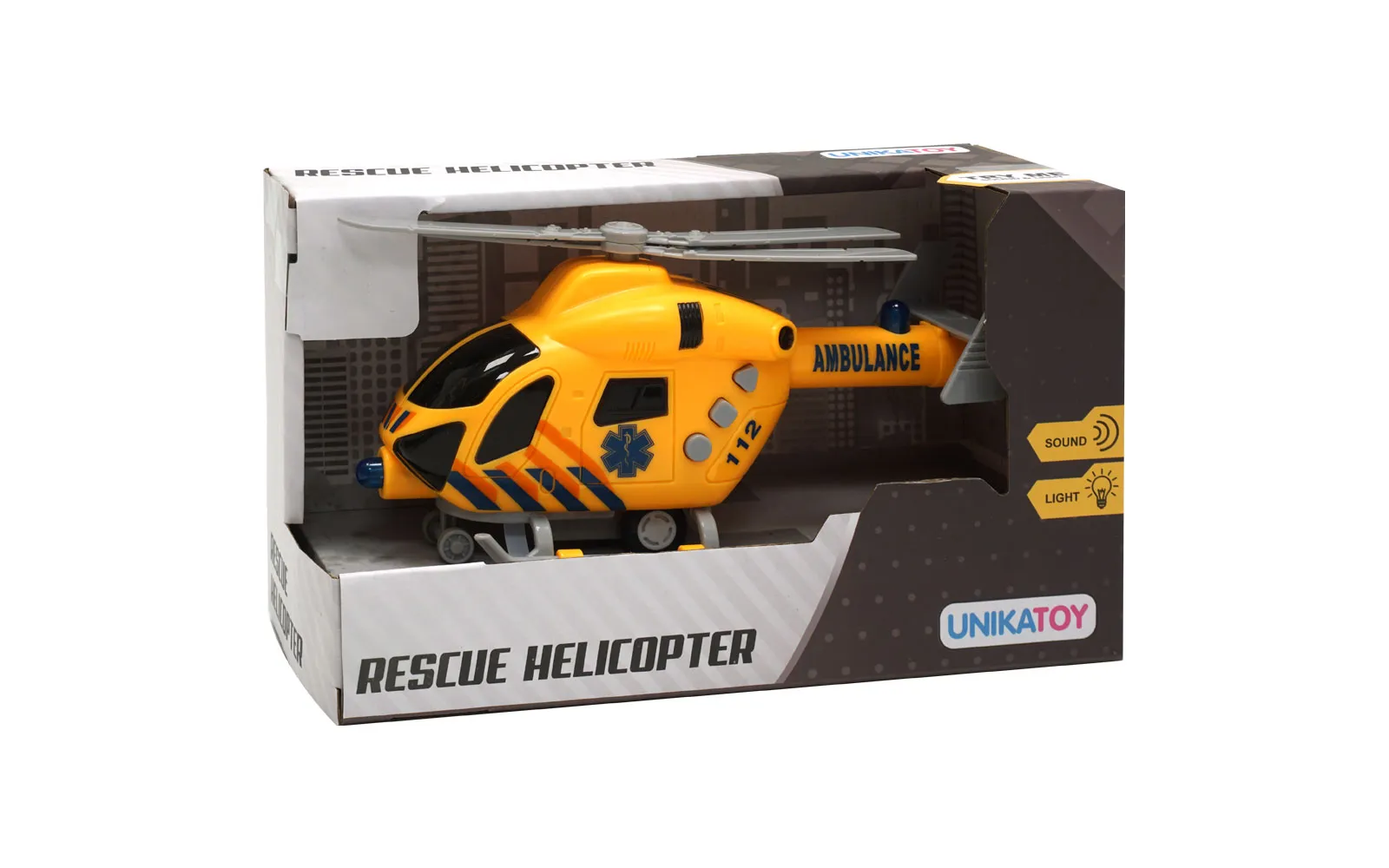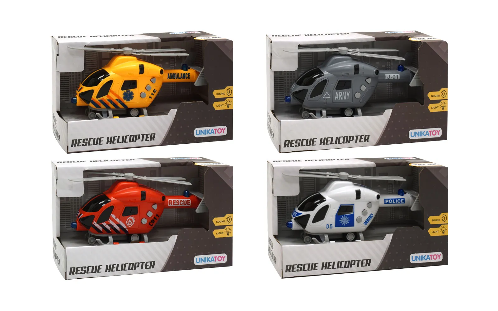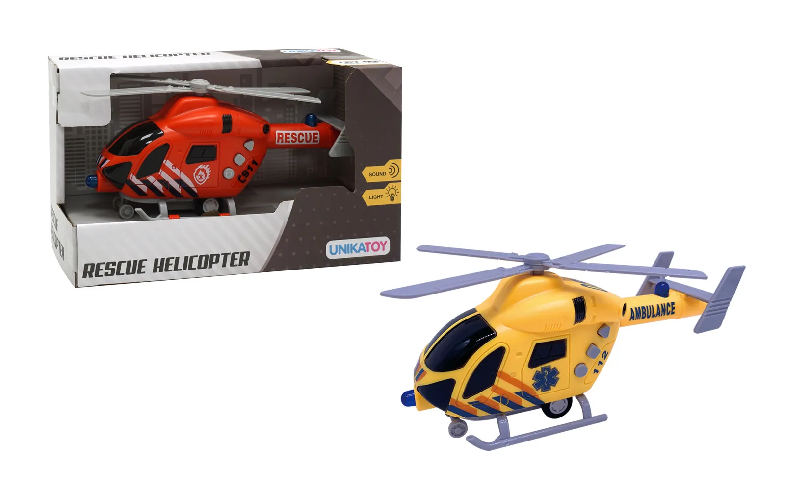 Reševalni helikopter v velikosti 19 cm, z zvokom in lučmi, priznane blagovne znamke Unikatoy. Na voljo v 4 različnih stilih. Igrača je primerna za otroke od 3. leta starosti dalje.