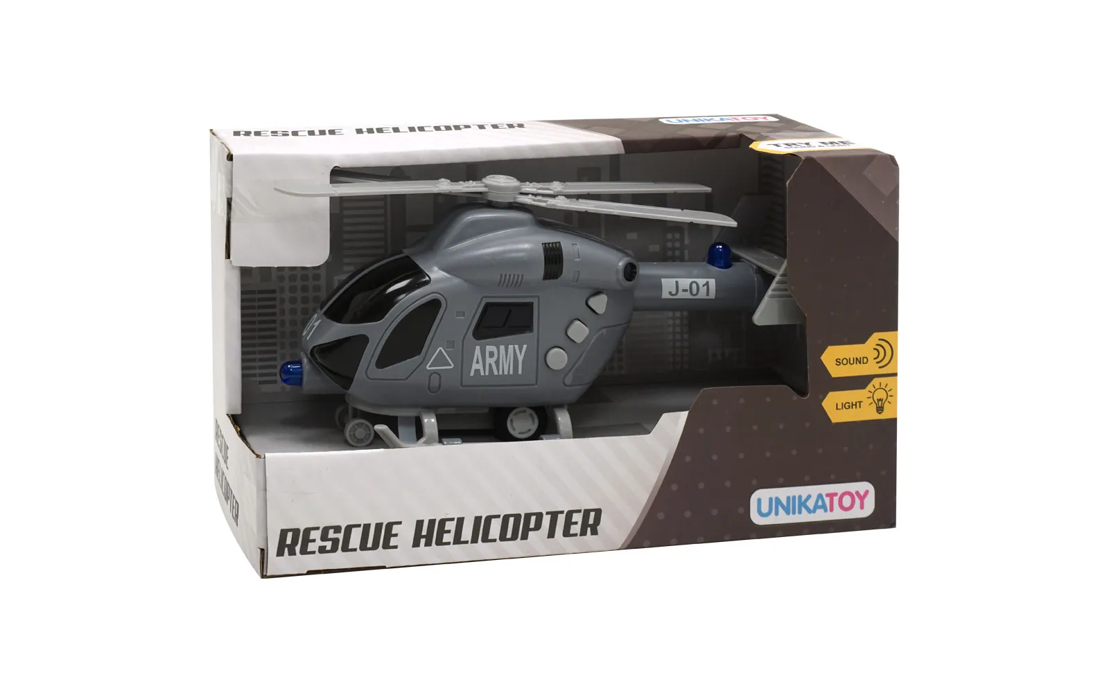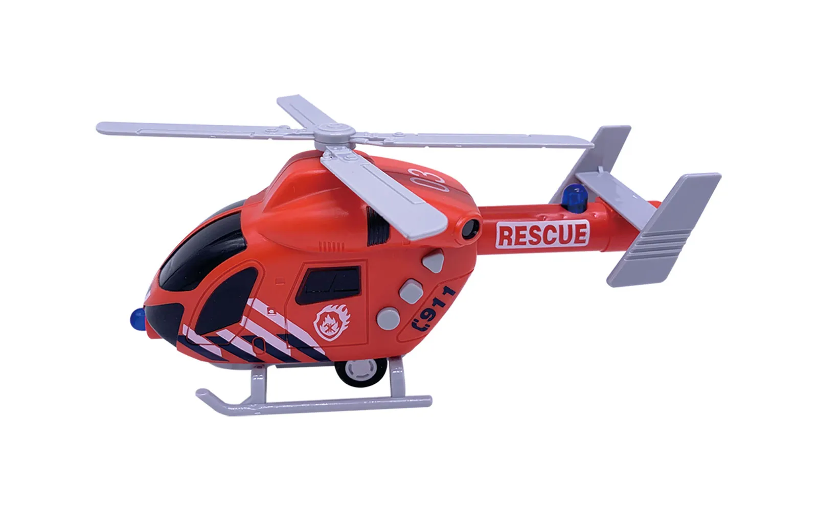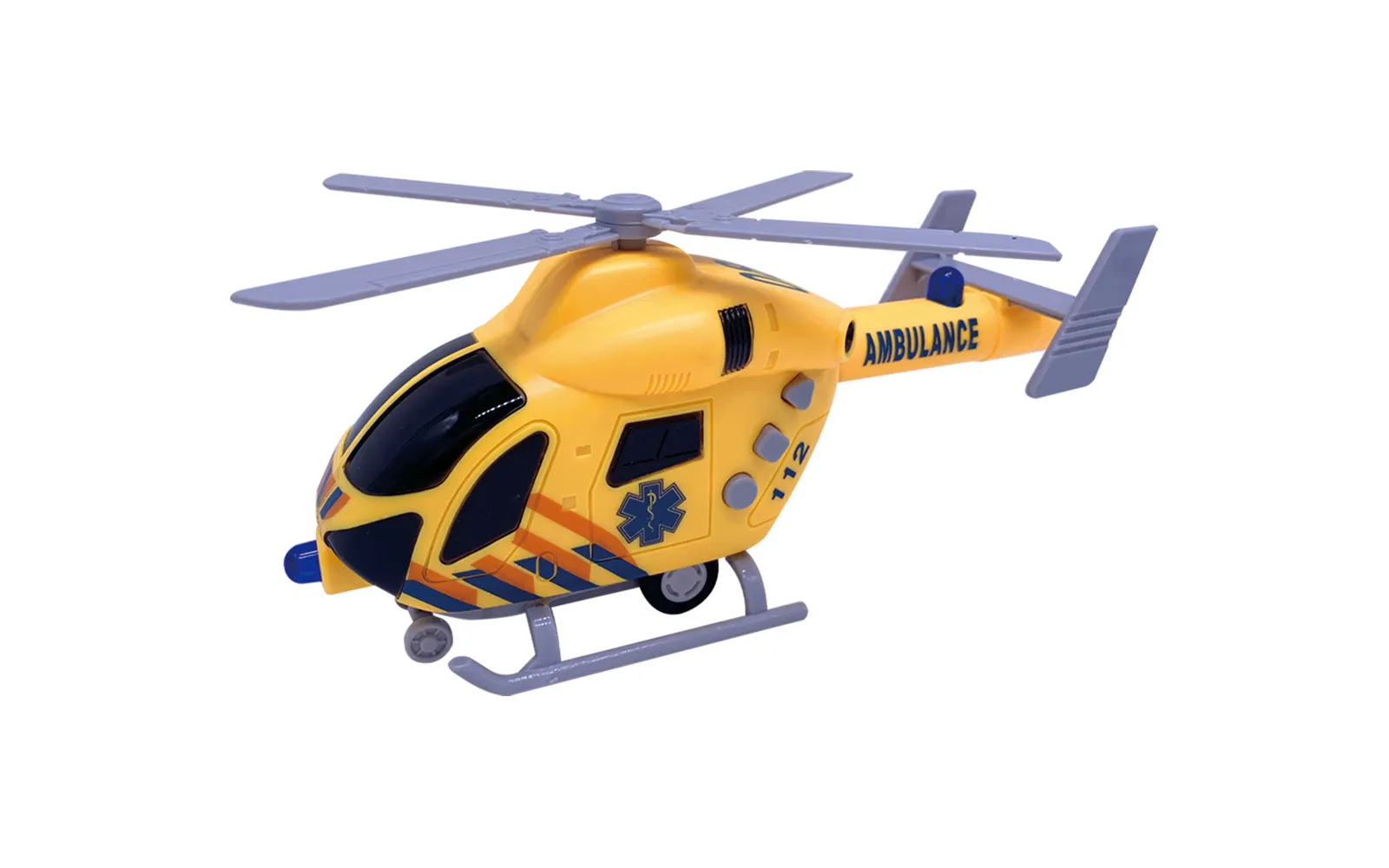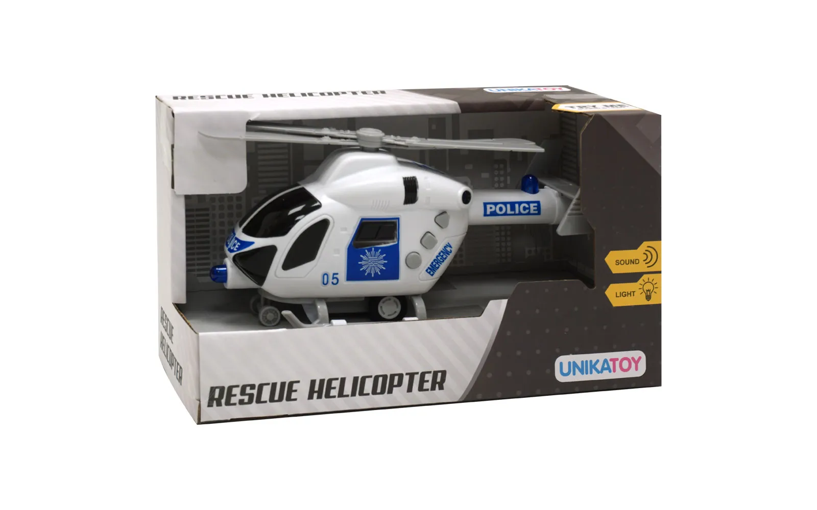 Reševalni helikopter v velikosti 19 cm, z zvokom in lučmi, priznane blagovne znamke Unikatoy. Na voljo v 4 različnih stilih. Igrača je primerna za otroke od 3. leta starosti dalje.