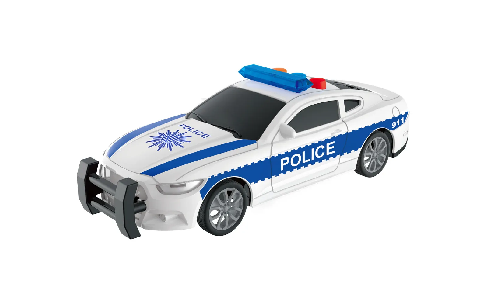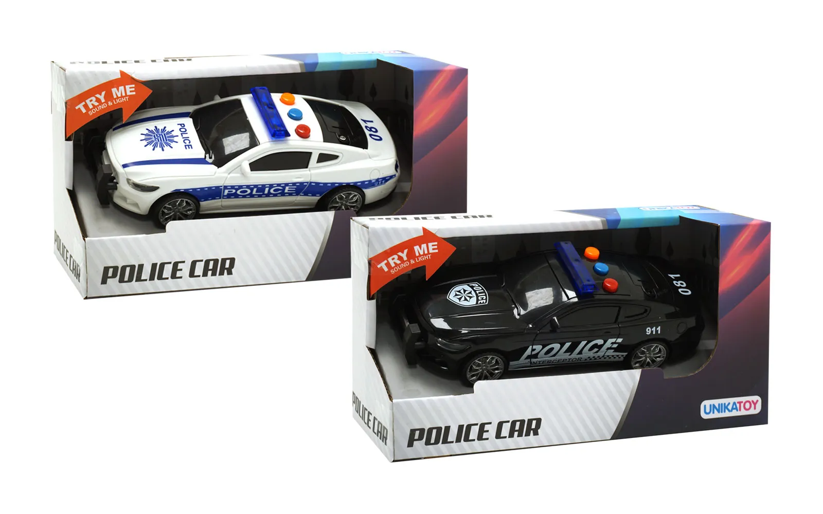 Policijski avtomobilček v velikosti 17 cm z zvokom in svetlobnimi efekti. Na voljo v dveh stilih.