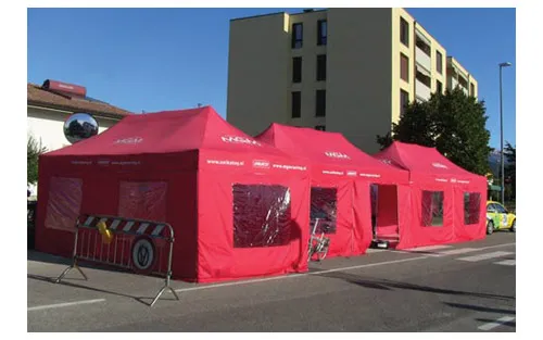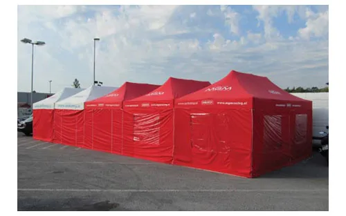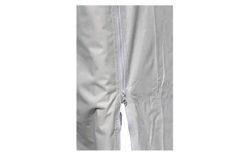 Bela stranica tende velikosti 3 m s stilnim oknom narejena iz 230 g poliestra s PU in srebrnim UV premazom, je ognjevarna in vodoodporna.