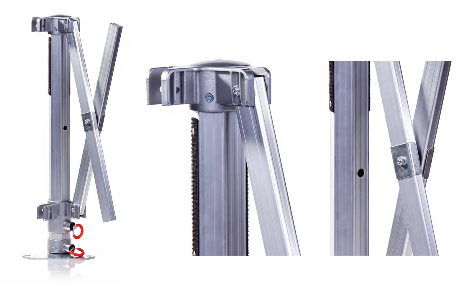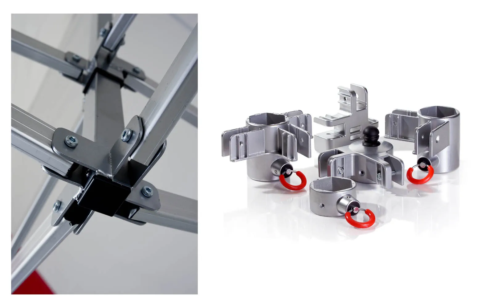Ogrodje za Paviljon Tendo Gazebo 3×3x3m s palicami iz aluminija debeline 50x50mm je hitro sestavljivo in zložljivo. Zahvaljujoč harmonika sistemu kovinskih palic je postavljeno in pospravljeno v le nekaj minutah. Njegova lahka in kvalitetna zasnova je zelo priročna pri transportu na različne lokacije. Konstrukcija ogrodja je iz aluminija debeline 50x2mm, strešna konstrukcija je prav tako izdelana iz aluminija debeline 35x18x1.8mm. Ogrodje je nastavljivo na 5 stopenj višine (maks. 2,2m) in ima zaščitni sistem proti poškodbam. Spoji so iz lite zlitine in kvalitetnega najlona (opcijsko) kar omogoča gladko drsenje pri postavljanju. Priloženi so eloksirani samozaporni vijaki, vijaki in matice, prav tako tudi kovinski zatiči in najlonske palice. Za enostaven transport zraven dobite še priročno torbo na kolesih, ki je na zadrgo in ima ročaje.
